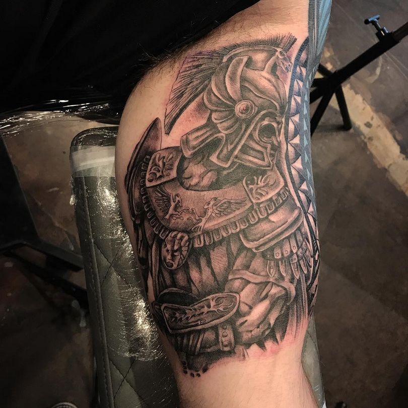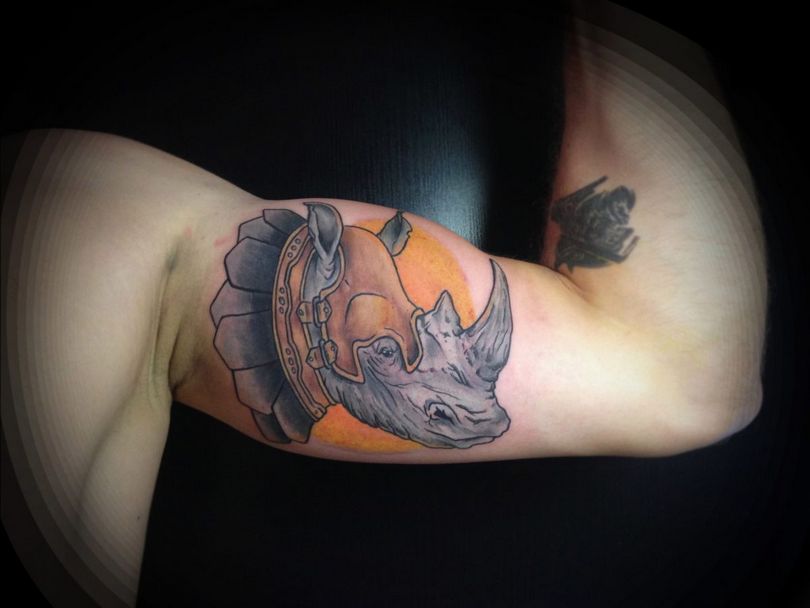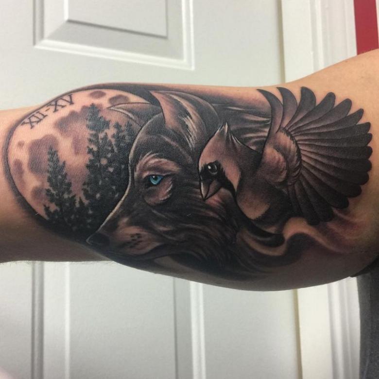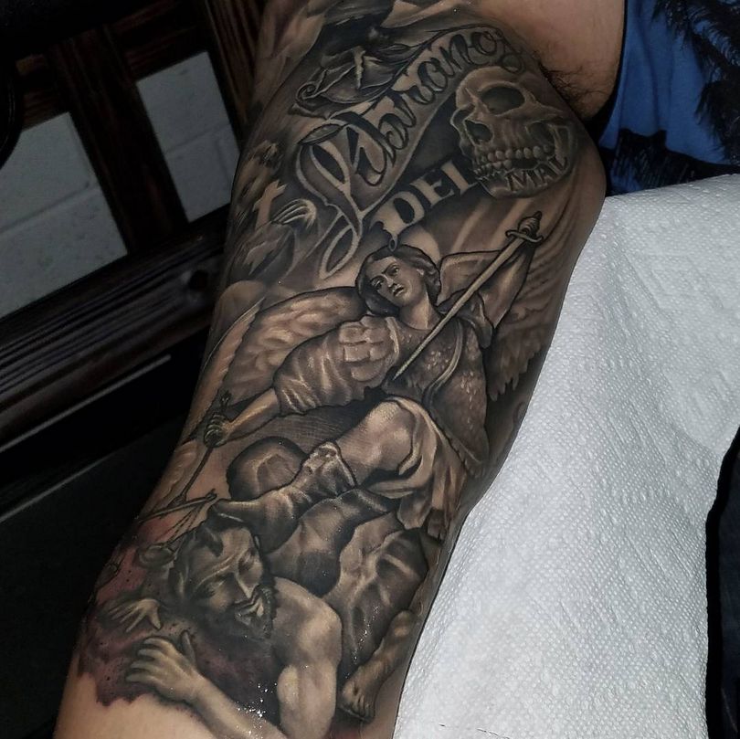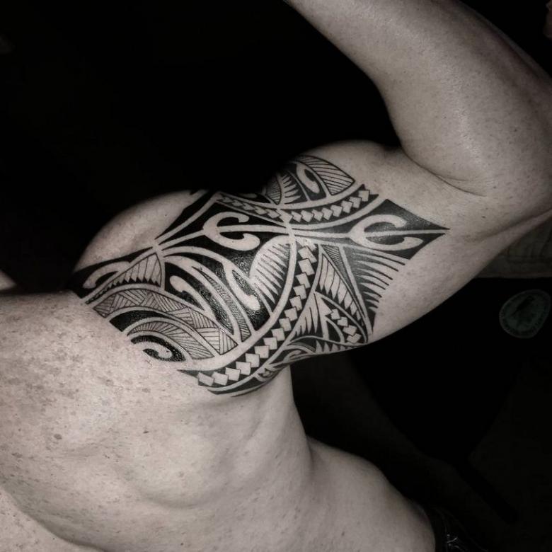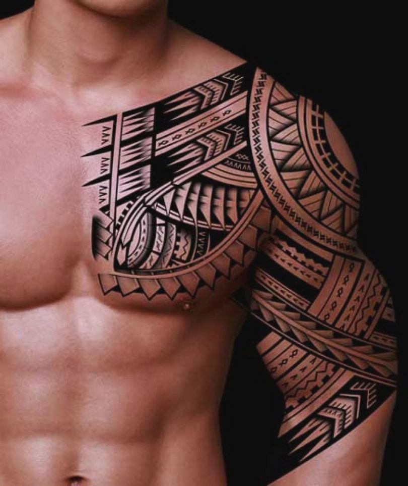 Un dessin de tatouage sur le biceps peut aller au-delà de cette partie du corps. Ceci est pertinent lorsque l'échelle de l'ornement est monumentale et que la composition nécessite une transition vers la poitrine, l'omoplate ou le torse.
