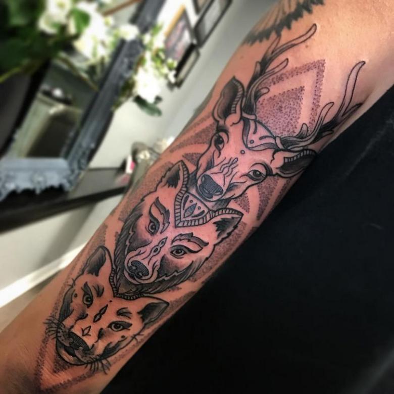 Des dessins animaliers. Il peut s'agir de véritables animaux, prédateurs et agressifs, comme un lion, un loup, un tigre, un requin ou un serpent. Des créatures mythiques telles que des hydres, des licornes et des dragons sont également représentées sur les biceps.