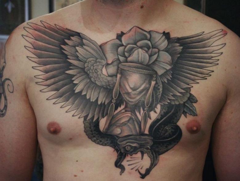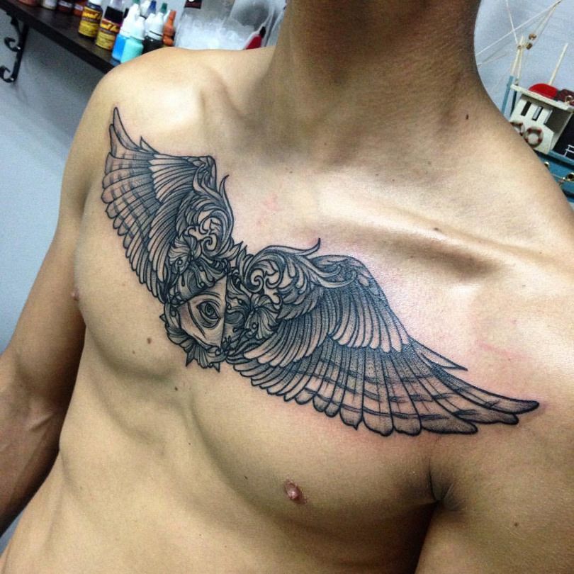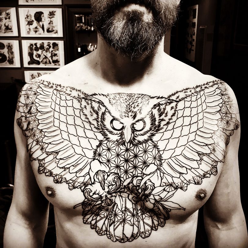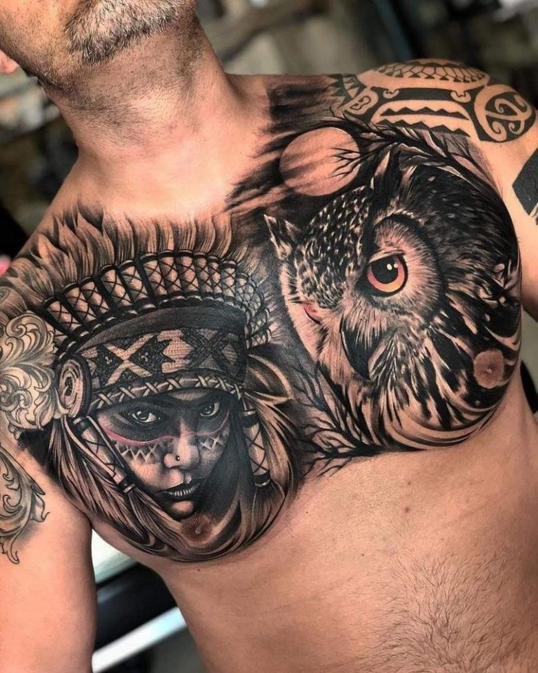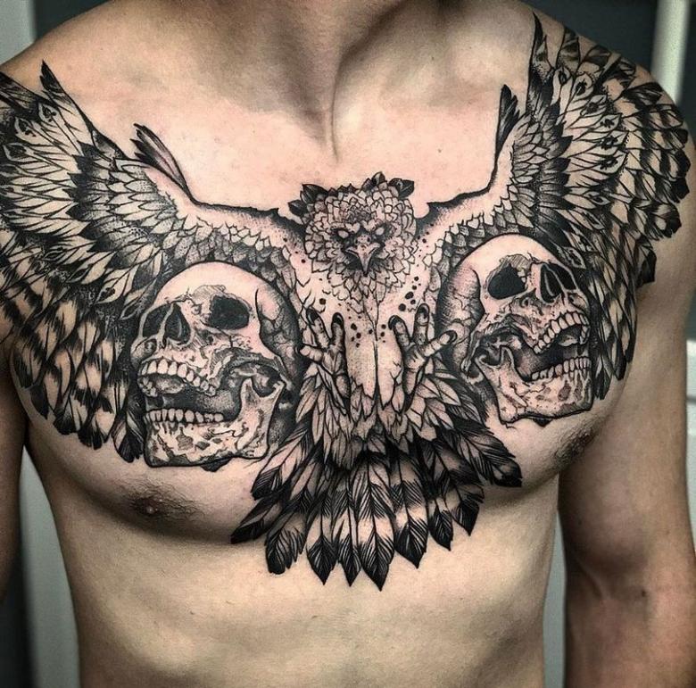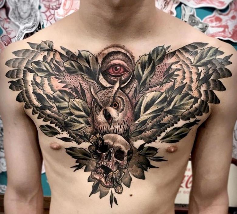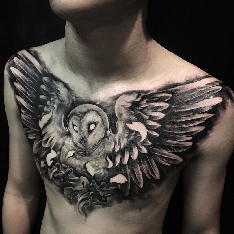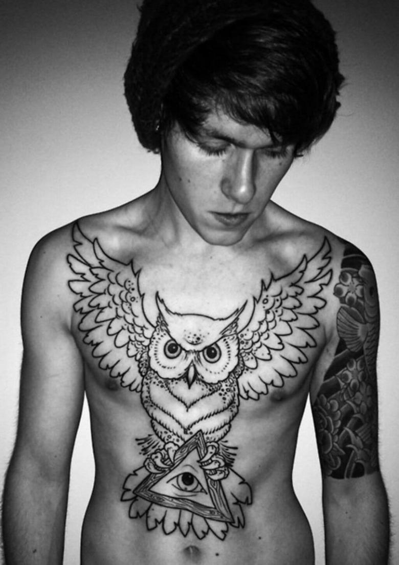 Beaucoup pensent que l'oiseau le plus populaire pour un tatouage masculin sur la poitrine est l'aigle. Cependant, ce n'est pas tout à fait vrai, car ce rapace est en effet souvent représenté sur la poitrine du sexe fort. Mais la chouette l'a dépassé en popularité, car elle possède des qualités uniques qui traduisent parfaitement la charge sémantique associée au propriétaire. Cette image est privilégiée par les hommes qui travaillent de nuit ou qui sont actifs pendant les heures nocturnes de la journée.