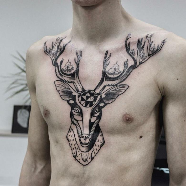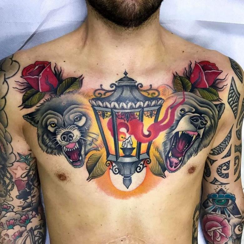 Le tatouage sur la poitrine pour les hommes a toujours été considéré comme une excellente option en tant que talisman ou amulette. Il recouvre presque tous les organes importants : poumons, cœur et agit comme un bouclier contre toutes sortes de dangers. Les guerriers de l'Antiquité croyaient en ses vertus. Ils attaquaient courageusement l'ennemi, car la parure corporelle correspondante leur inspirait une confiance supplémentaire dans le succès de la bataille.