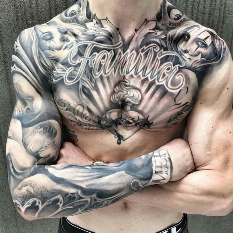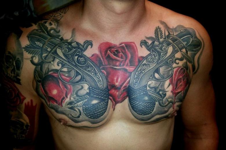 De nombreuses photos de tatouages sur la poitrine pour hommes sont publiées sur Internet, car elles jouissent d'une popularité sans précédent. La demande oblige les artisans à créer de nouvelles options pour répondre à la demande des hommes. Pourquoi les hommes aiment couvrir leurs seins avec des bijoux :