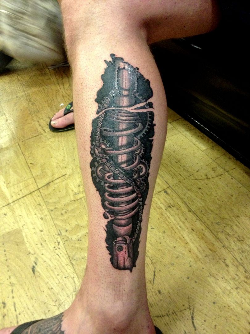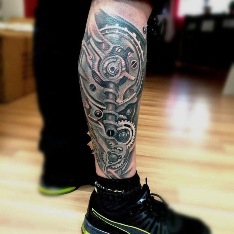 Il est intéressant de décrire séparément ce qui est à la mode en ces jours de tatouages - la biomécanique. Son idée sémantique est d'intégrer l'homme et la machine. La jambe elle-même est un dispositif mécanique naturel. L'imagination de la personne est utilisée pour développer cette idée via le tatouage.