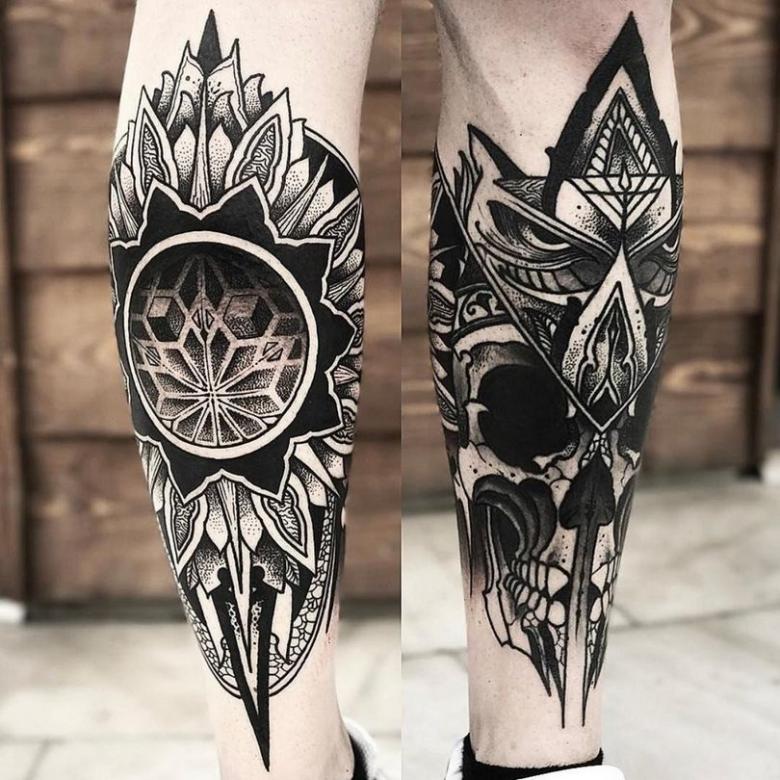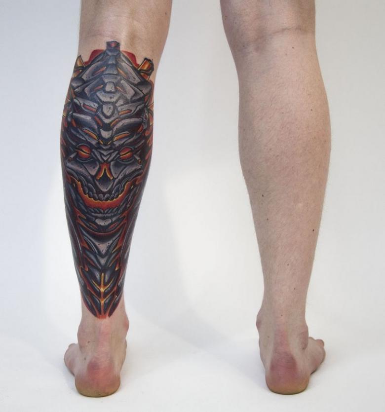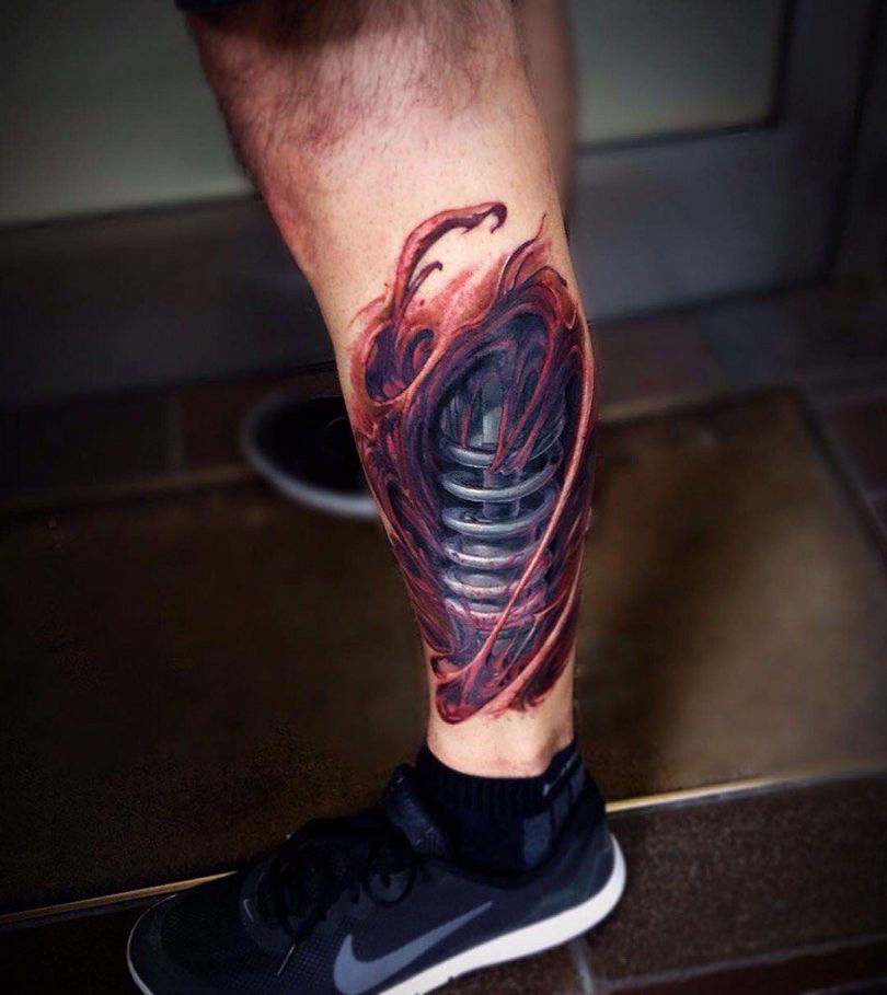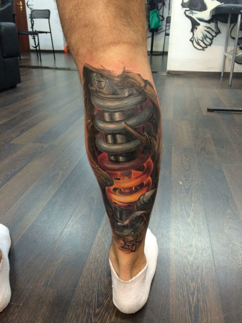 Une surface de peau suffisamment grande pour permettre un tatouage à grande échelle. La rondeur des mollets est une excellente base pour les dessins tridimensionnels et les compositions en 3D. Les veaux représentent la stabilité d'une personne, son soutien. En même temps, ils ne sont pas dépourvus de dynamique et de mouvement. C'est l'occasion d'aborder un thème de tatouage très populaire aujourd'hui : la biomécanique.