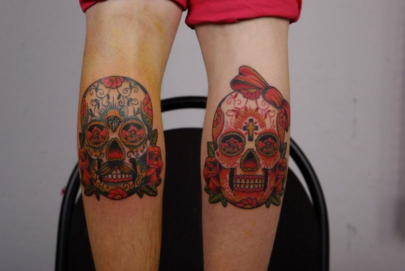 Il y a aussi des classiques inchangés, comme le crâne. Il est souvent associé à des fleurs et à des serpents. Le crâne lui-même est généralement monochrome, tandis que l'image qui l'accompagne peut être en couleur. Parfois, l'image d'accompagnement est représentée dans une teinte criarde, comme le rouge.