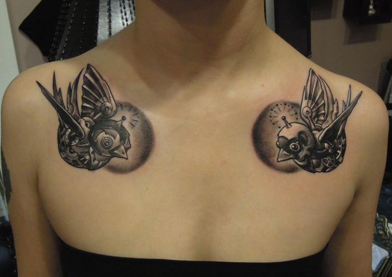 Les tendances modernes disent le contraire - pas besoin de cacher le tatouage, soyez plus audacieux, non conventionnel. Votre objectif est d'être le centre d'attention. Bien qu'aujourd'hui personne ne s'étonne d'un tatouage sur la clavicule ou le cou - c'est un endroit traditionnel pour le tatouage.
