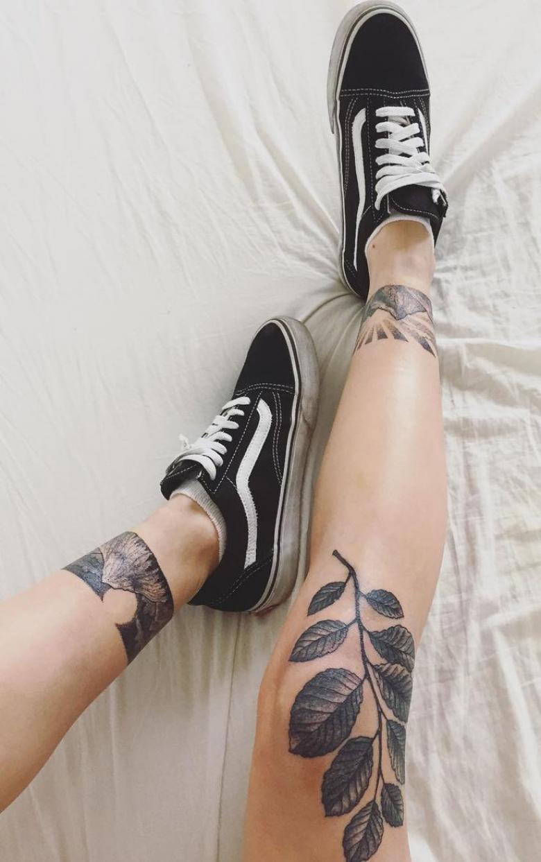 Le tatouage de brindille incurvée le long du tibia avec la fleur sur le genou est spectaculaire, il allonge et affine visuellement la jambe.