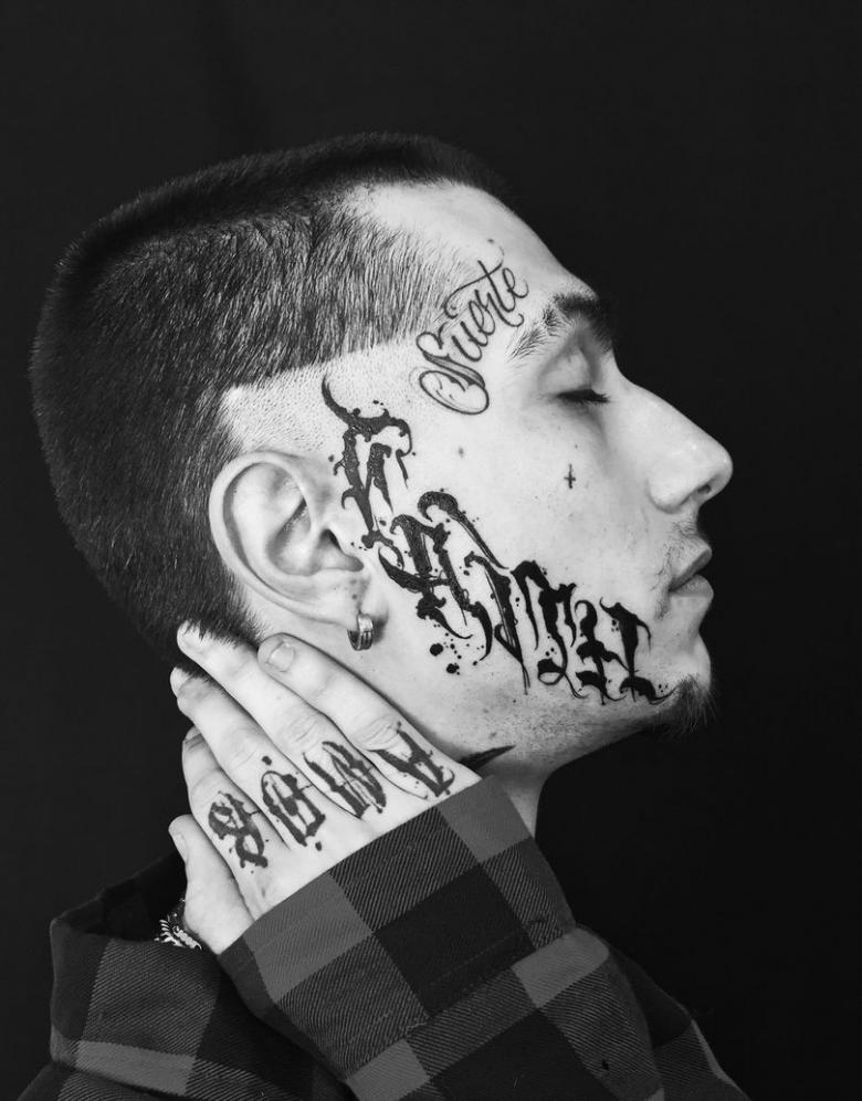- Inscriptions. Des phrases courtes le long des pommettes ou au-dessus des sourcils. L'un des types de tatouages faciaux les plus populaires. Les inscriptions faciales conviennent à tout le monde, et pour les rappeurs populaires, elles semblent être devenues un attribut indispensable.