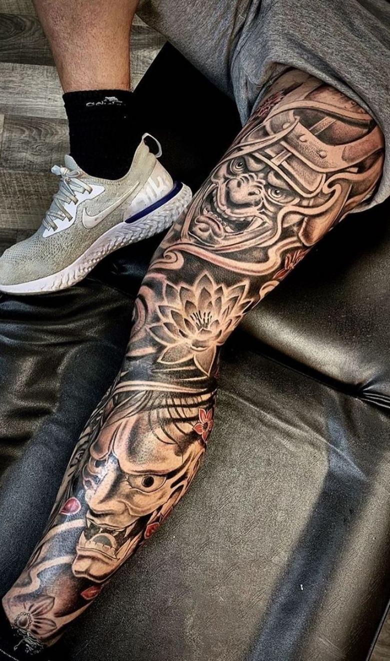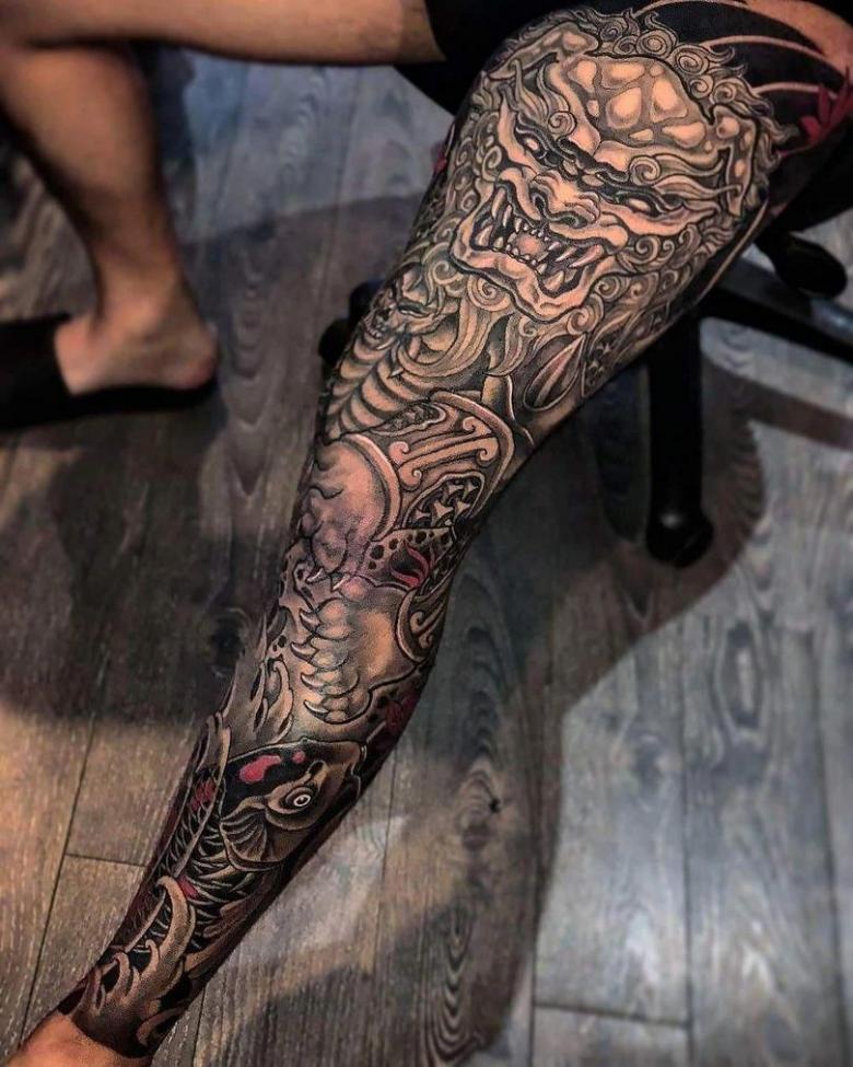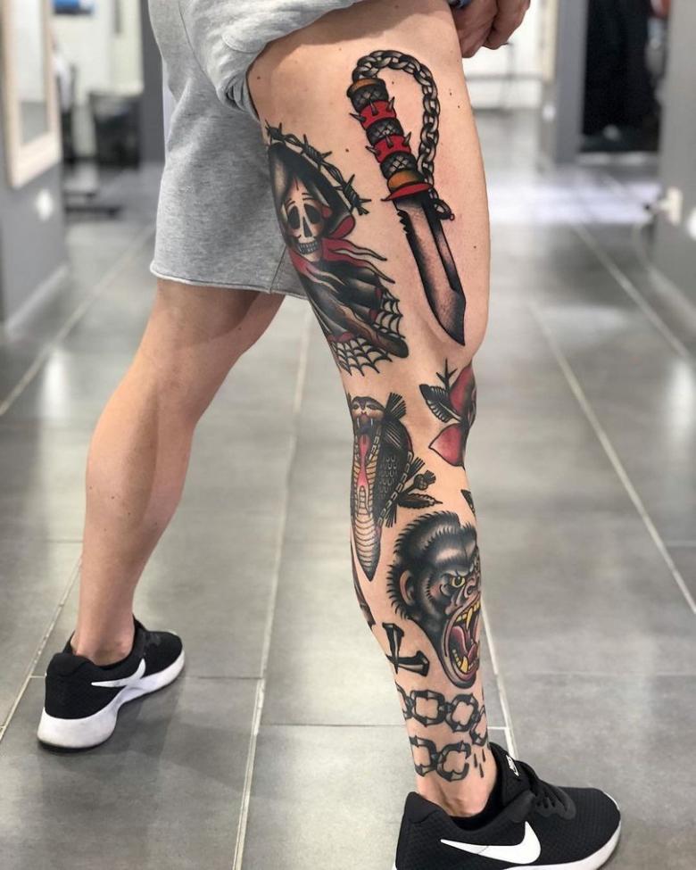Les hommes choisissent différents styles pour un tatouage sur la jambe. Les plus populaires sont :