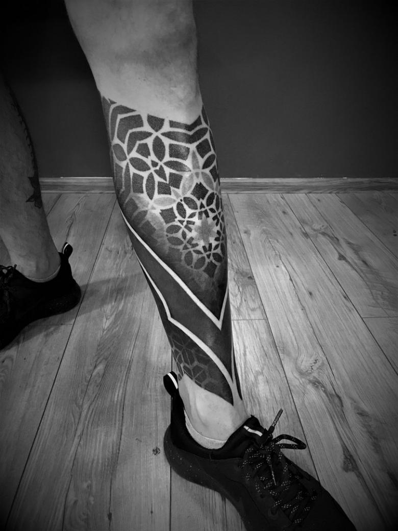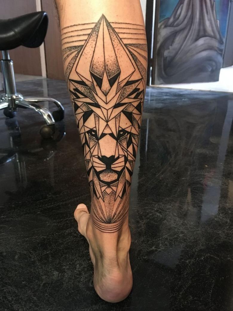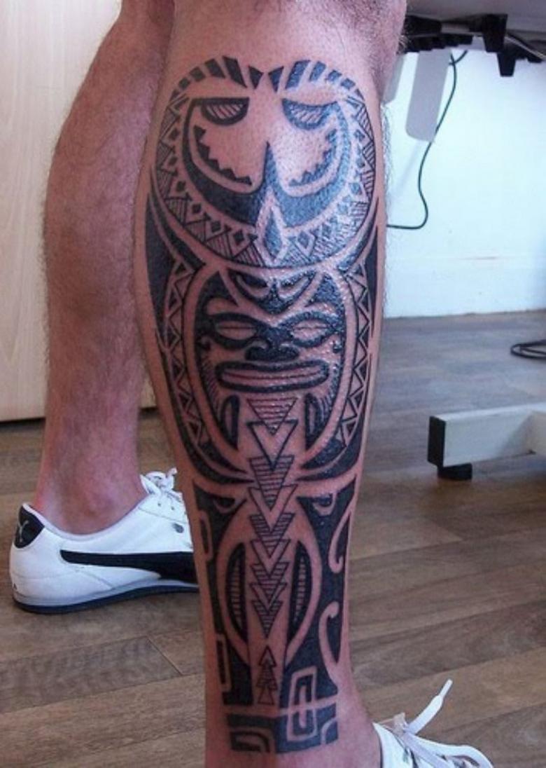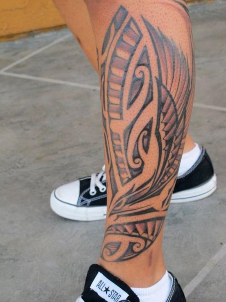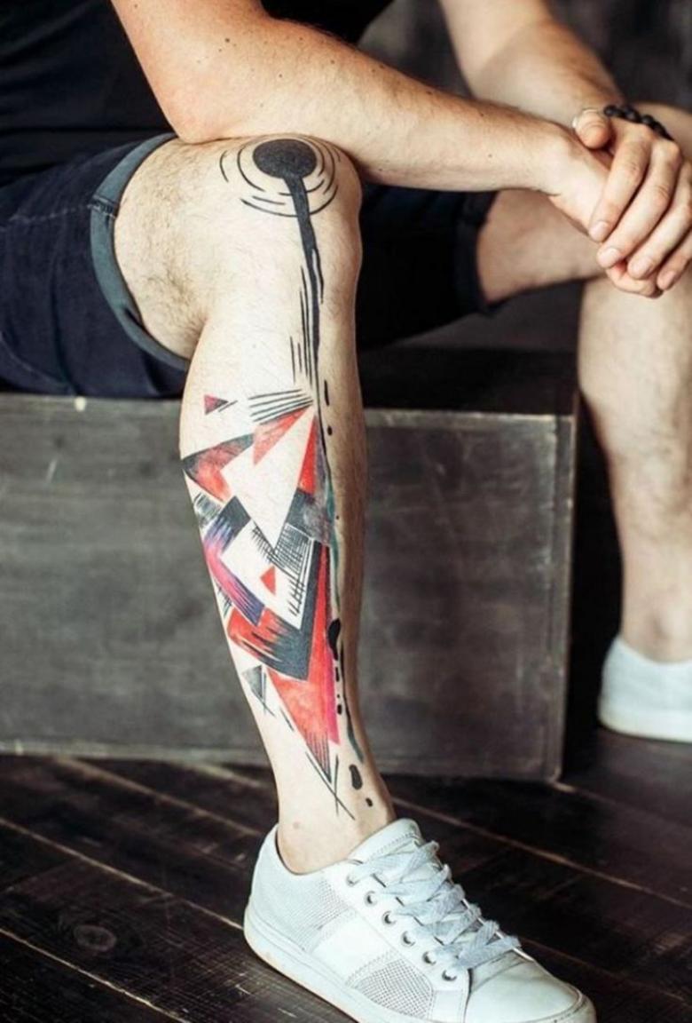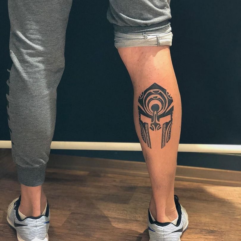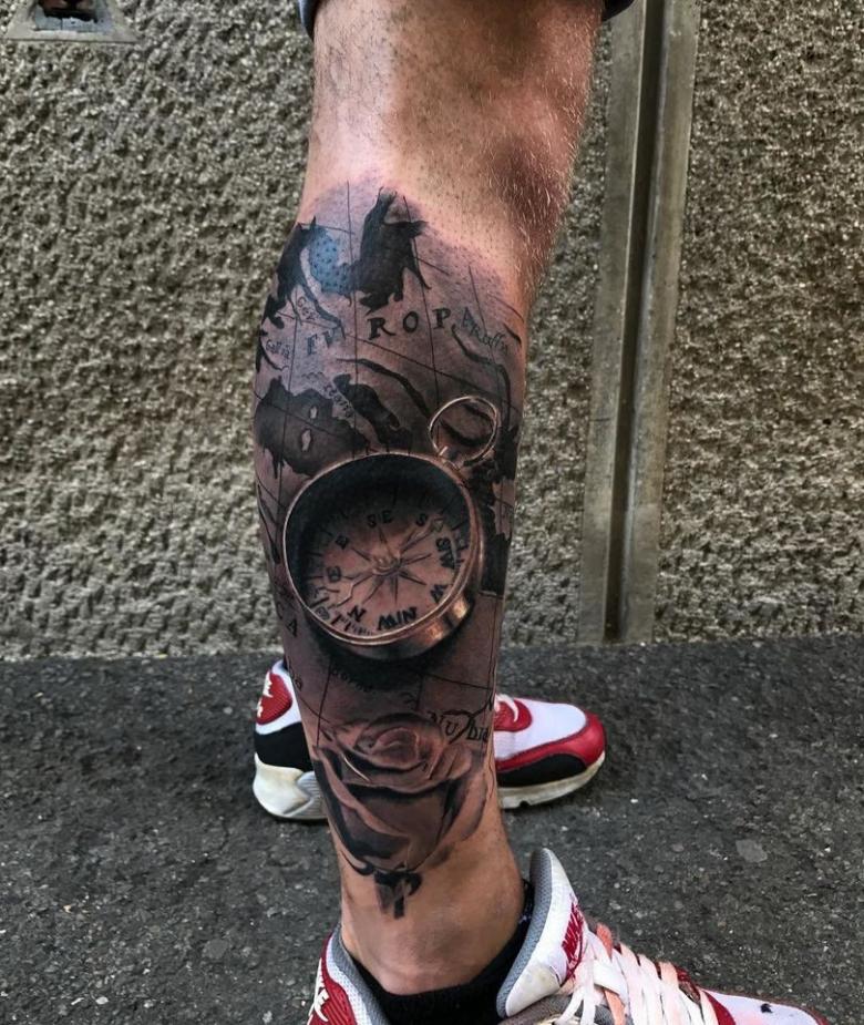 Comme pour la cuisse, il n'y a aucune douleur à être tatoué sur le tibia. Le plus souvent, les hommes optent pour un tatouage de mollet. Le design est esthétiquement plaisant grâce à la surface arrondie et lisse de l'endroit et conserve longtemps son aspect primaire.