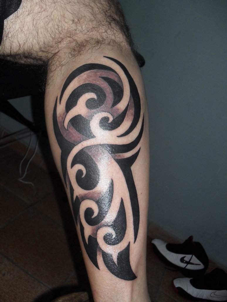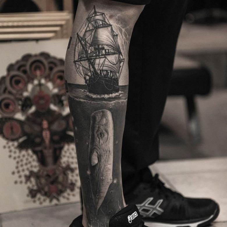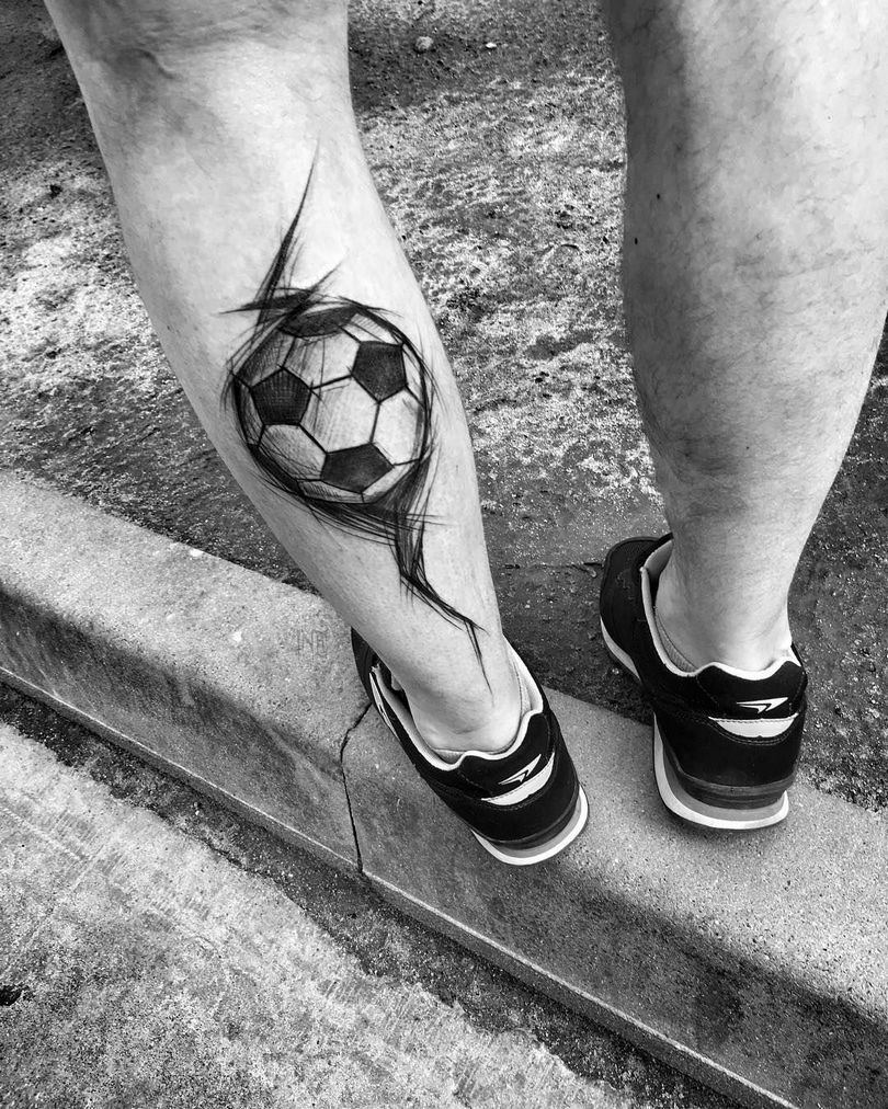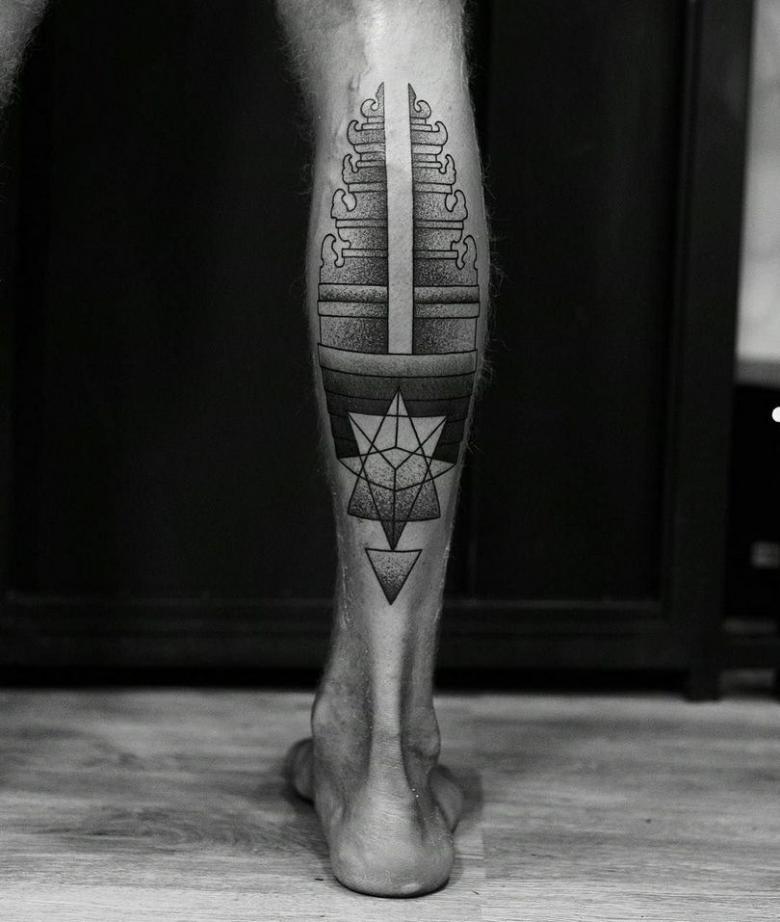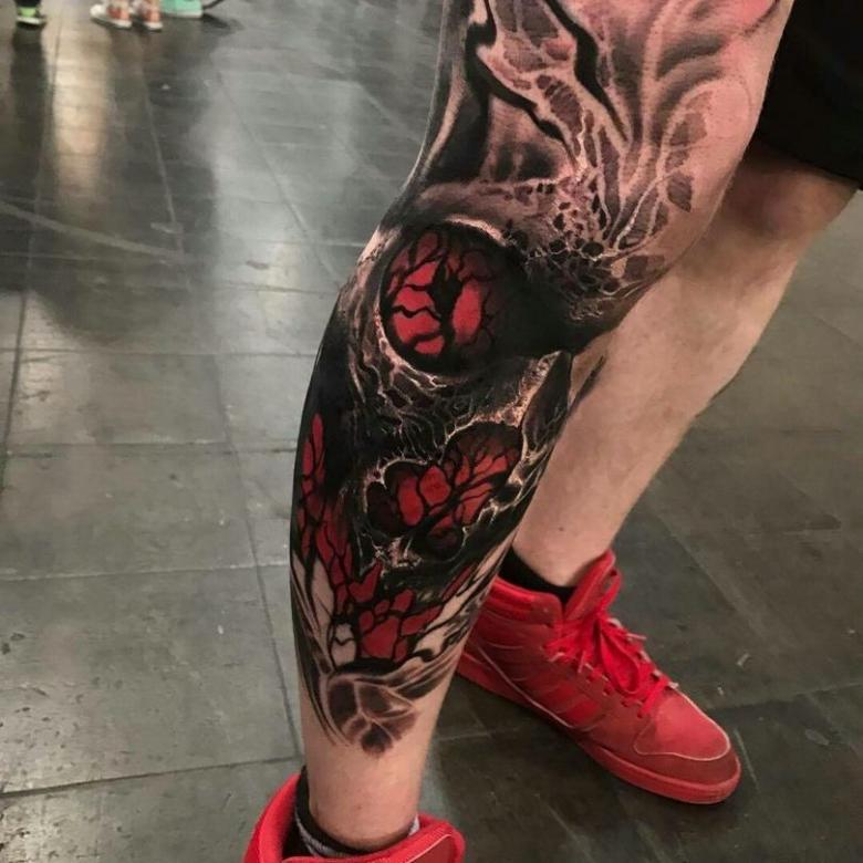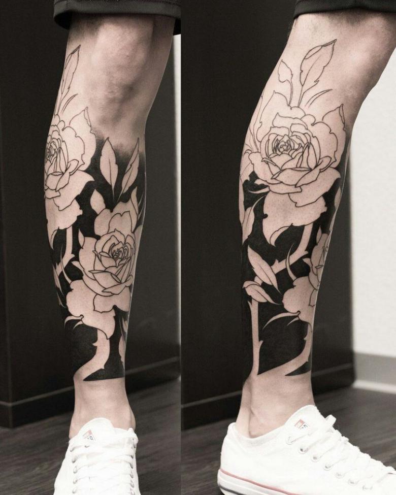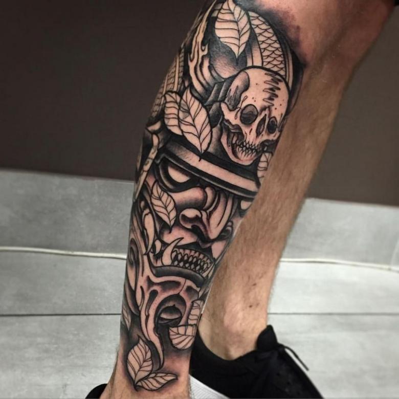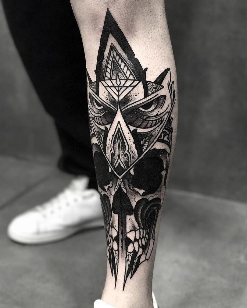 Comme pour la cuisse, il n'y a aucune douleur à être tatoué sur le tibia. Le plus souvent, les hommes optent pour un tatouage de mollet. Le design est esthétiquement plaisant grâce à la surface arrondie et lisse de l'endroit et conserve longtemps son aspect primaire.