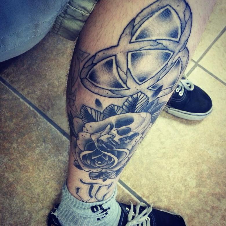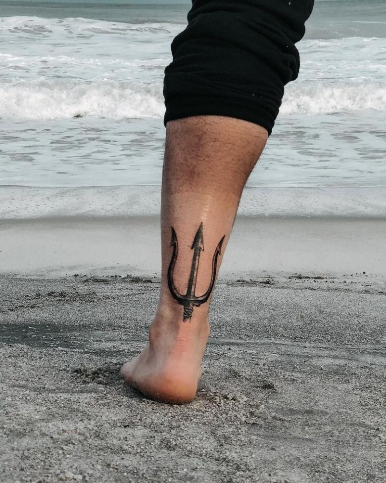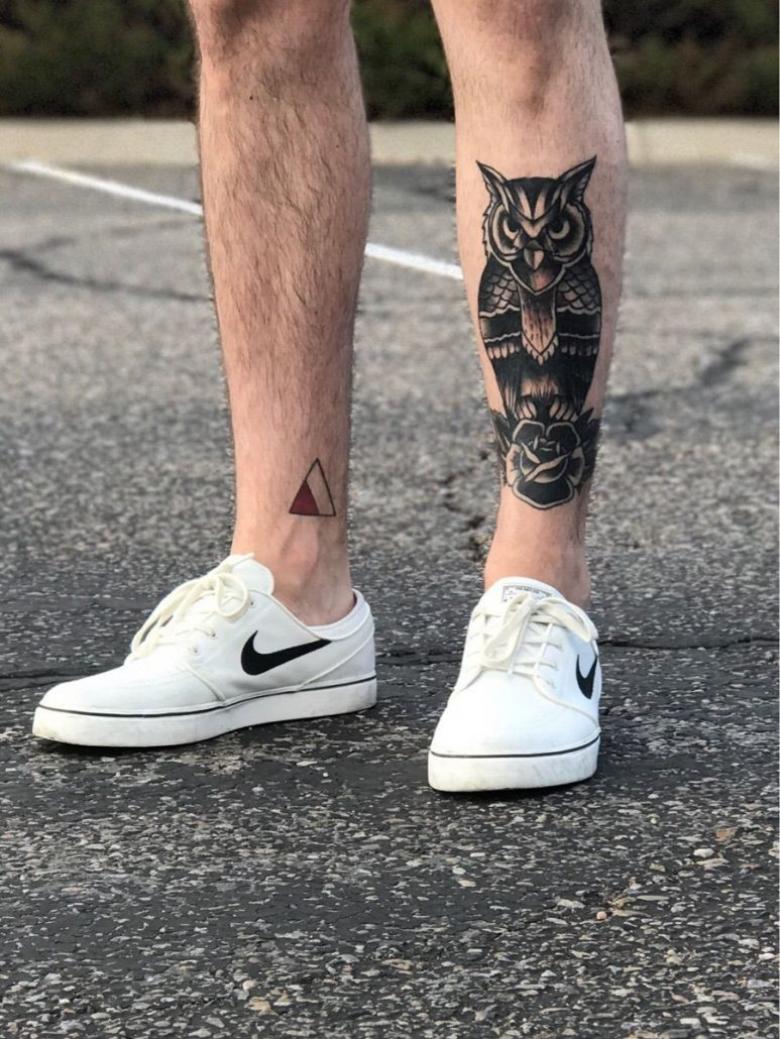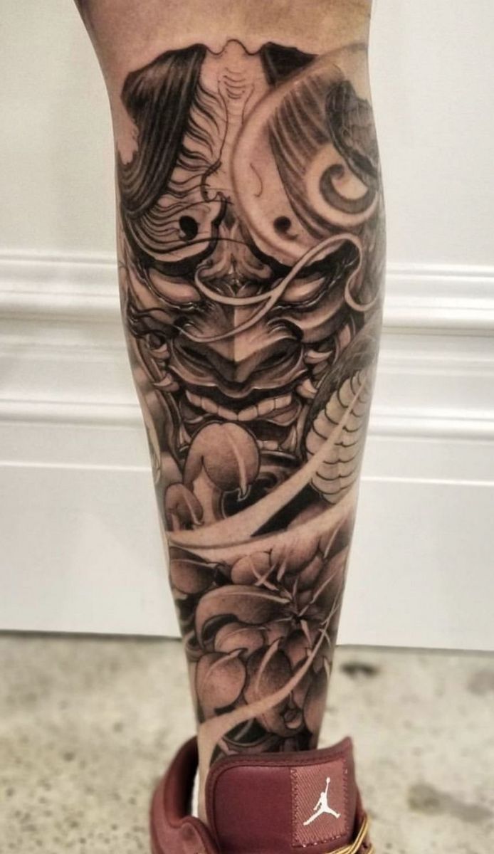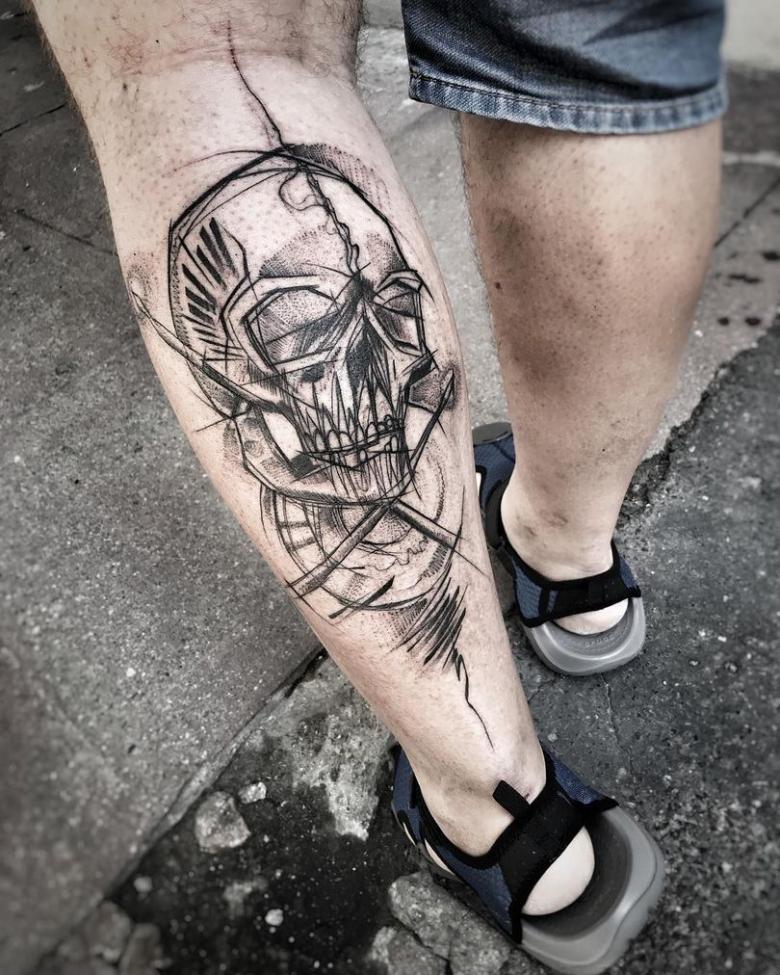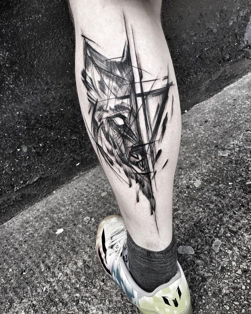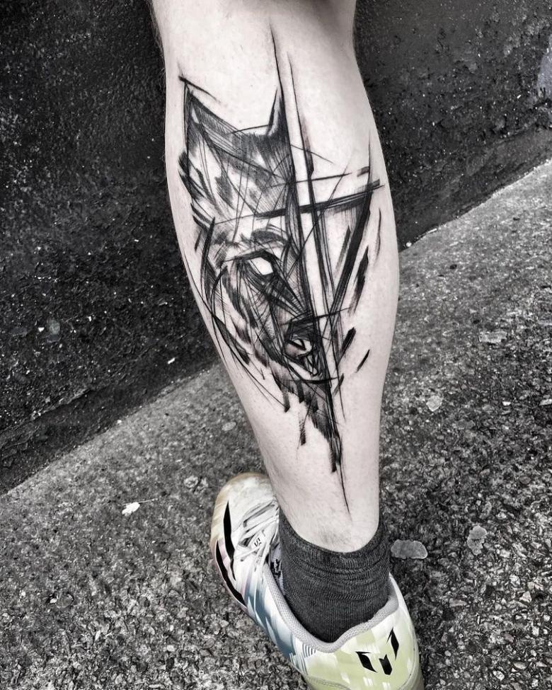 Comme pour la cuisse, il n'y a aucune douleur à être tatoué sur le tibia. Le plus souvent, les hommes optent pour un tatouage de mollet. Le design est esthétiquement plaisant grâce à la surface arrondie et lisse de l'endroit et conserve longtemps son aspect primaire.