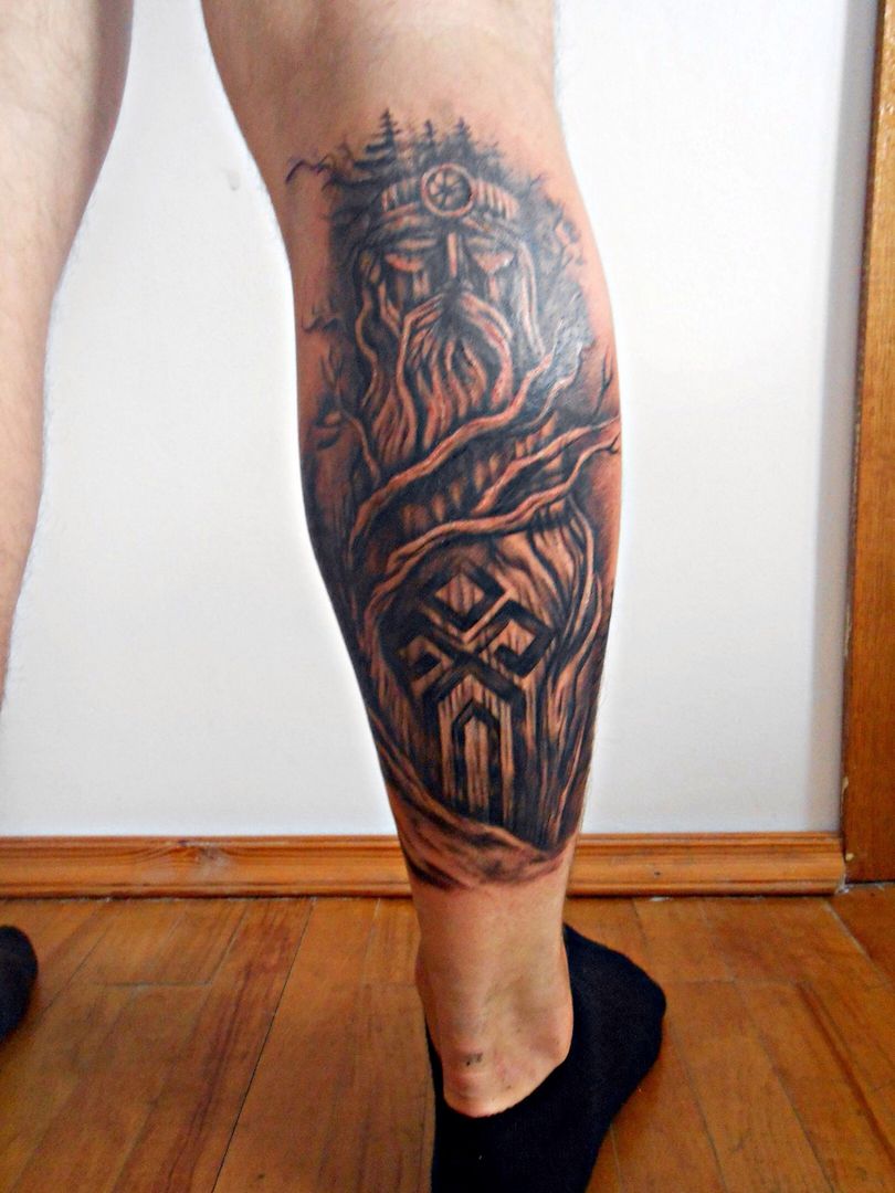 Le choix de ce style convient bien à la superposition de vieux tatouages de mauvaise qualité. La plupart des jambes sont peintes en noir. Le tatouage est battu à grande échelle. Des photos du tatouage provenant de diverses ressources montrent qu'il peut s'agir d'une forêt noire. La moitié de la jambe est remplie de noir et le reste est une image d'épicéas ou d'arbres en transition nette.