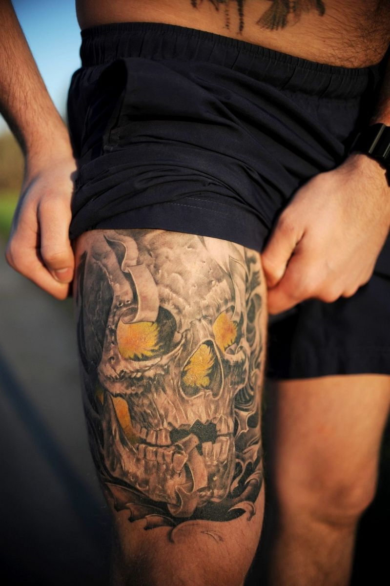 Cet endroit est considéré comme une option féminine pour un tatouage, mais les hommes portent également des images à cet endroit. Un beau et bon design convient bien à une carrure athlétique. Le tatouage est facile à cacher sous les vêtements si nécessaire. L'un des avantages du tatouage de la cuisse est que la procédure de conception par le tatoueur est indolore.
