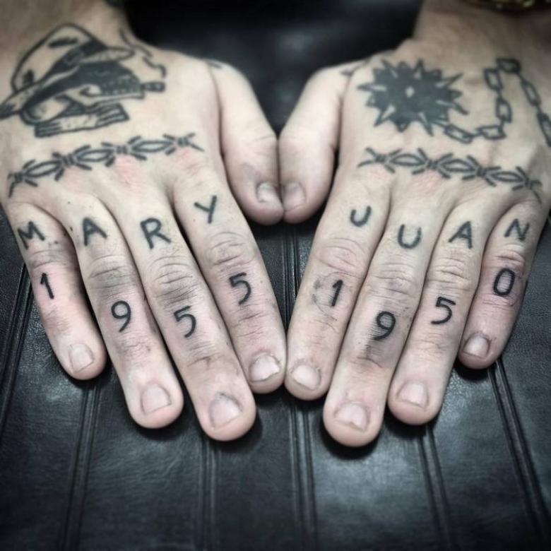 Des chiffres et des dates. Les événements mémorables et les dates importantes dont une personne veut se souvenir à jamais peuvent également être inscrits sur le doigt. Le côté du doigt est souvent utilisé à cette fin, les chiffres arabes sont souvent inscrits, cela a l'air très efficace. Les inscriptions sont souvent apposées sur l'intérieur du doigt.