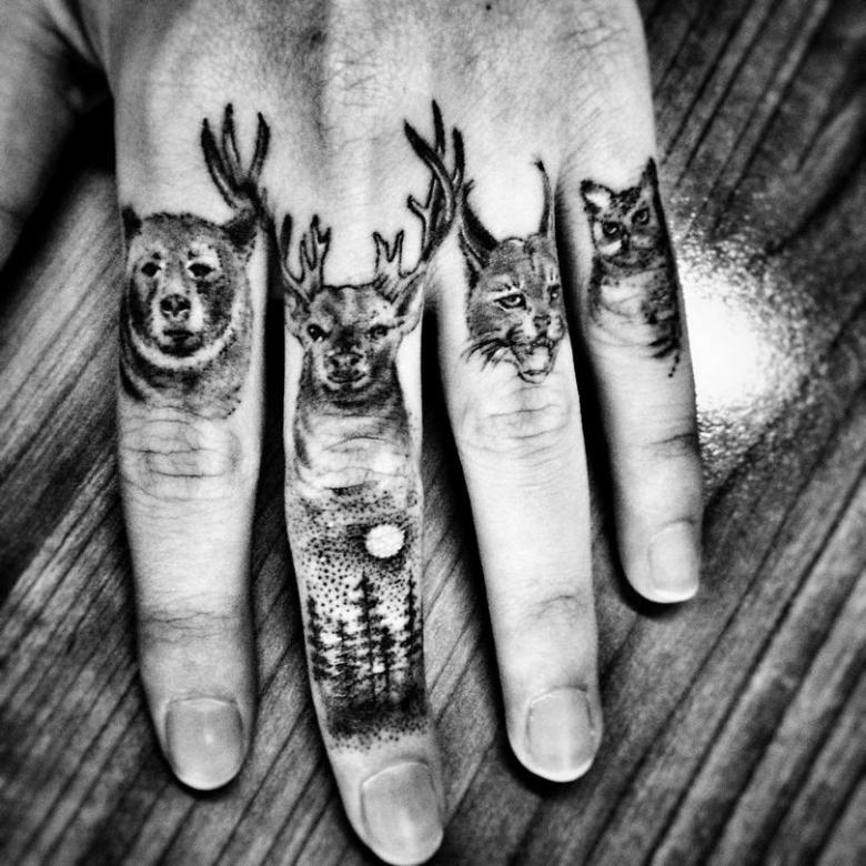 Les animaux. Les images d'animaux sauvages font bien sur les doigts des hommes. Il peut s'agir d'un ours, d'un tigre ou d'un loup. Ils symbolisent la force et la volonté d'attaquer. Ces tatouages donnent confiance à leurs propriétaires et les incitent à l'action.
