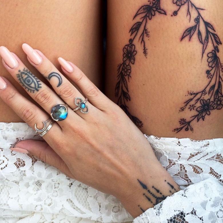 Le motif le plus populaire est considéré comme une fleur. Il peut s'agir d'une rose unique sur une longue tige enroulée autour du doigt, ou d'un bouton avec une tige fine sur la surface extérieure du doigt. Souvent, la fleur est placée sur une seule phalange.