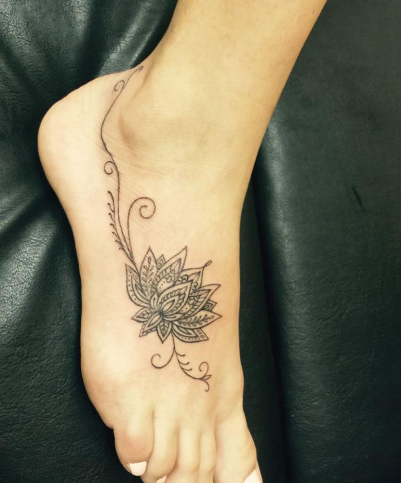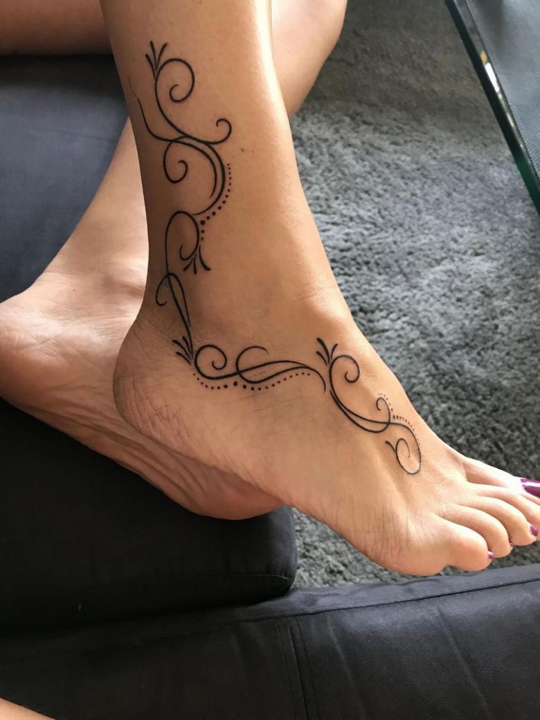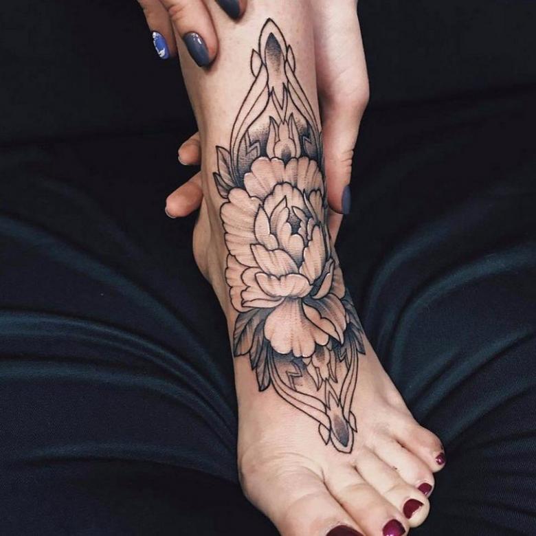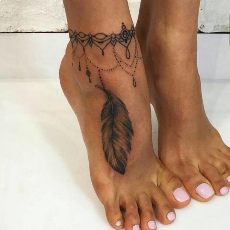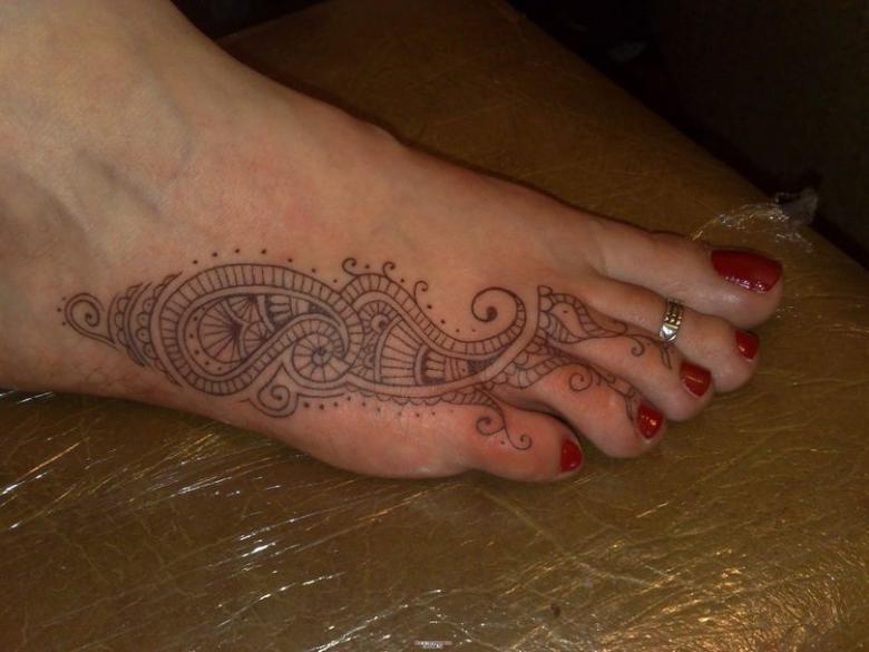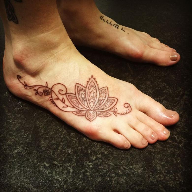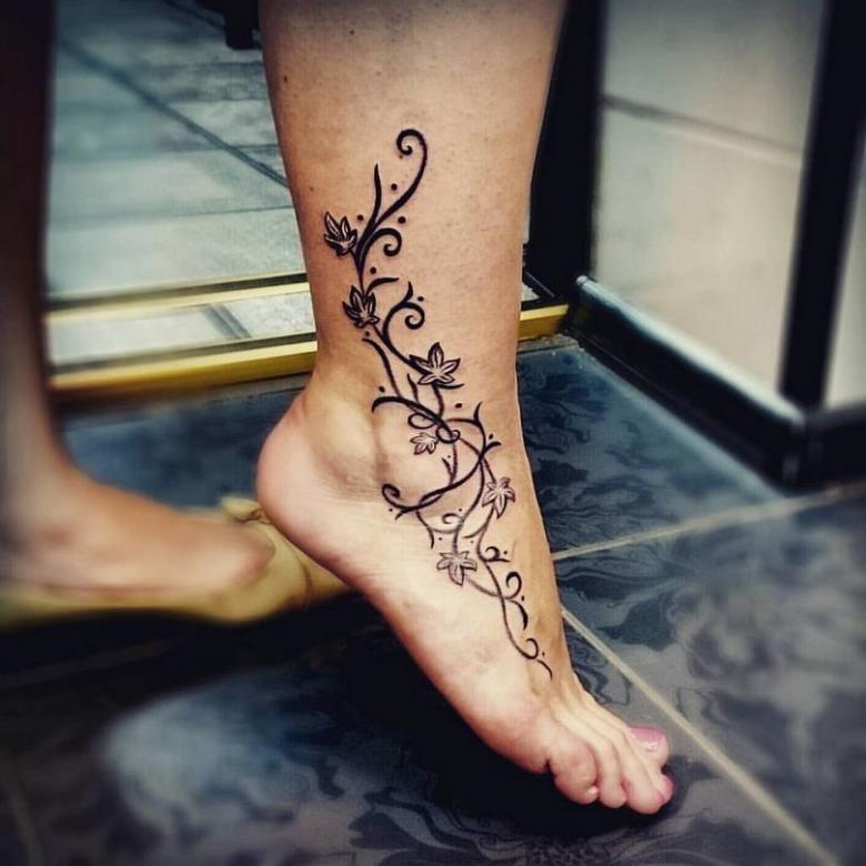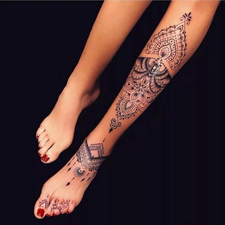Le pied a une petite surface, il est donc difficile d'adapter un grand dessin. Mais il est possible de créer un beau motif où le tatouage progresse du pied au tibia, remonte jusqu'au genou et peut aller jusqu'à la hanche. Le corps d'une femme est beau avec des lignes fluides qui accentuent la beauté de sa silhouette.