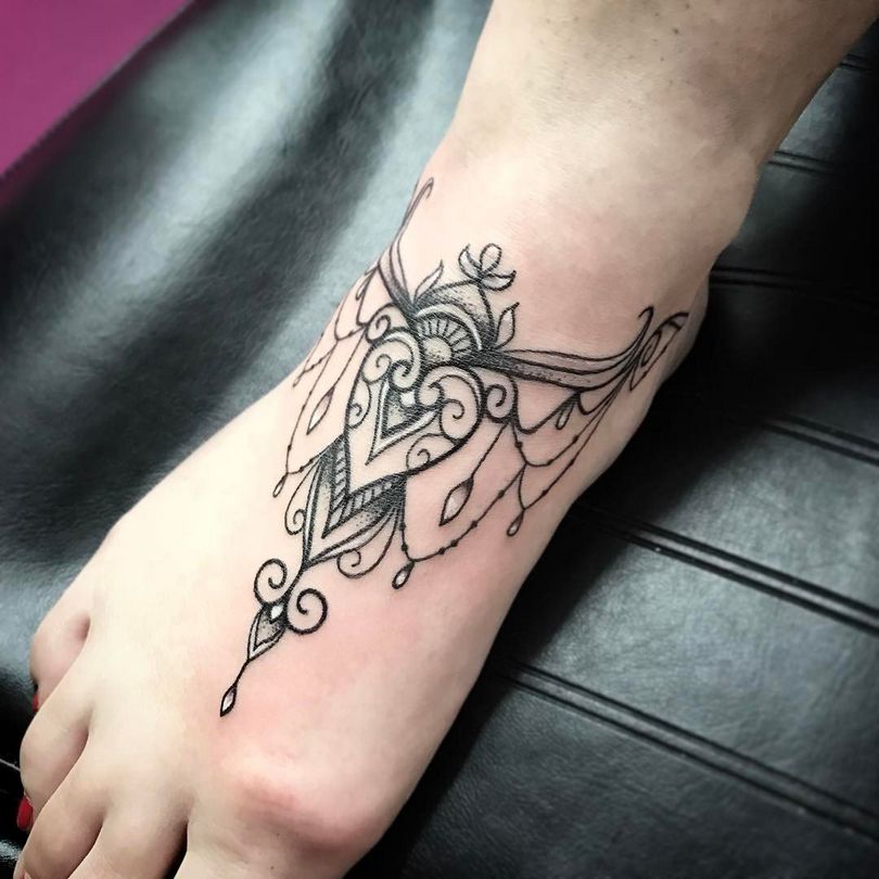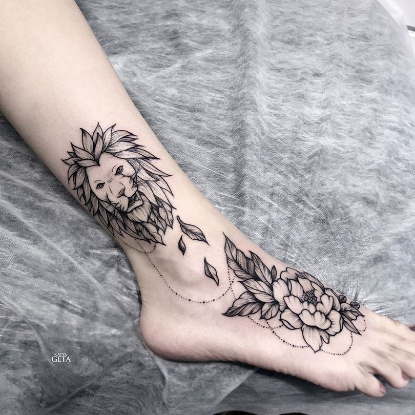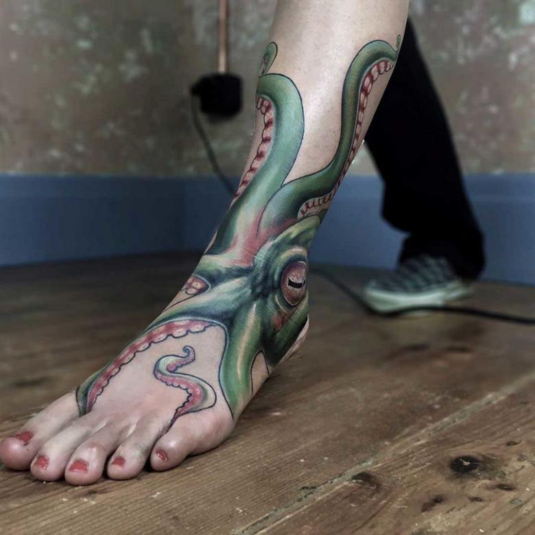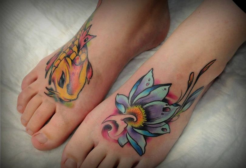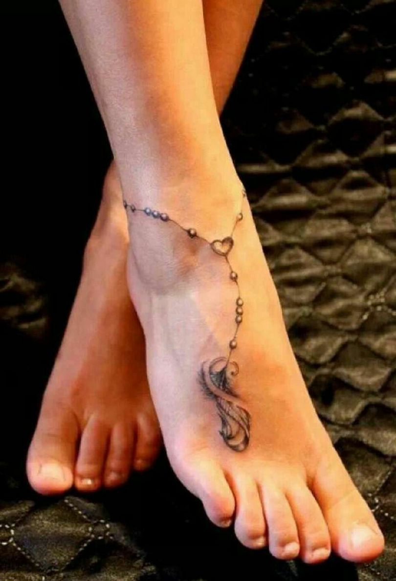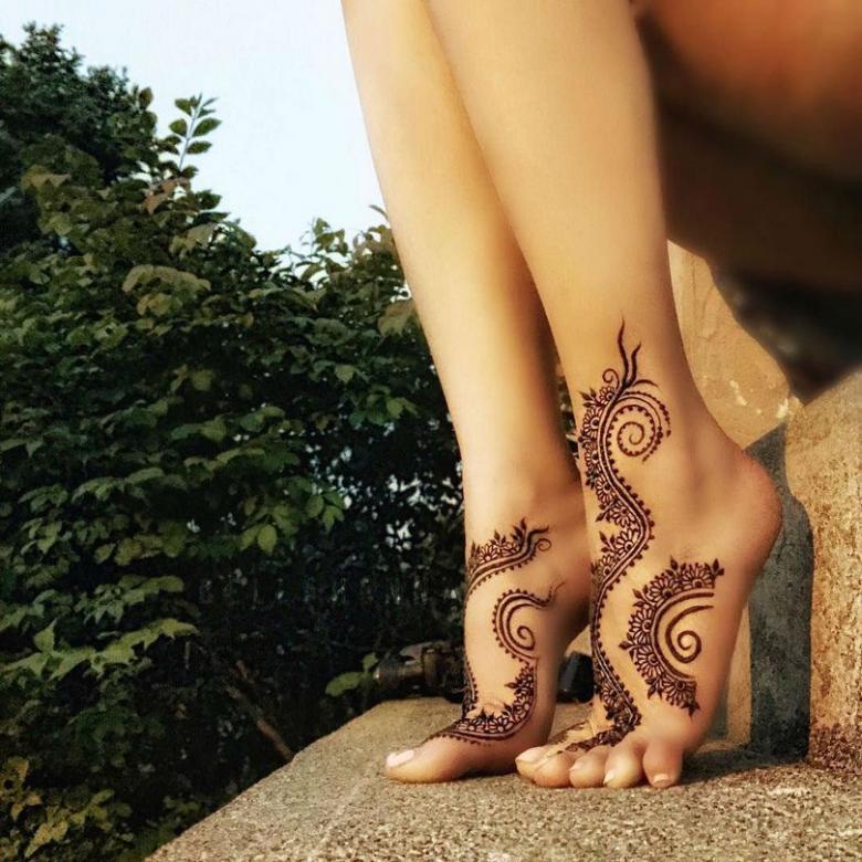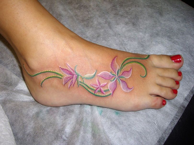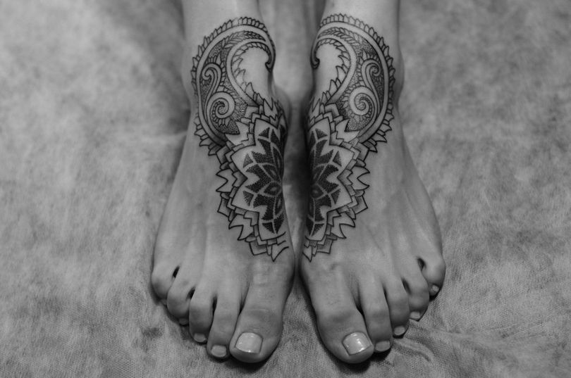 Le pied a une petite surface, il est donc difficile d'adapter un grand dessin. Mais il est possible de créer un beau motif où le tatouage progresse du pied au tibia, remonte jusqu'au genou et peut aller jusqu'à la hanche. Le corps d'une femme est beau avec des lignes fluides qui accentuent la beauté de sa silhouette.