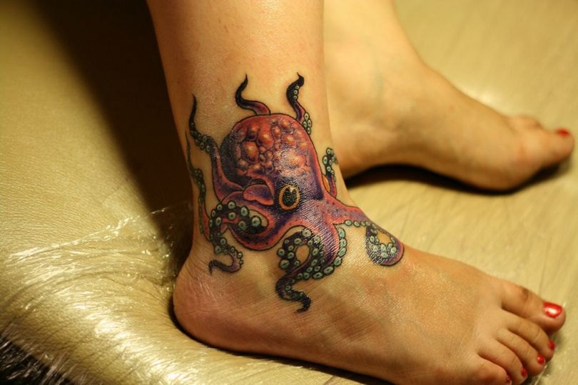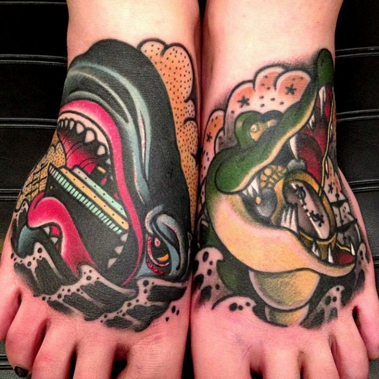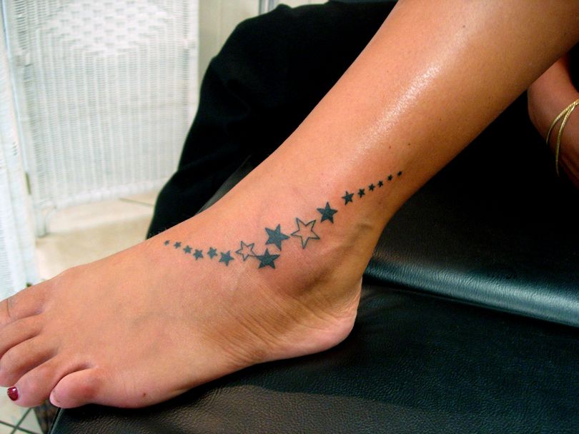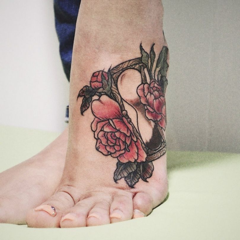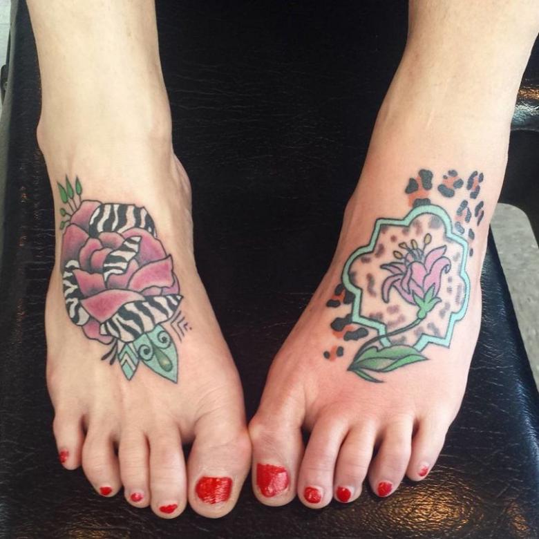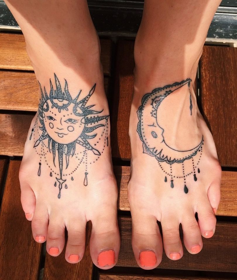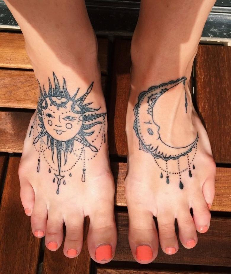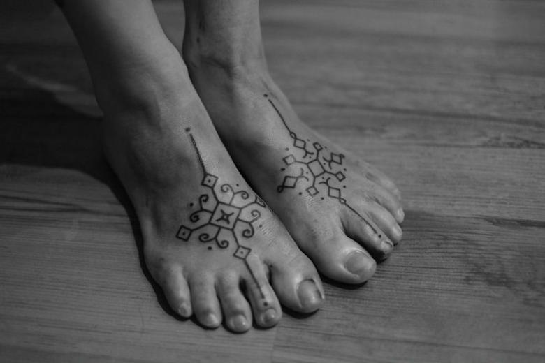 Placement : Sur le dessus de la cheville. Il est considéré comme l'un des meilleurs endroits pour placer le tatouage, car il conserve sa luminosité pendant longtemps et est capable de maintenir son contour. Une option intéressante serait un tatouage jumelé (l'image est divisée en deux parties et sur chaque pied représente l'un de ces éléments, et lorsqu'ils sont mis ensemble reçoivent une image complète ou une partie est montrée sur votre jambe, et une autre sur la jambe partenaire et ainsi de suite en combinant reçu une image complète).
