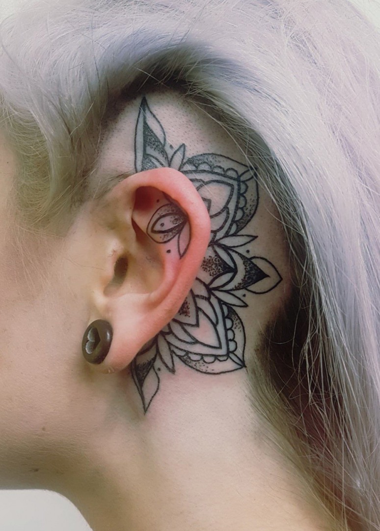 Si vous voulez garder votre nouveau tatouage secret, il est préférable de le faire sur le cartilage à l'arrière de votre oreille ou juste derrière l'oreille sur votre cou. La deuxième option permet d'obtenir un dessin plus grand. Il n'est pas rare que les hommes se fassent tatouer l'oreille entière, en optant pour des croquis représentant des crânes ou des animaux agressifs.