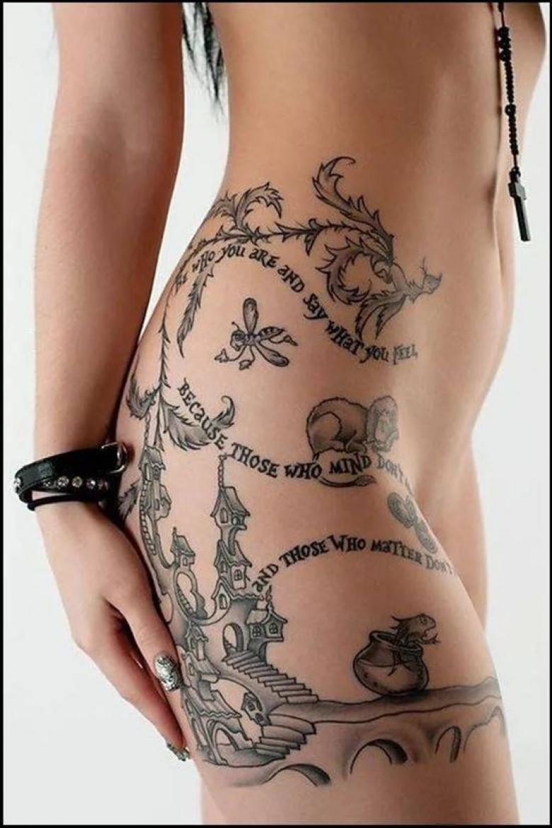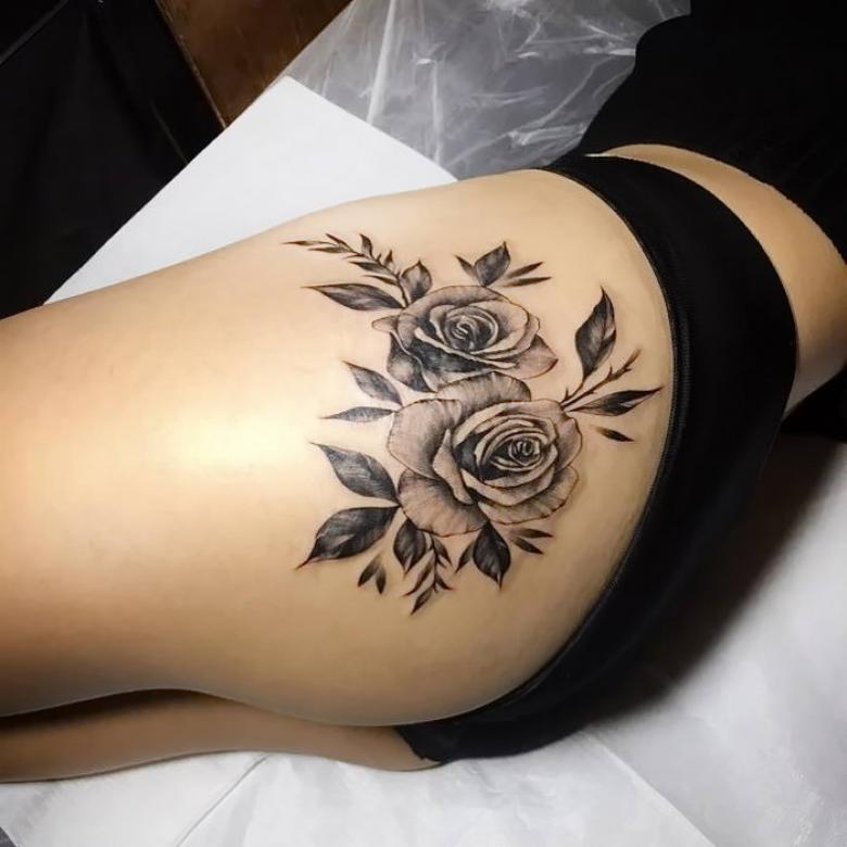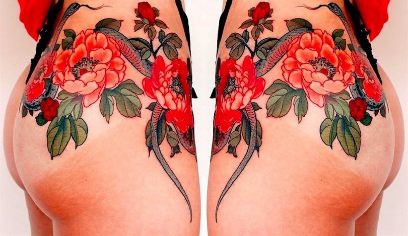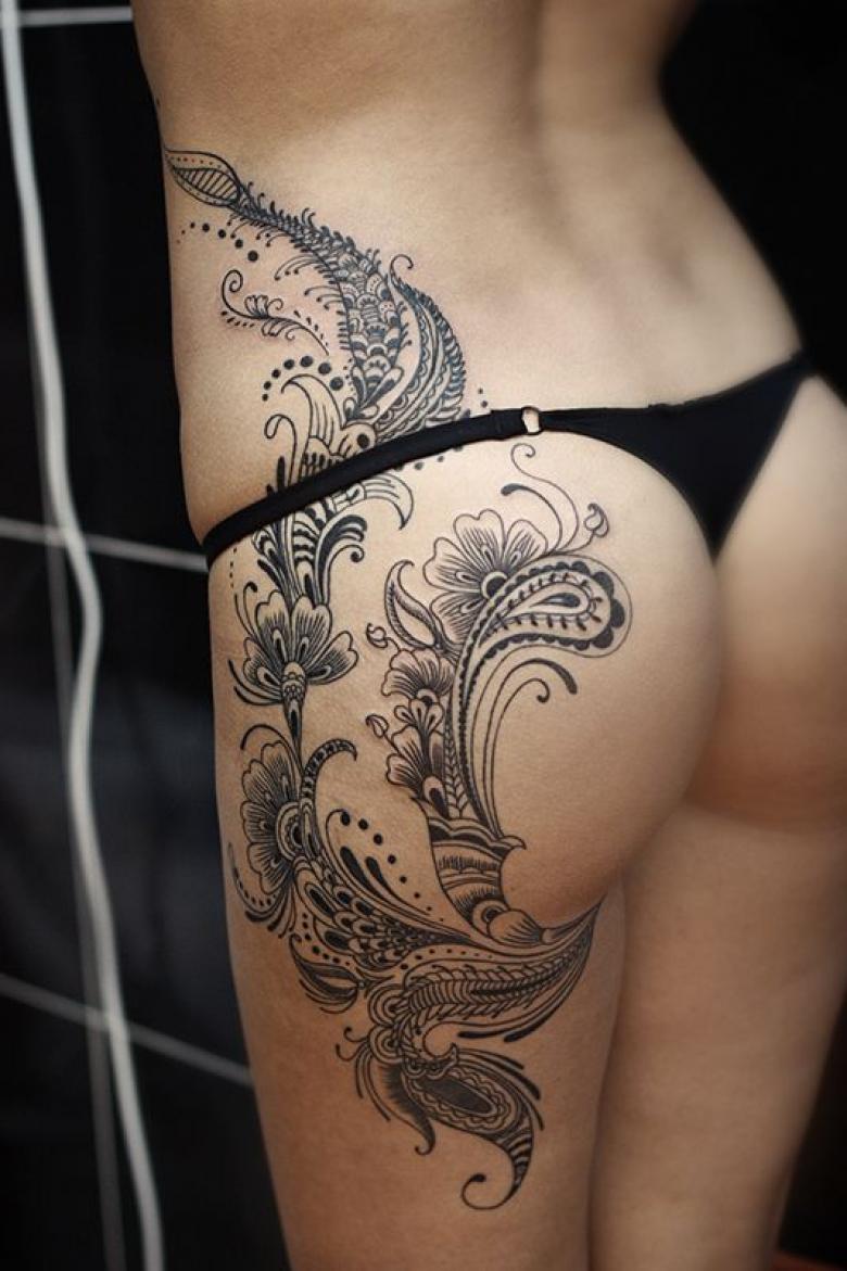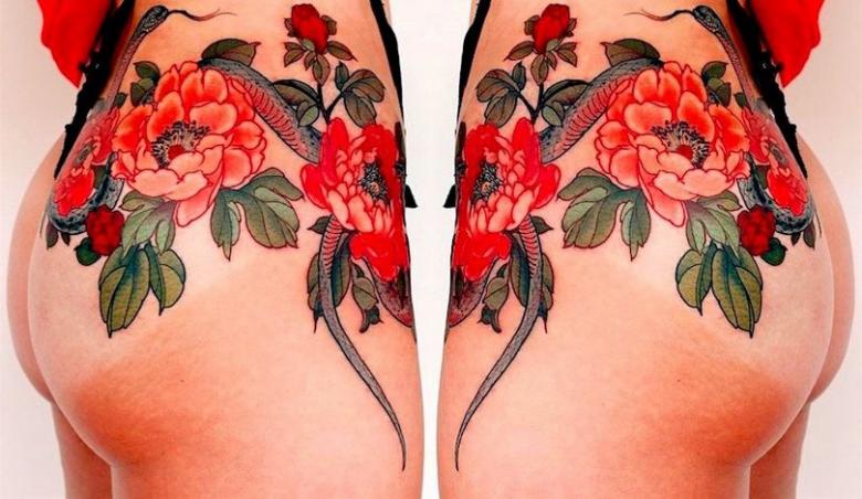 Des hanches légèrement plus larges, des jambes qui ne sont pas trop longues ou une taille qui n'est pas tout à fait haute nécessiteront un modèle plus grand. Dans ce cas, le tatouage peut commencer sur les fesses et se déplacer vers la zone à problème, agrandissant visuellement les jambes et réduisant le volume de la taille ou des hanches. Dans ce cas, faites une grande photo ou plusieurs images, mais elles doivent être liées entre elles par le sujet.