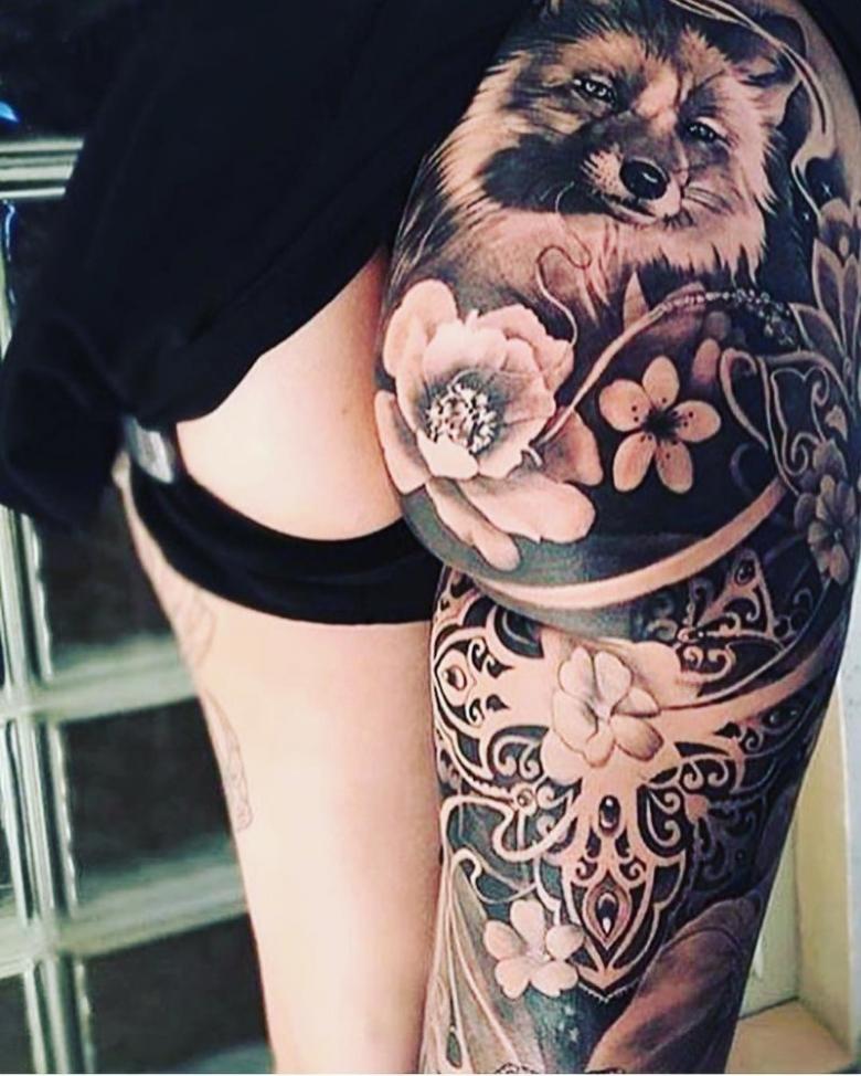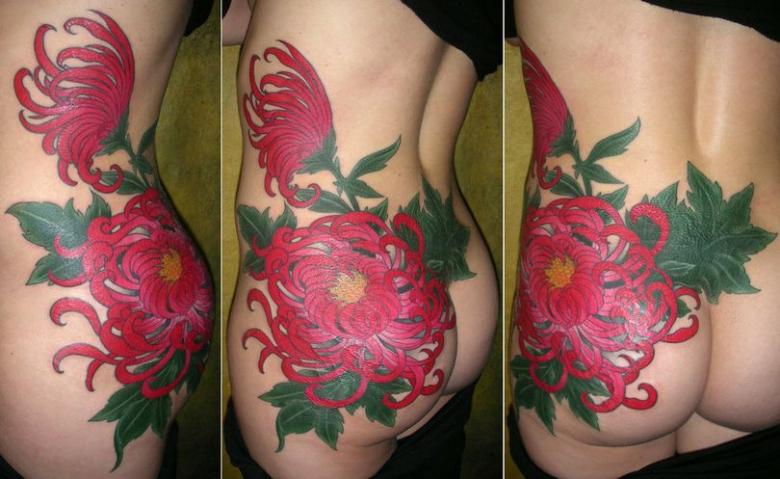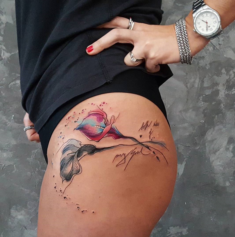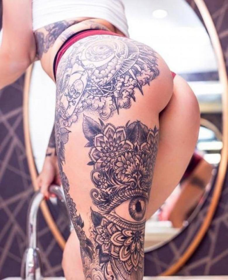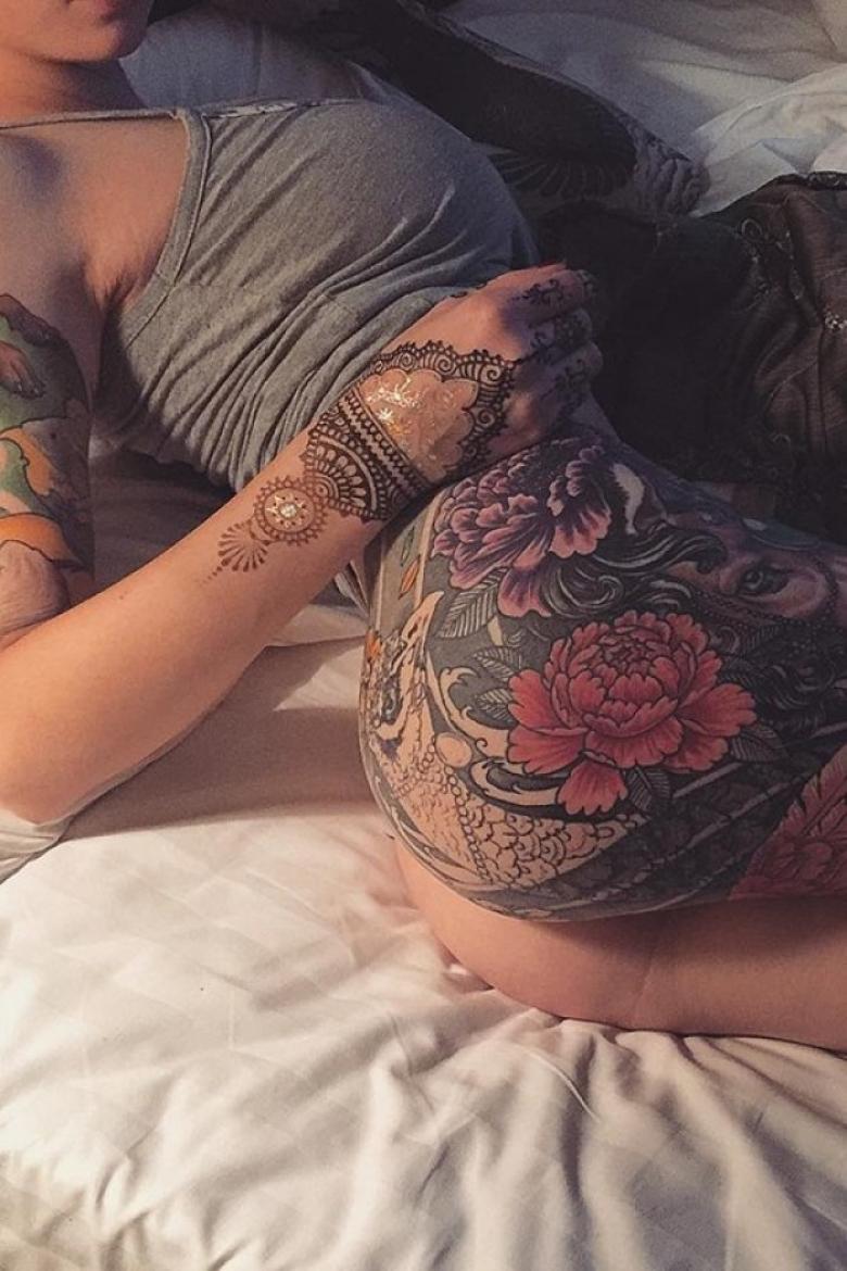 Des hanches légèrement plus larges, des jambes qui ne sont pas trop longues ou une taille qui n'est pas tout à fait haute nécessiteront un modèle plus grand. Dans ce cas, le tatouage peut commencer sur les fesses et se déplacer vers la zone à problème, agrandissant visuellement les jambes et réduisant le volume de la taille ou des hanches. Dans ce cas, faites une grande photo ou plusieurs images, mais elles doivent être liées entre elles par le sujet.