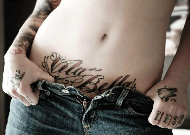 Au XXIe siècle, les tatouages de texte sur le ventre sont très demandés par les filles. Si vous choisissez une petite taille, les lettres auront l'air minimalement inoffensives, mais aussi provocantes et sexy. Pratiqué chez les jeunes filles et les filles plus âgées. Surtout sur le ventre, toute citation ou phrase inventée de la tête aura l'air créative et intéressante si le texte est fait en prenant comme base :
