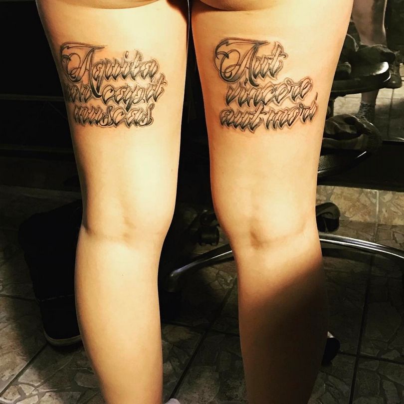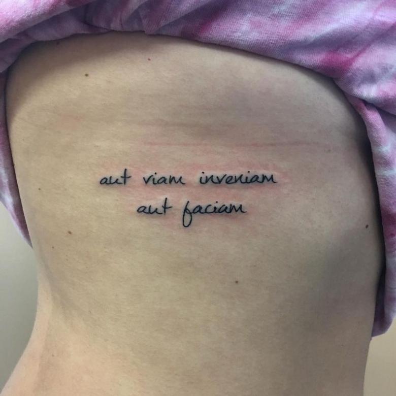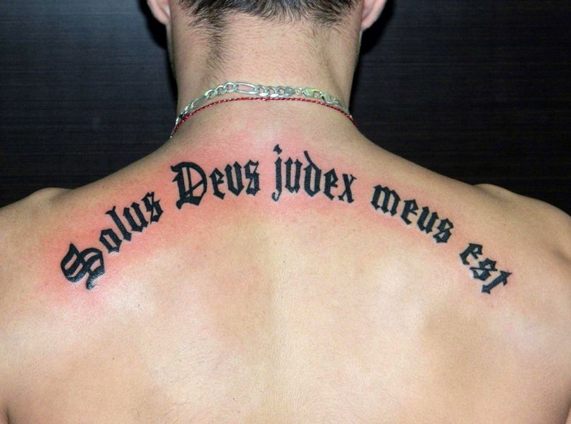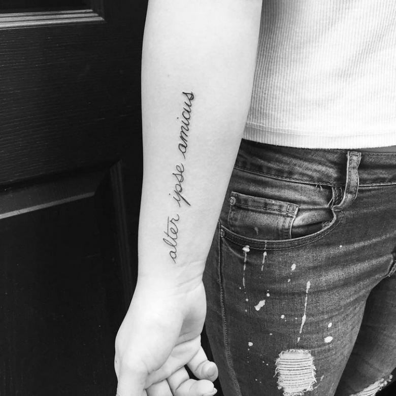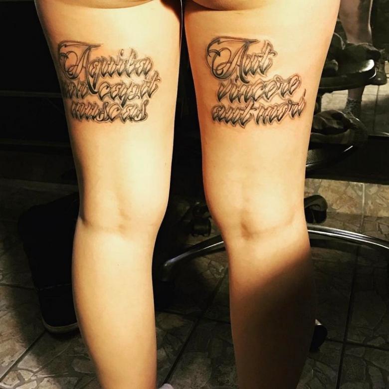 Si le tatouage d'une inscription latine est volumineux, il sera beau sur le dos, sous les côtes, sur l'épaule. Les demi-inscriptions divisées en deux parties sont également en vogue en ce moment. Une partie de la phrase est imprimée sur la main droite et l'autre sur la main gauche. Ou bien l'ensemble est imprimé sur différentes jambes, côtés de la poitrine ou dos. Si les mains sont combinées, l'ensemble de l'inscription latine tatouée révélera l'essence du message.