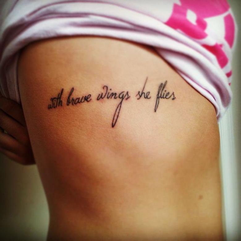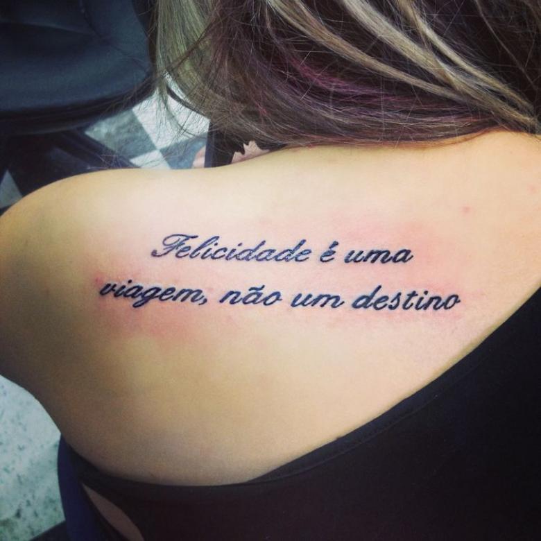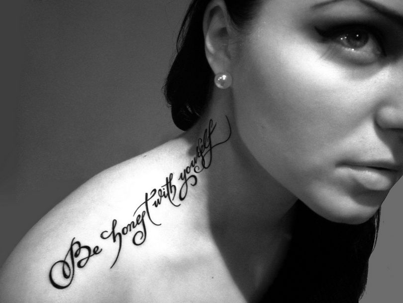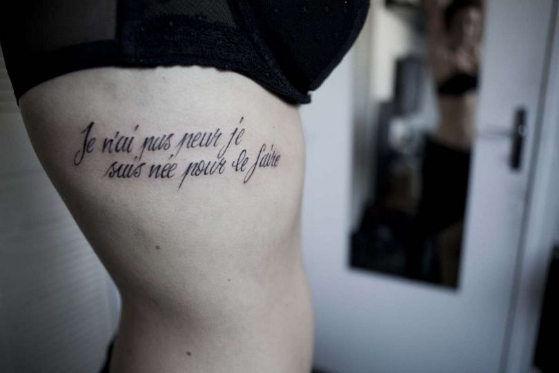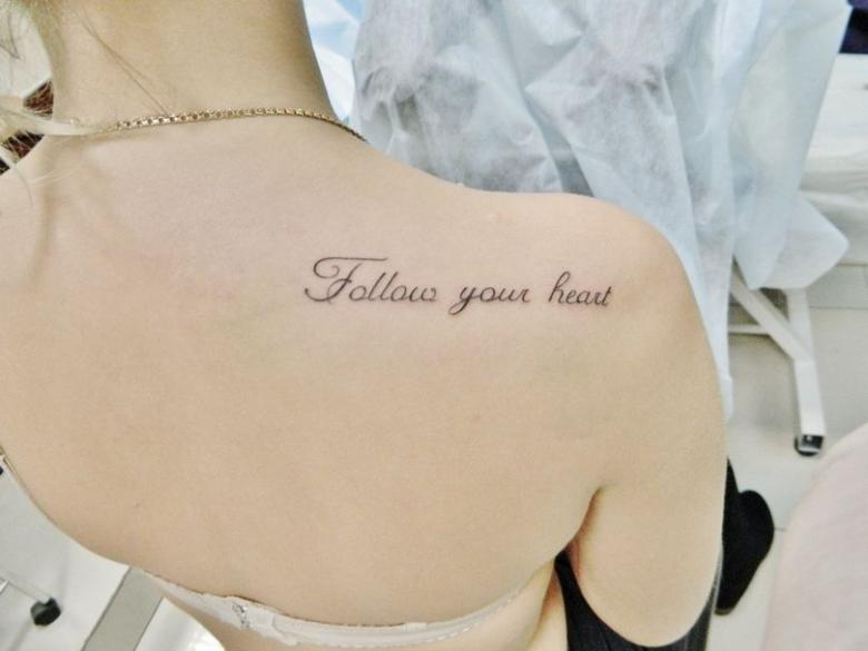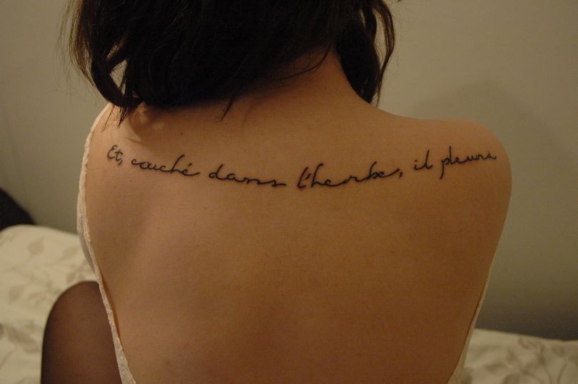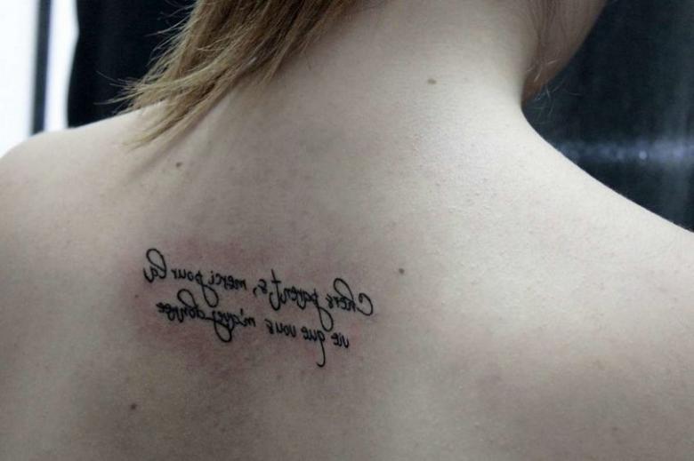 Un petit dicton en petits caractères peut être bien placé sur le pied, le poignet, l'épaule ou l'omoplate. Un court slogan inscrit au milieu du dos, entre les omoplates ou sur la colonne vertébrale fait bonne figure. Et il est aussi efficace sur le corps des hommes que sur celui des femmes.