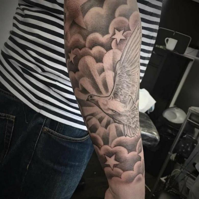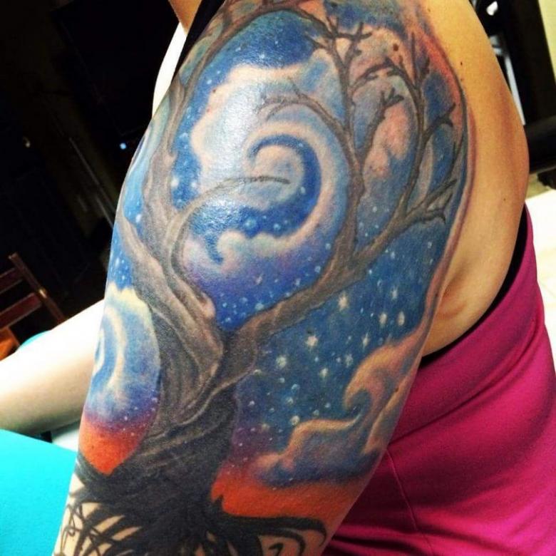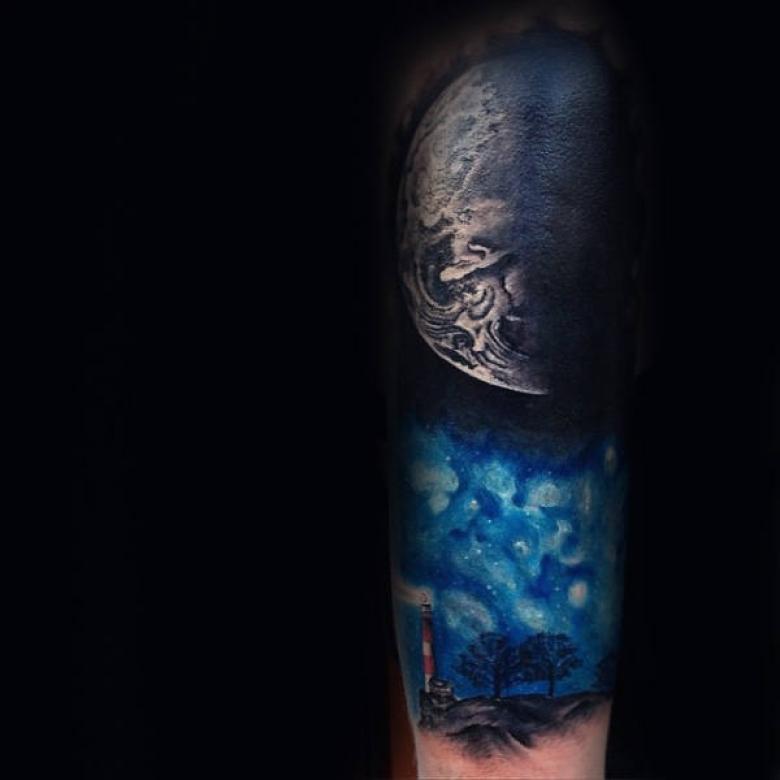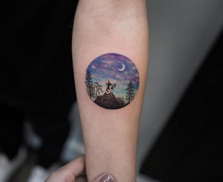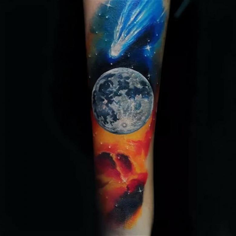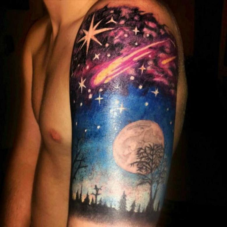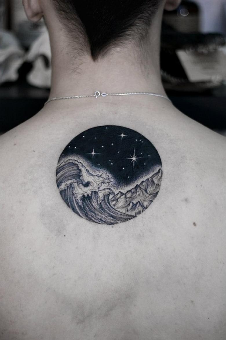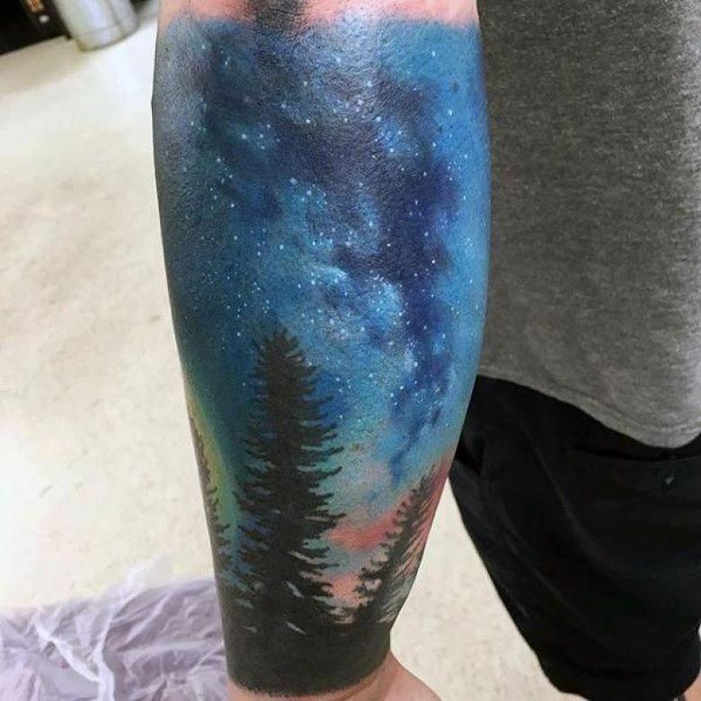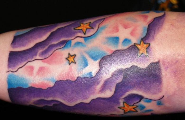 A toutes les époques, le ciel a symbolisé l'éternité. Chaque étoile qui s'y trouve indique davantage la fortune du voyage de la vie. Mais il ne faut pas oublier que l'esquisse sur le poignet renvoie son porteur à des personnes dont l'orientation n'est pas conventionnelle. Le ciel étoilé sur le dos et les petites étoiles attrayantes sur l'avant-bras ont un aspect unique.