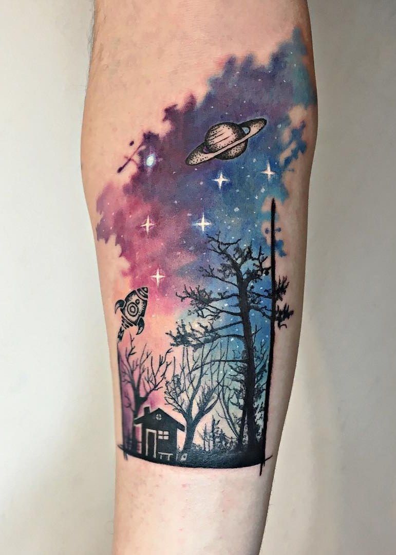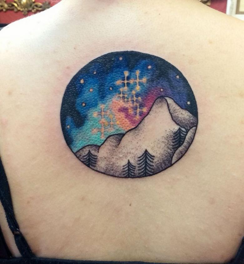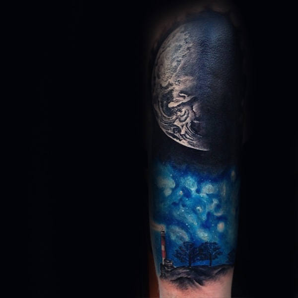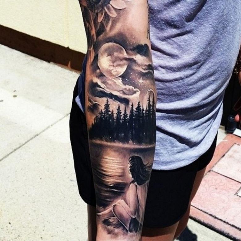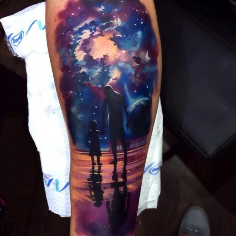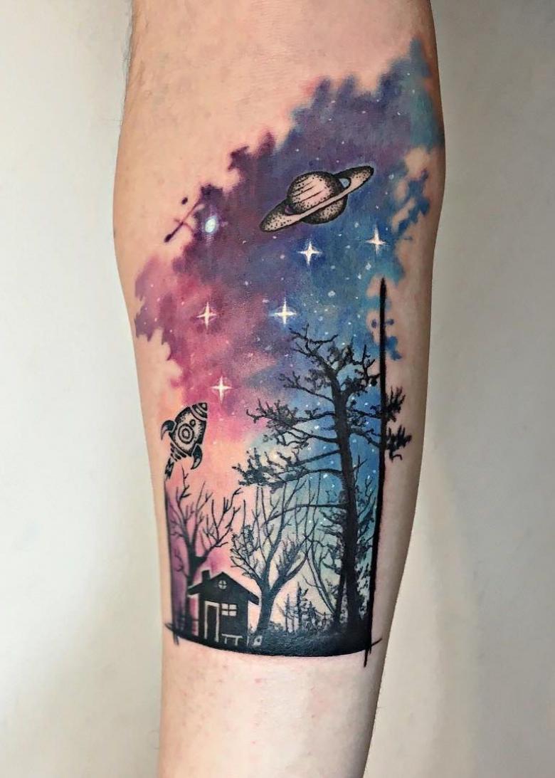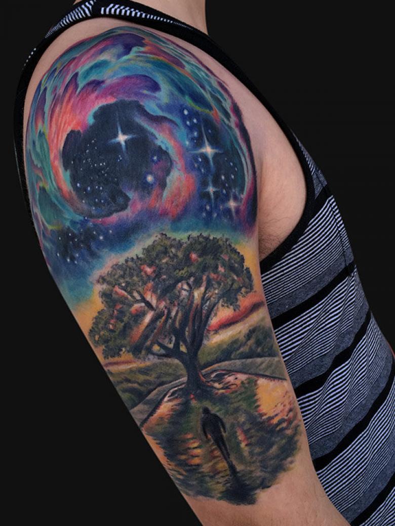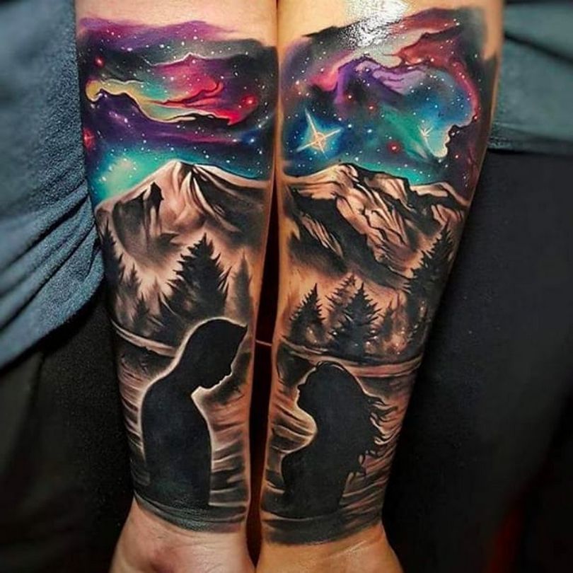 A toutes les époques, le ciel a symbolisé l'éternité. Chaque étoile qui s'y trouve indique davantage la fortune du voyage de la vie. Mais il ne faut pas oublier que l'esquisse sur le poignet renvoie son porteur à des personnes dont l'orientation n'est pas conventionnelle. Le ciel étoilé sur le dos et les petites étoiles attrayantes sur l'avant-bras ont un aspect unique.