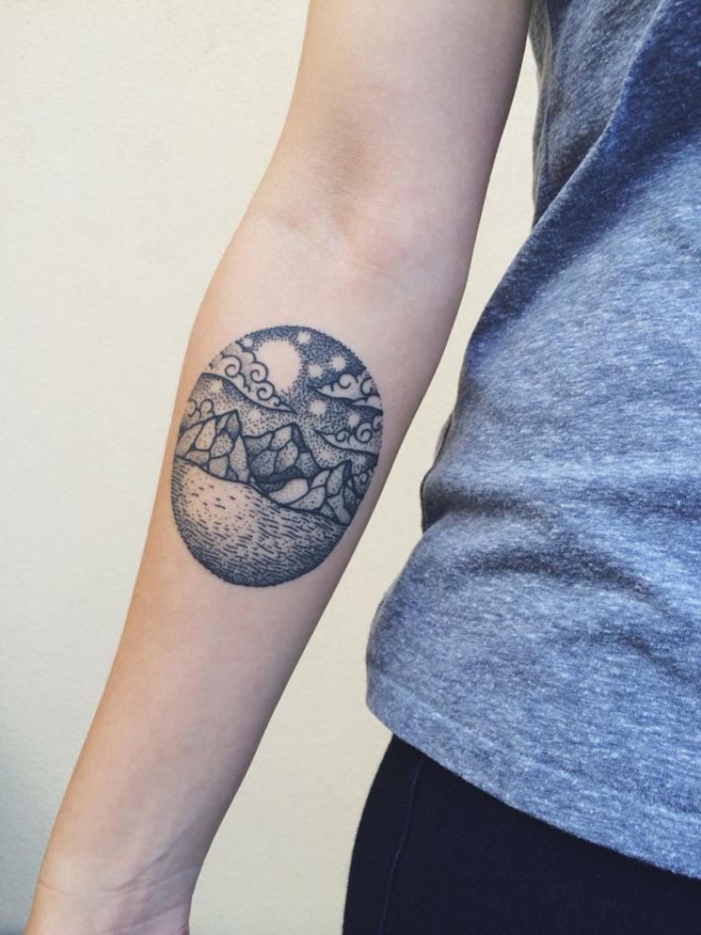 Des soleils émergeant de la couverture nuageuse - la positivité, la croyance en l'amour. Demandez au maître du salon de tatouage de diversifier le dessin avec un texte contenant des phrases qui définissent votre position dans la vie. Par exemple : "ne cachez pas vos sentiments", "ne perdez pas votre temps simplement", "accomplissez vos tâches à cent pour cent". Des paroles adaptées de vos chansons préférées.