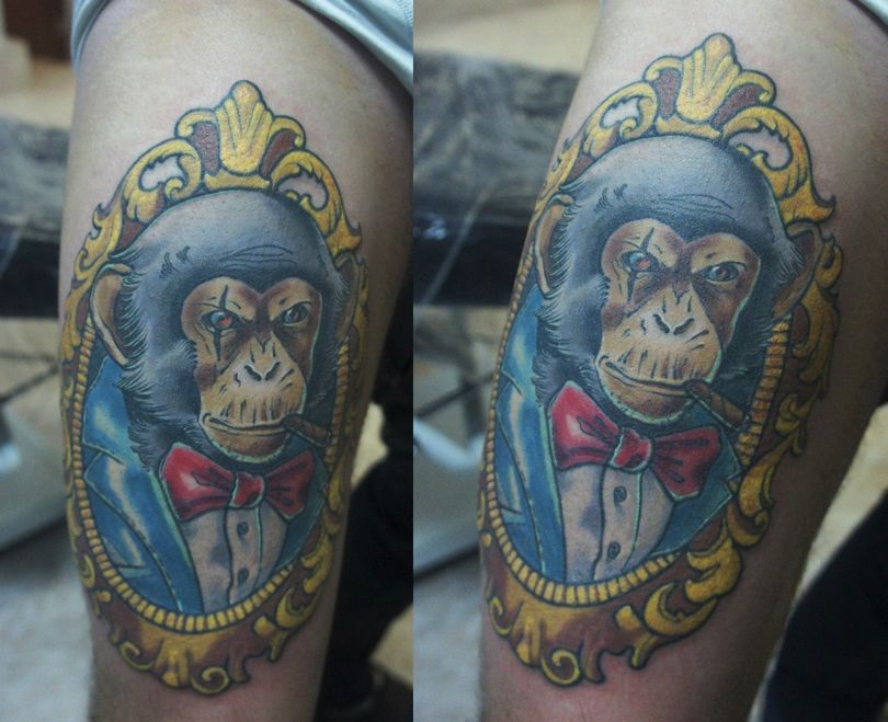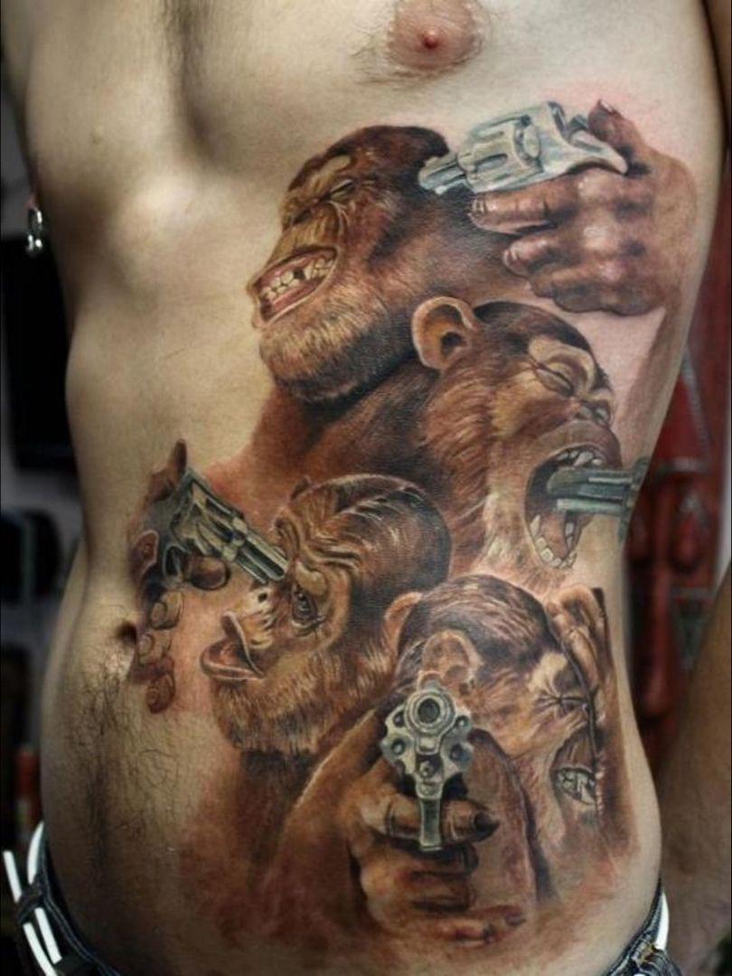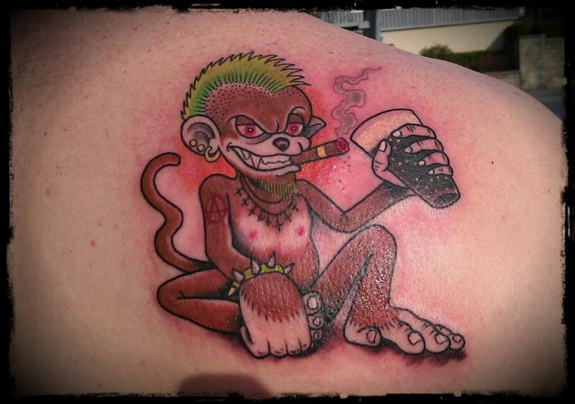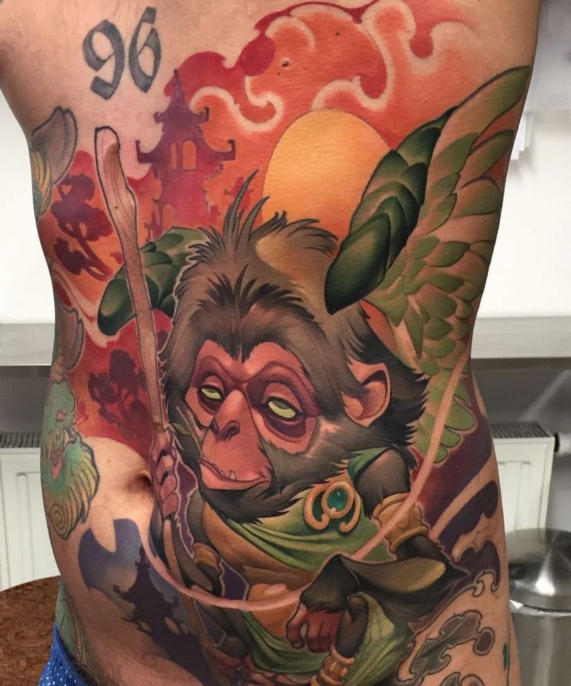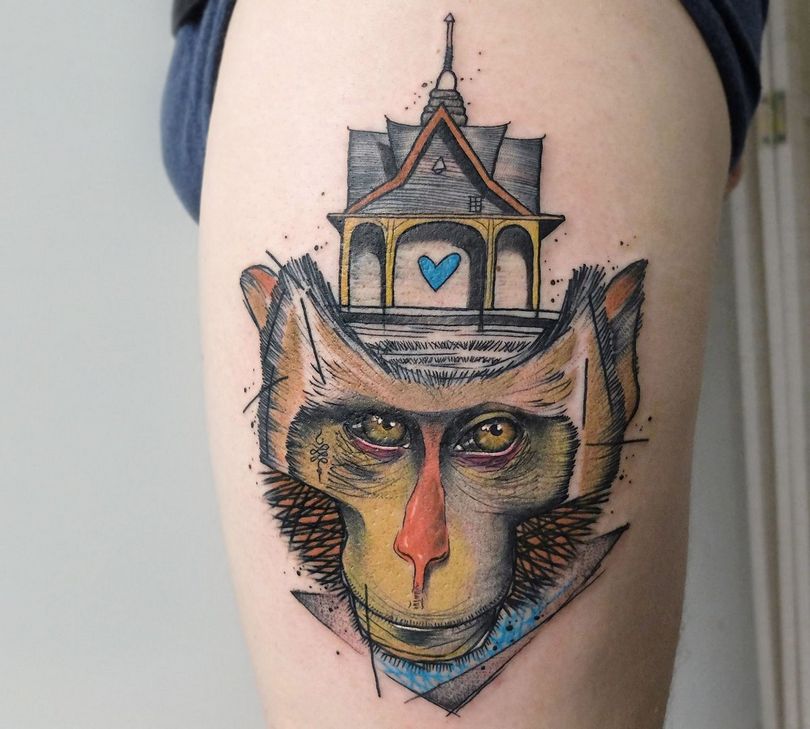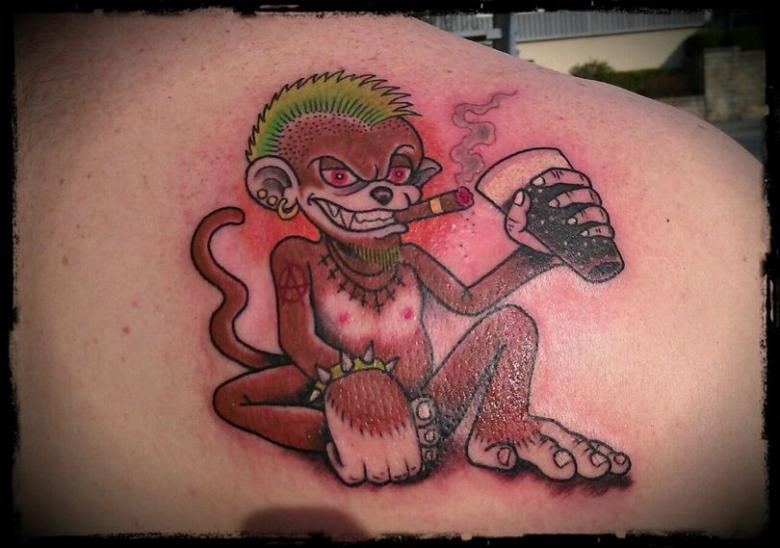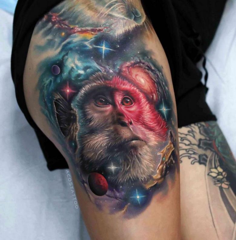 Les zones populaires pour les tatouages de singe sont : le dos, l'épaule, l'avant-bras, la cuisse. Parfois, ils sont même faits sur le ventre.