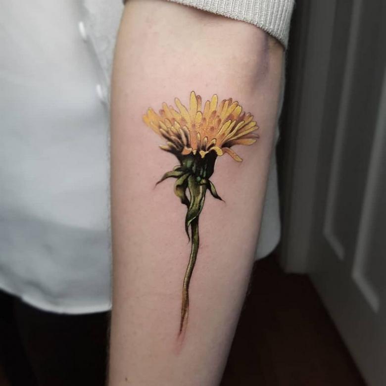 Les tatouages de pissenlit se retrouvent également dans des versions dessinées, tout comme les détails environnants - oiseaux, abeilles, animaux et autres plantes, soleil. Ce sont des œuvres lumineuses, saturées, où la forme peut être déformée au nom de l'esthétique, de l'originalité.