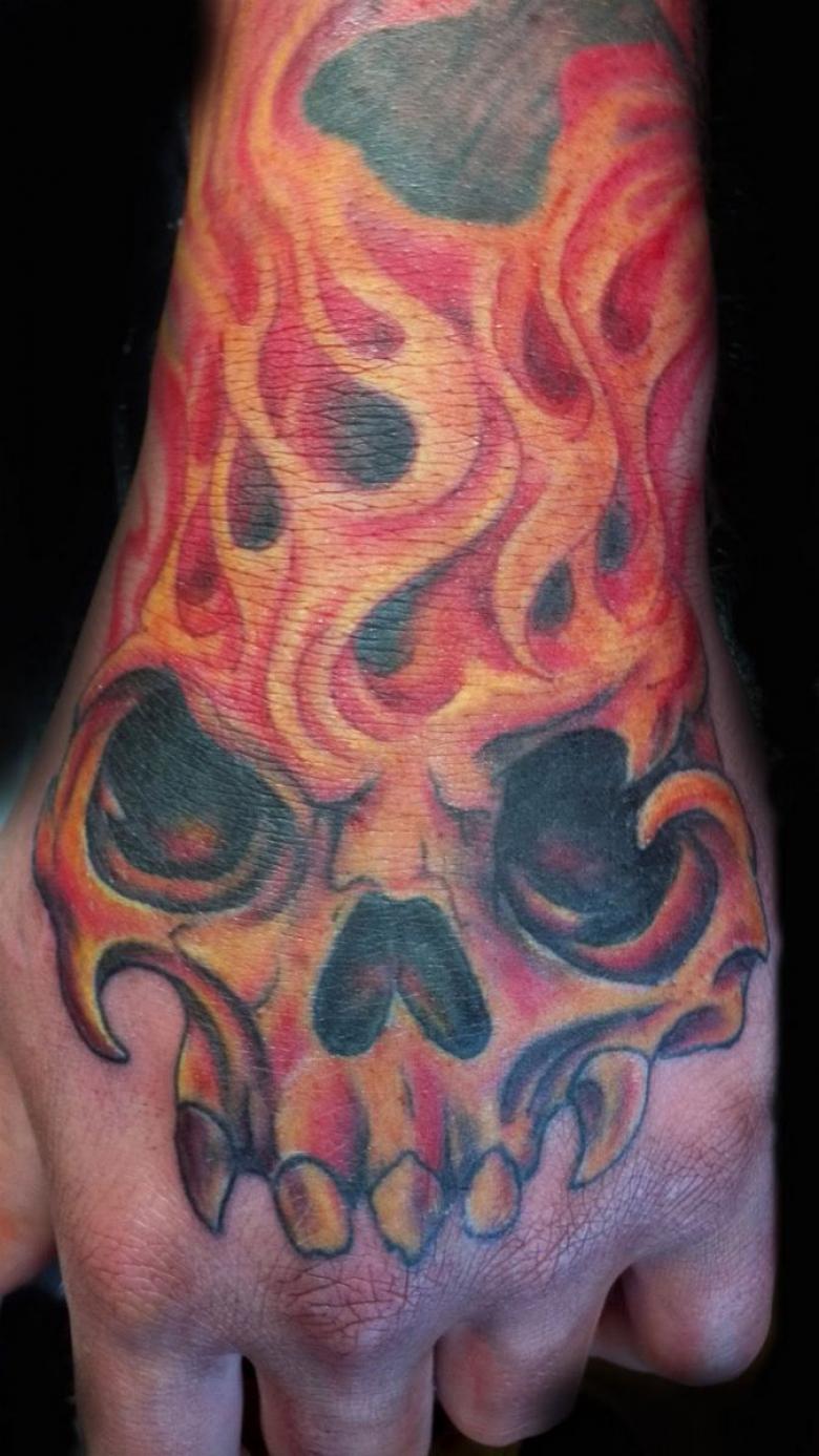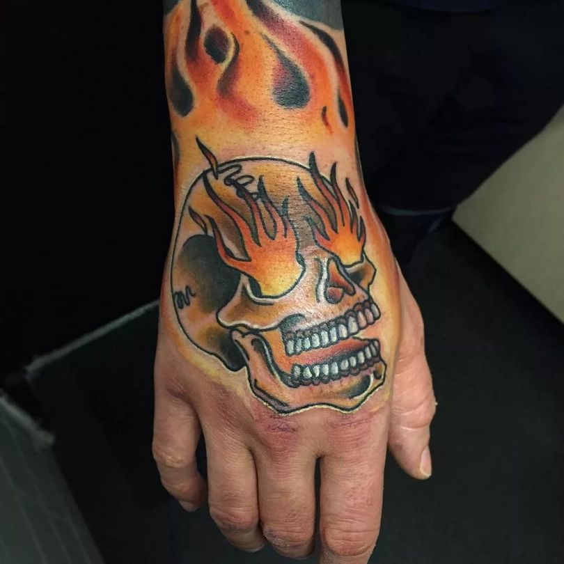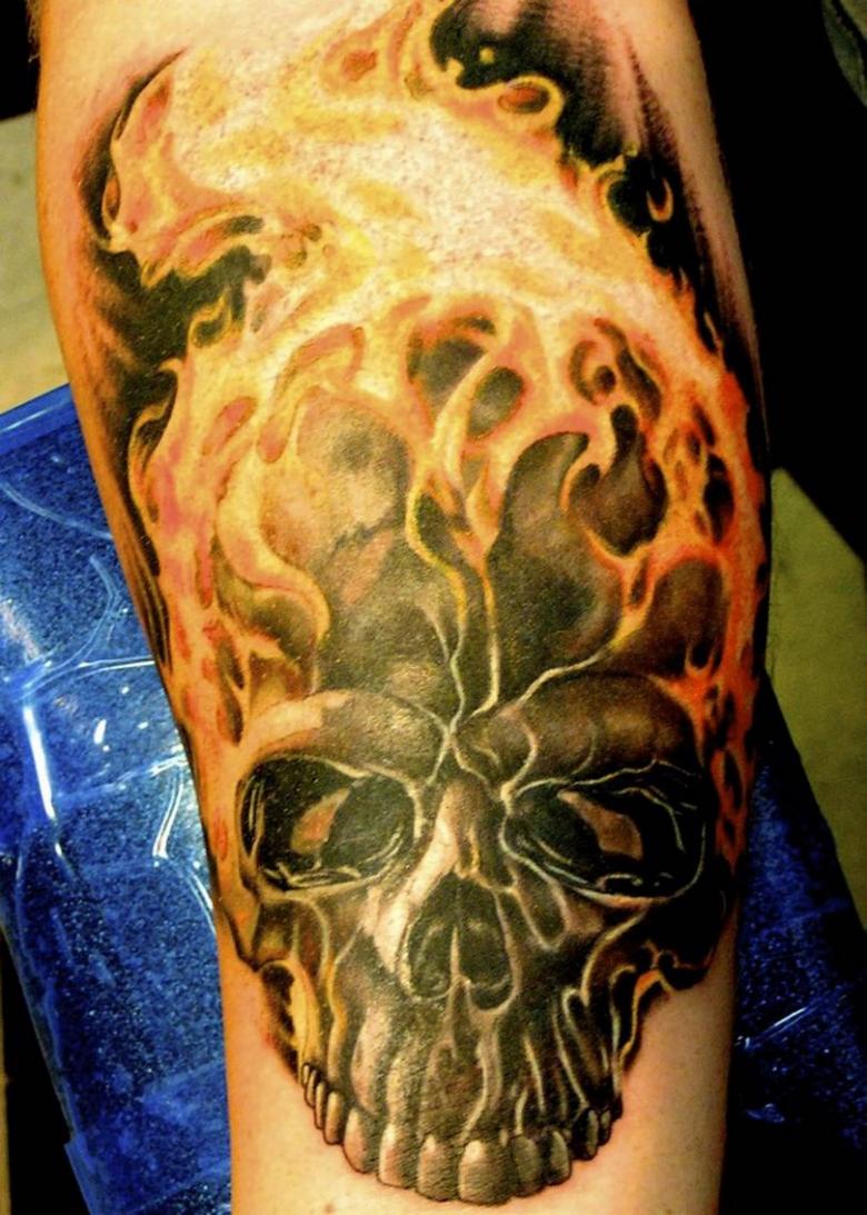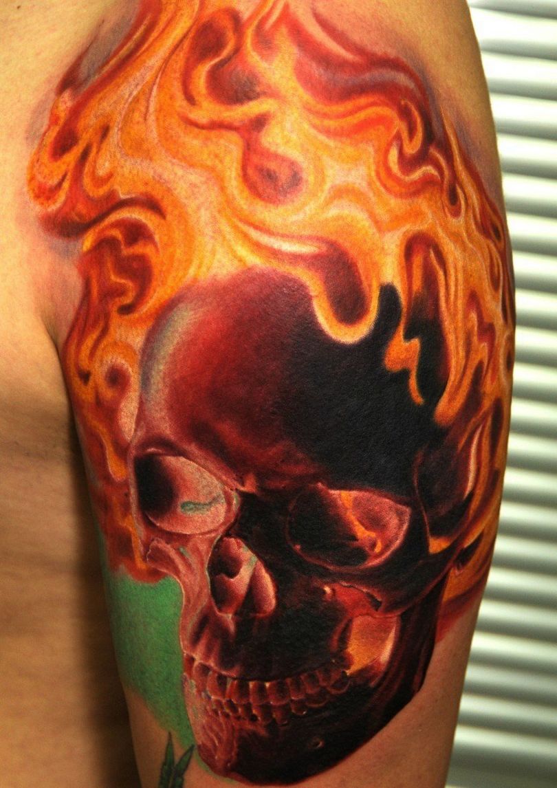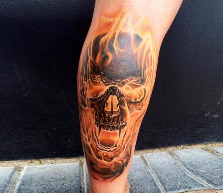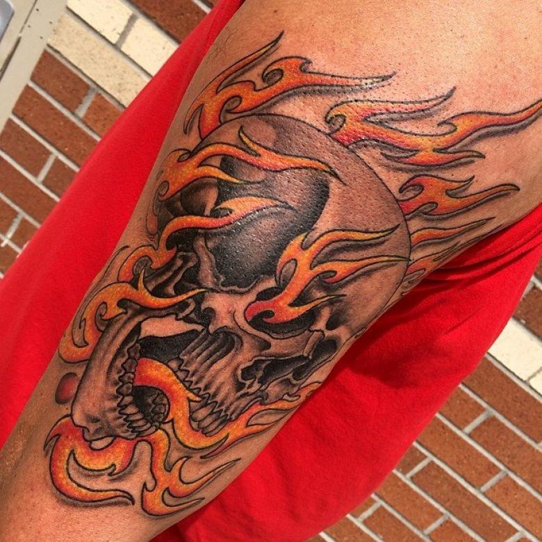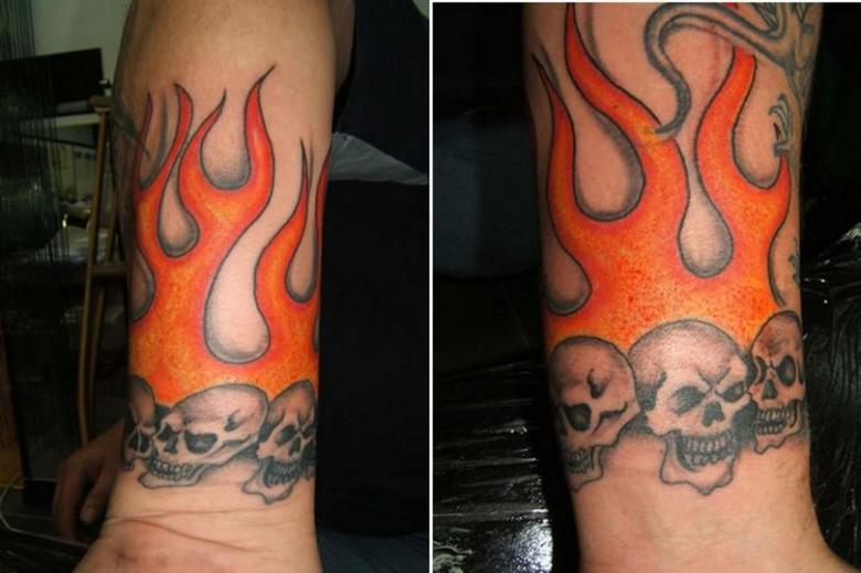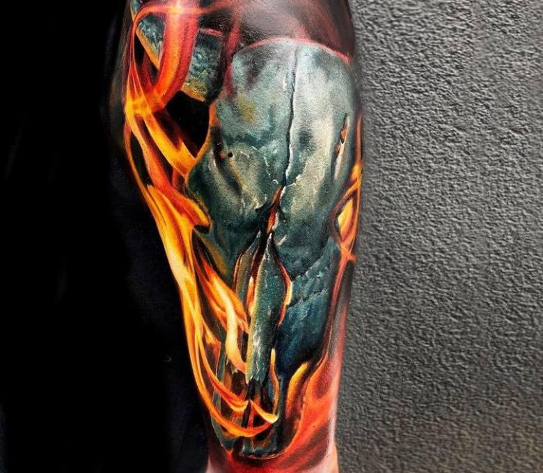 - Un tatouage en forme de crâne enveloppé de flammes - le choix de la personne dont le sang bouillonne d'adrénaline. Ils aiment les sports extrêmes et les comportements aventureux. Courses ou hauteurs, ils sont attirés par toute forme de risque. Mais il peut également s'agir d'une mise en garde contre le risque de faire un faux pas ou de se tromper.