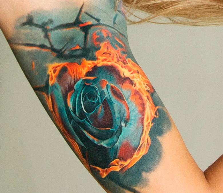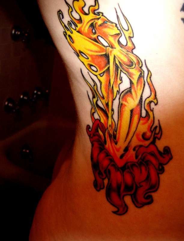 Un tatouage de feu vif sur le corps d'une fille suggère également qu'elle est ouverte à toutes les nouveautés. La porteuse d'un tel motif aime faire des choses inhabituelles de ses propres mains, incarne habilement des idées inattendues. Elle est encline au changement pour le mieux, à la croissance spirituelle.