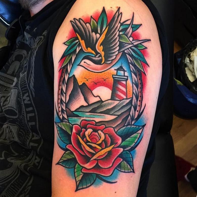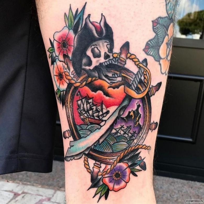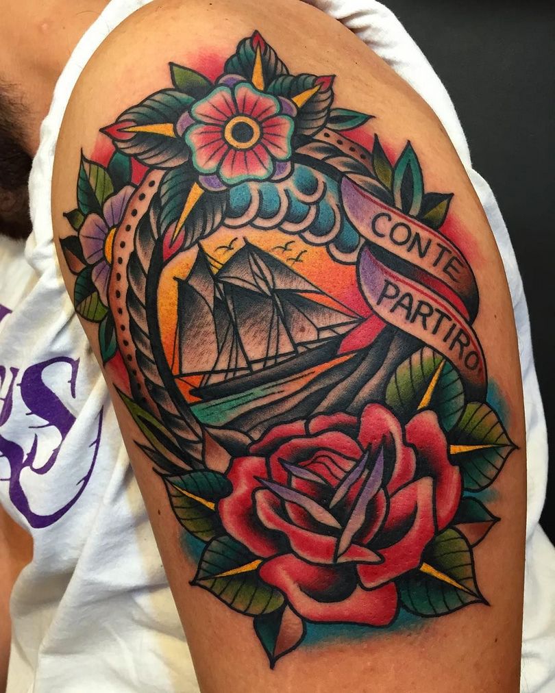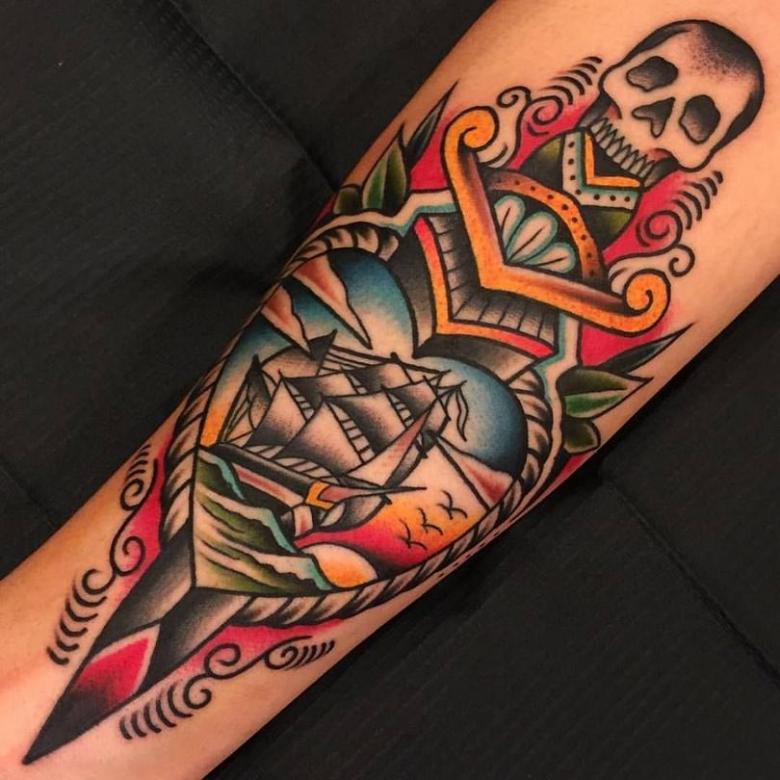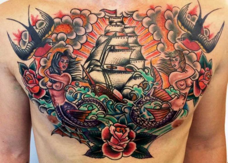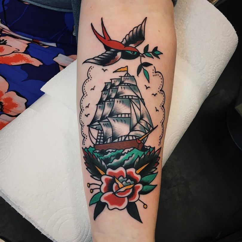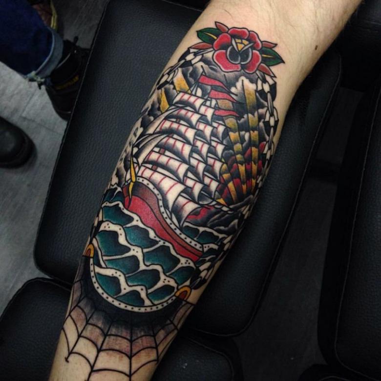 L'élément le plus populaire des tatouages composites de l'ancienne école, que l'on retrouve sur presque tous les arts corporels. Pour chaque marin, le navire était une seconde maison et l'équipage agissait comme une famille. Ce tatouage symbolisait donc l'espoir en l'avenir, la liberté de se libérer des contraintes et l'obligation d'aller de l'avant. Le symbolisme de ce tatouage confère à son propriétaire certains traits de caractère, on considère qu'il aspire au leadership, qu'il est prêt à tout, même aux circonstances les plus inattendues.