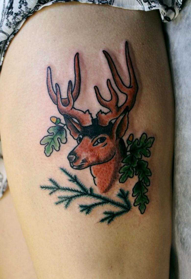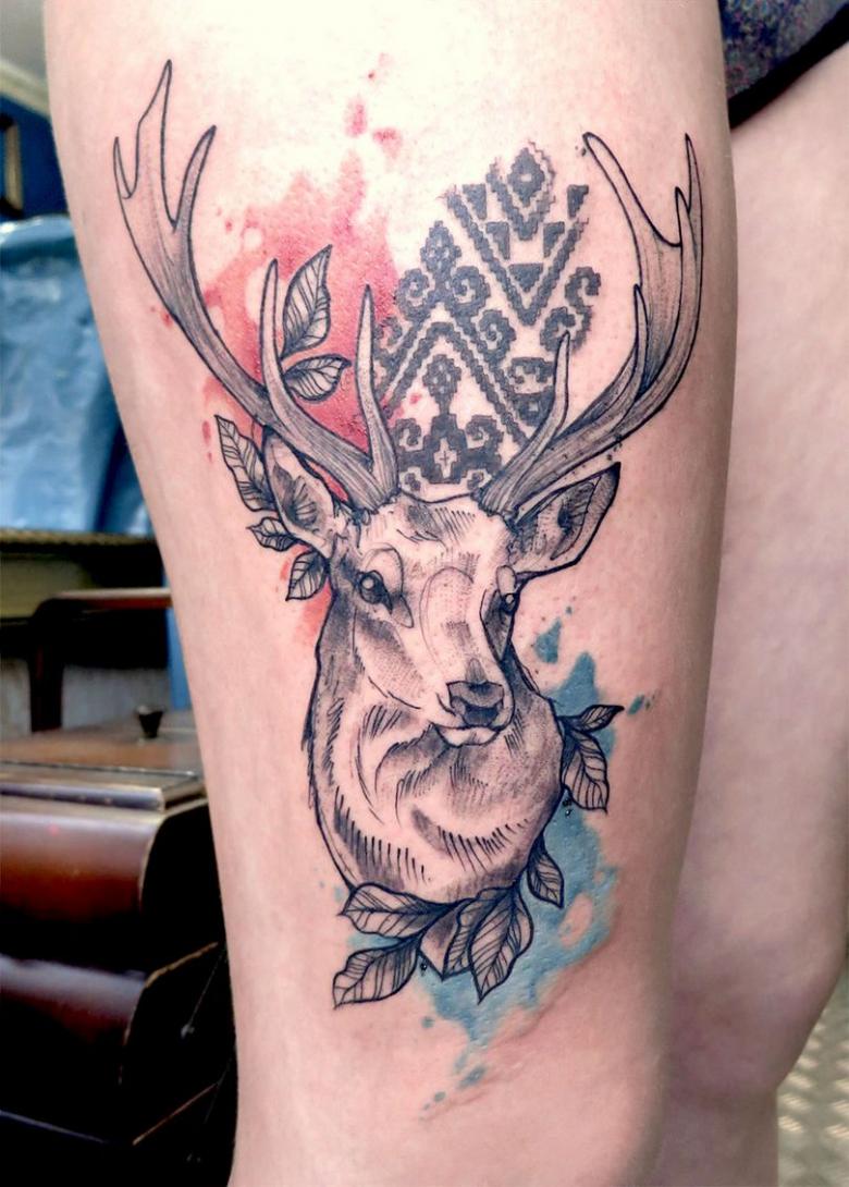 En plus de ce qui précède, l'image du cerf est également associée à l'arbre de vie, en raison de la similitude entre la couronne de branches de l'arbre et les puissants bois du cerf. Si un cerf était dessiné avec un serpent, ce dessin signifiait la lutte entre la vie et la mort, le bien et le mal. Si un tatouage représentant un animal debout sur un serpent est dessiné, il est considéré comme une victoire définitive pour le bien. Fondamentalement, l'image du cerf ne symbolise que les aspects positifs, mais certains dessinent un crâne de cerf, ce qui, dans ce cas, fait référence à la vie qui s'estompe, qui se fane.