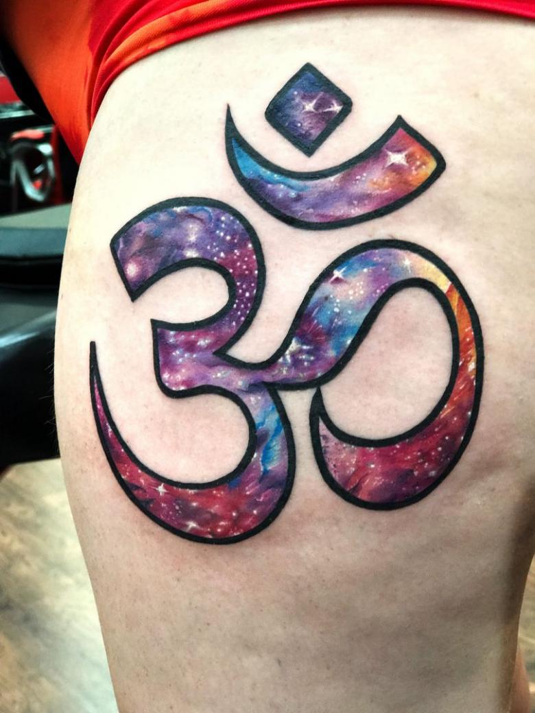 - le tatouage Om est inscrit sur un fond d'étoiles, une tache de couleur ;