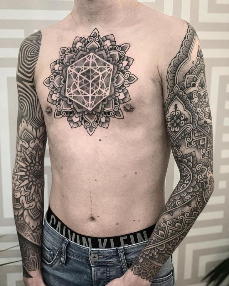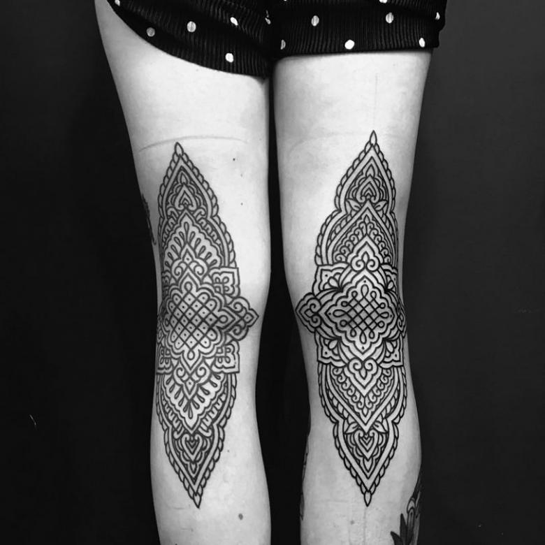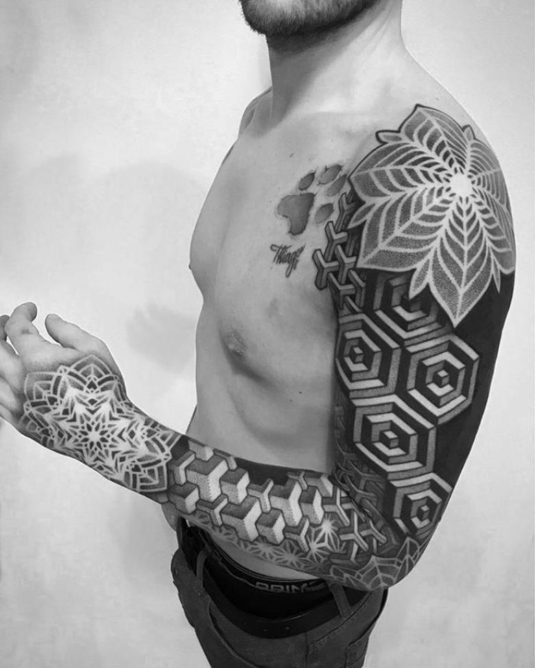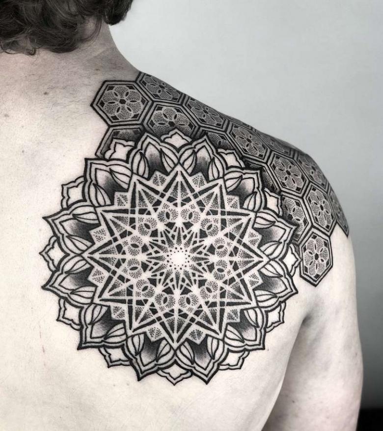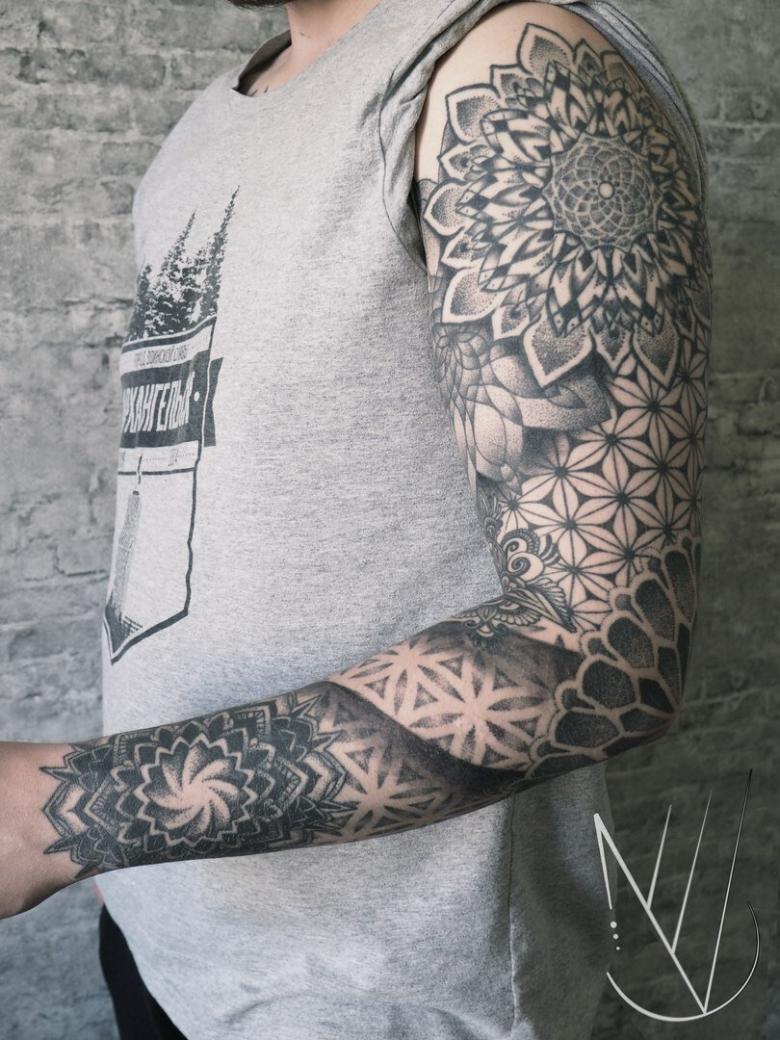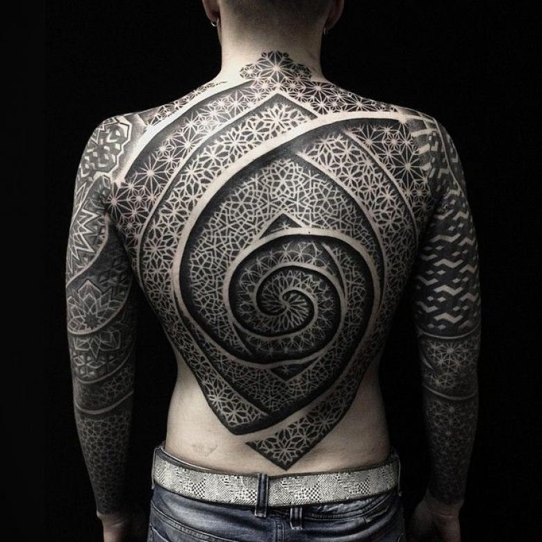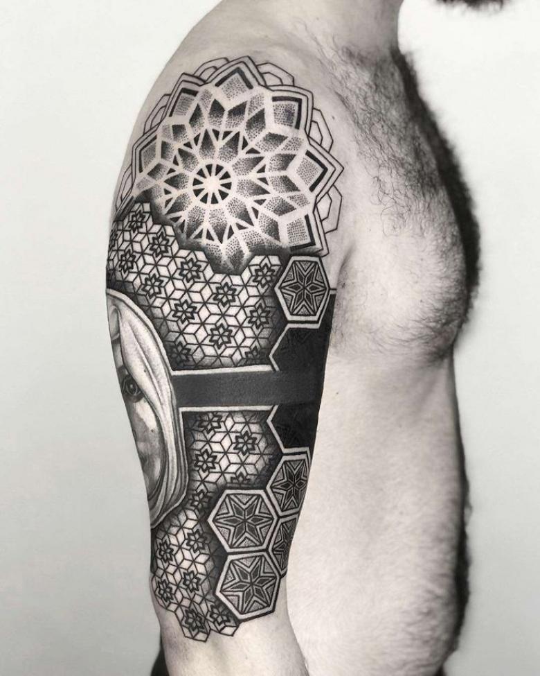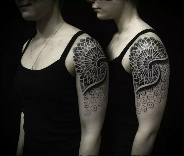 - Combinaison Dotwork et ornementale ressemble à l'application d'un tatouage avec un grand nombre de points, qui peuvent à la fois être dans la projection d'un motif ornemental, et remplir des formes géométriques, en créant des ombres et des demi-teintes.