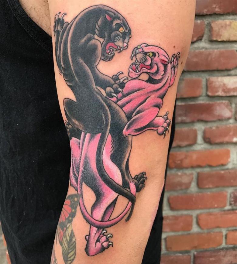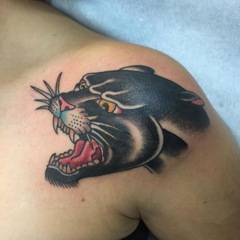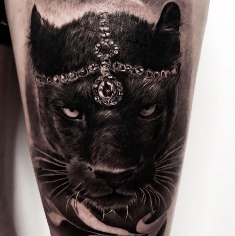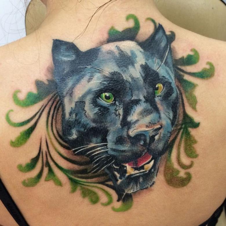La panthère sur le corps d'une femme représente davantage la beauté naturelle, une grande estime de soi. Le plus souvent, la gent féminine préfère une version tranquille - un prédateur au repos, détendu, juste une image de la tête en gros plan. Ils optent souvent pour des animaux de dessin animé - Bagheera du dessin animé domestique sur Mowgli, la Panthère rose.