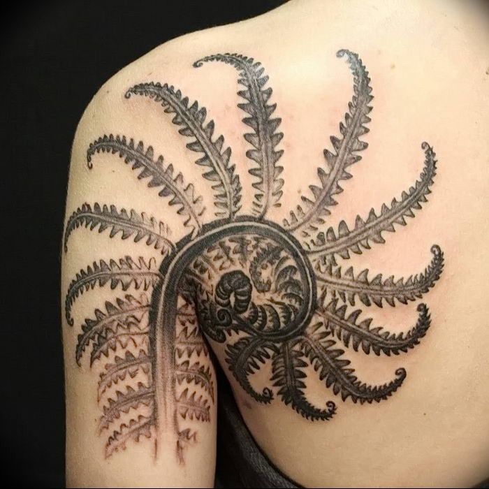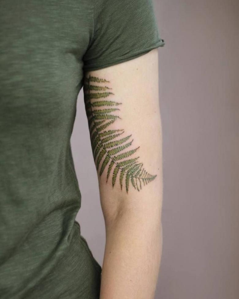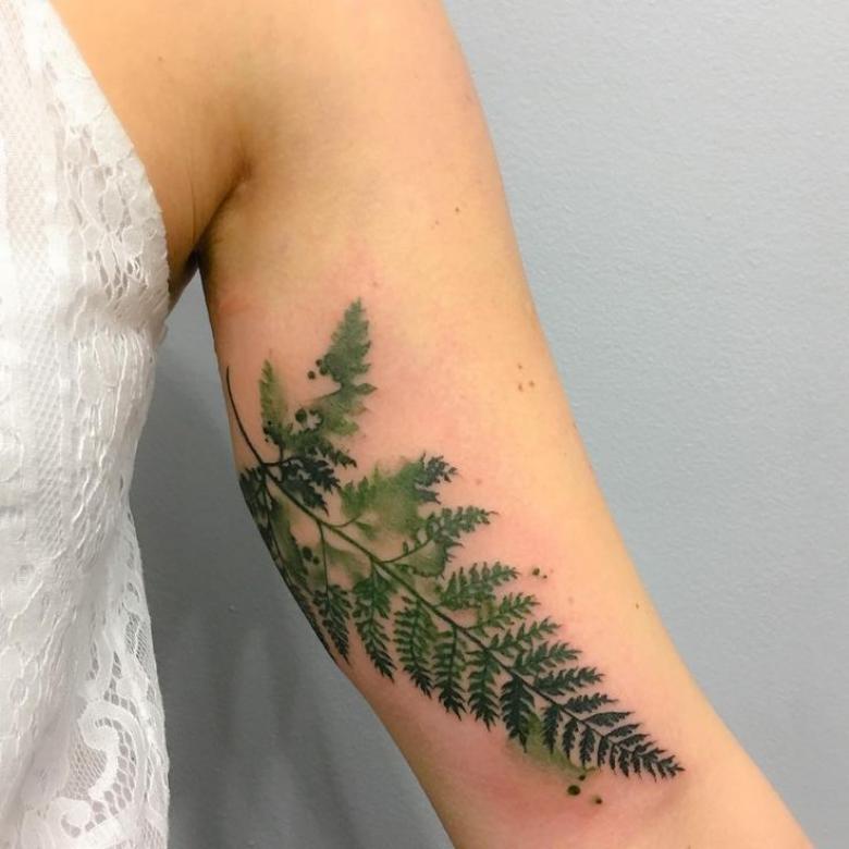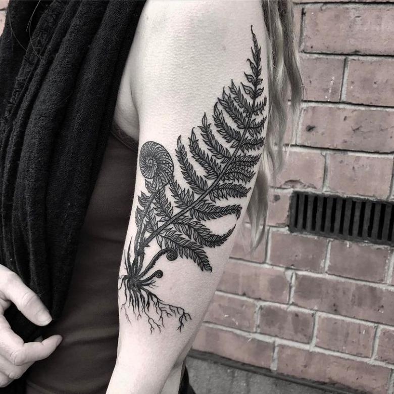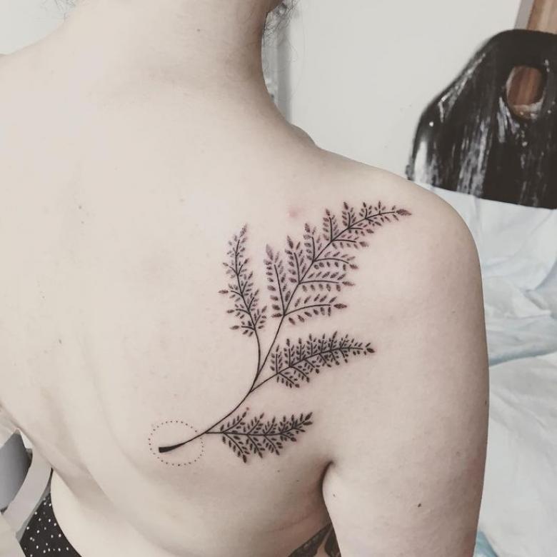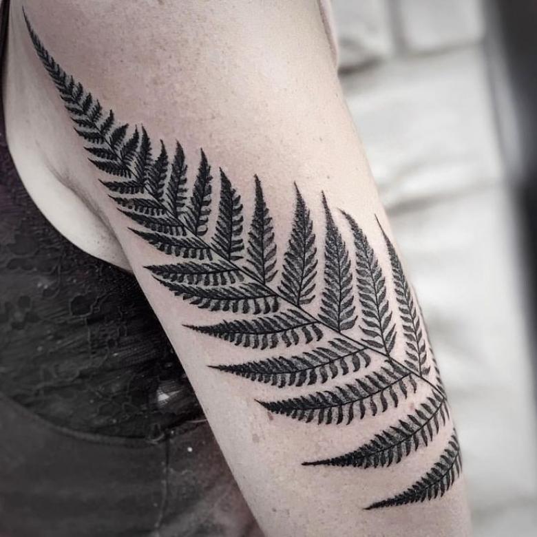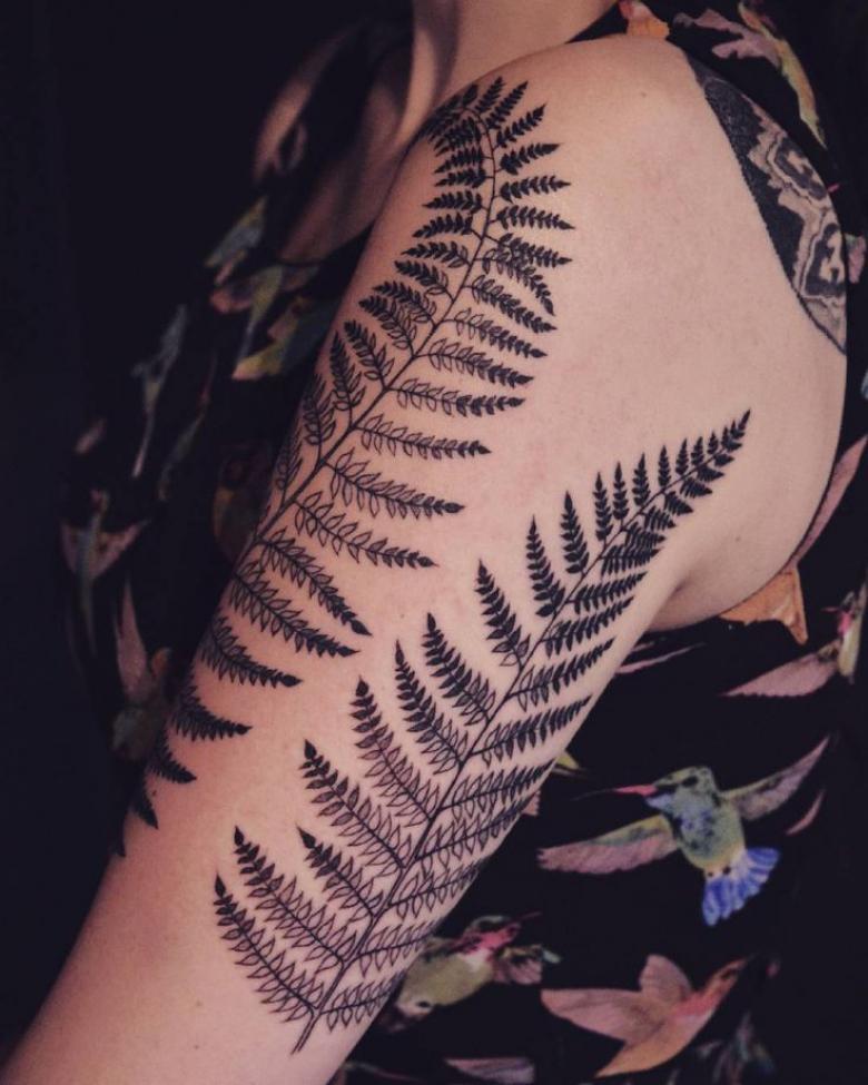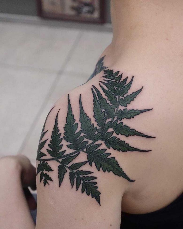 Le tatouage avec une fougère sur l'épaule d'une fille peut signifier un désespoir et une solitude, et une longue recherche du suicide, et le désir de trouver une connaissance magique du monde, réalisant son exclusivité.