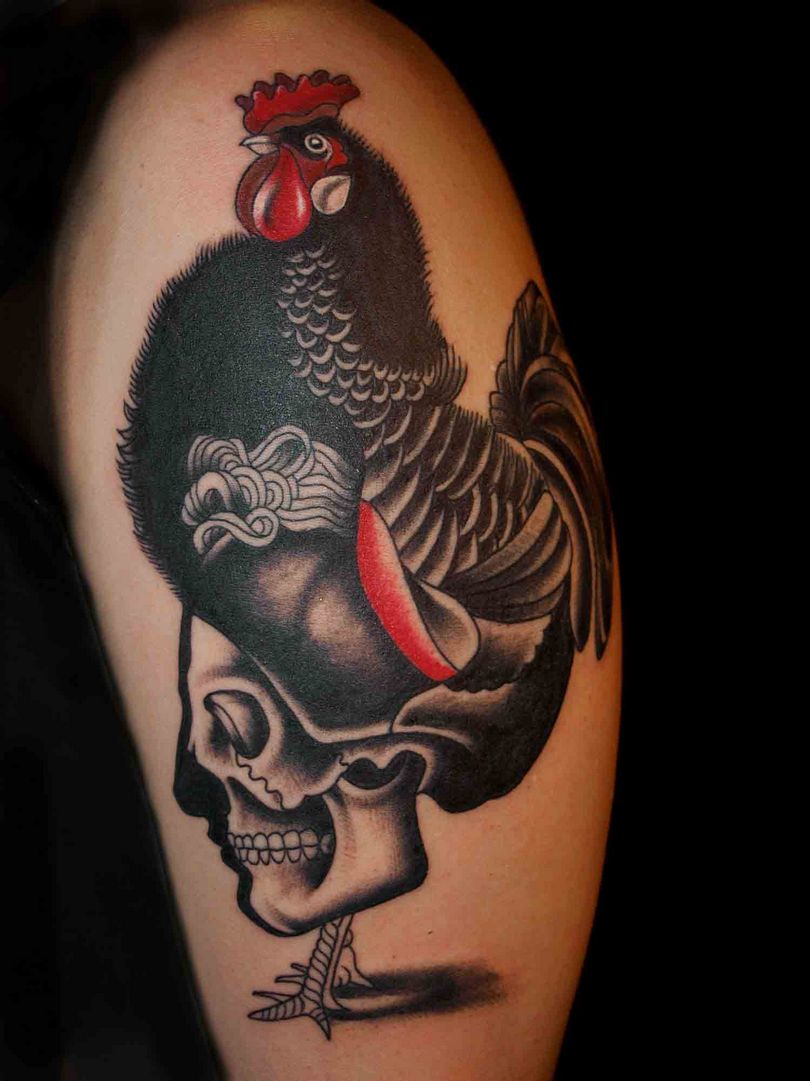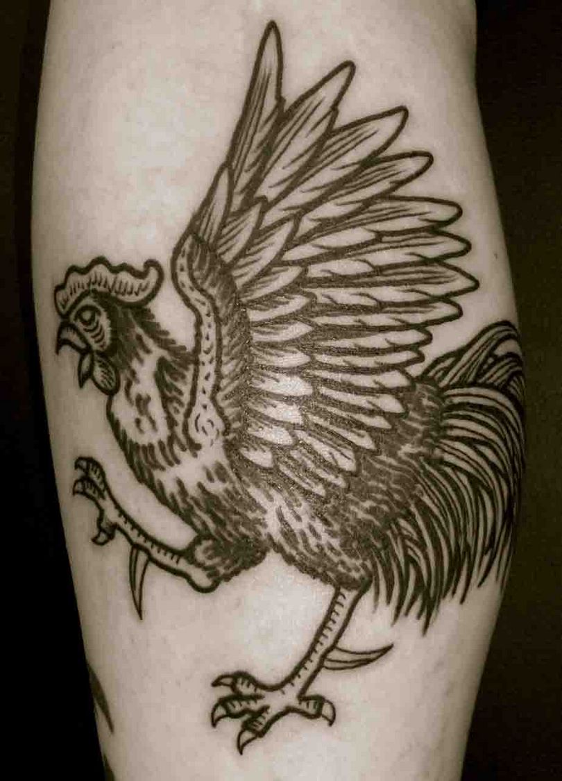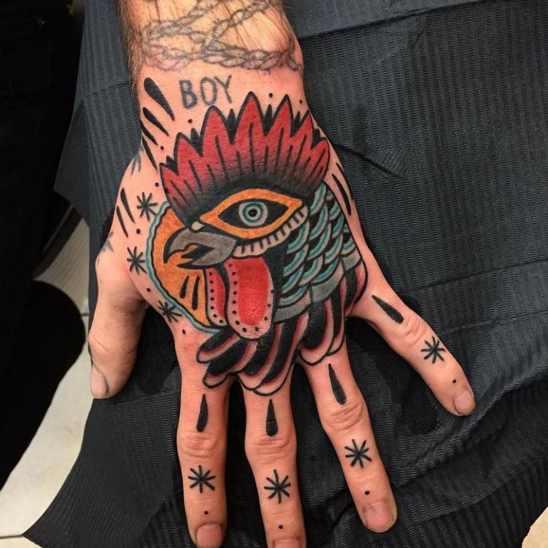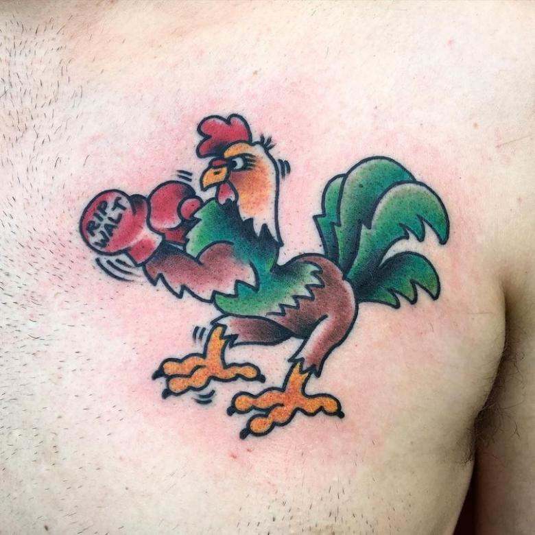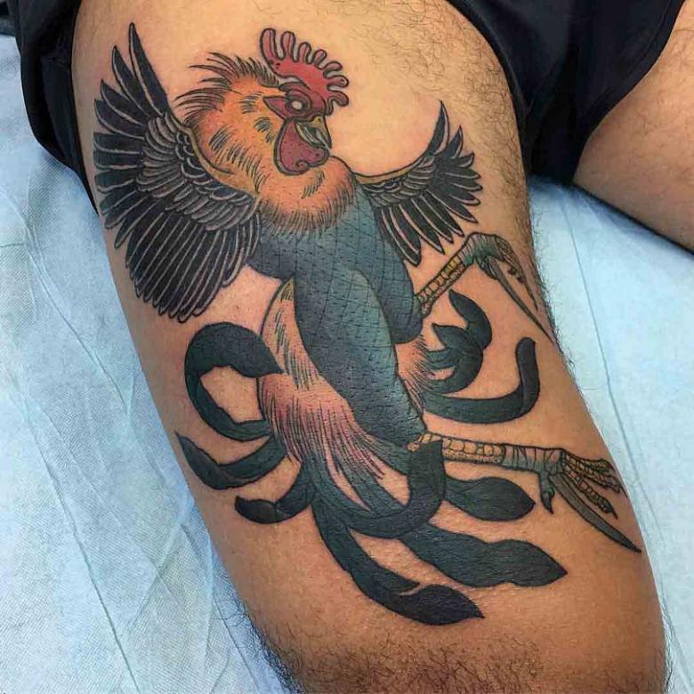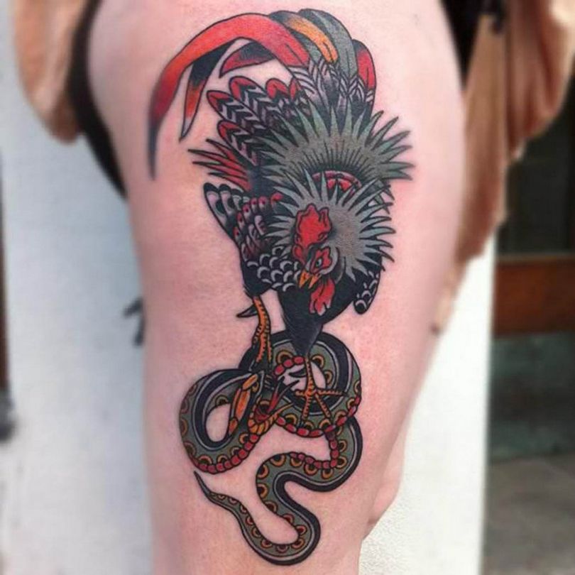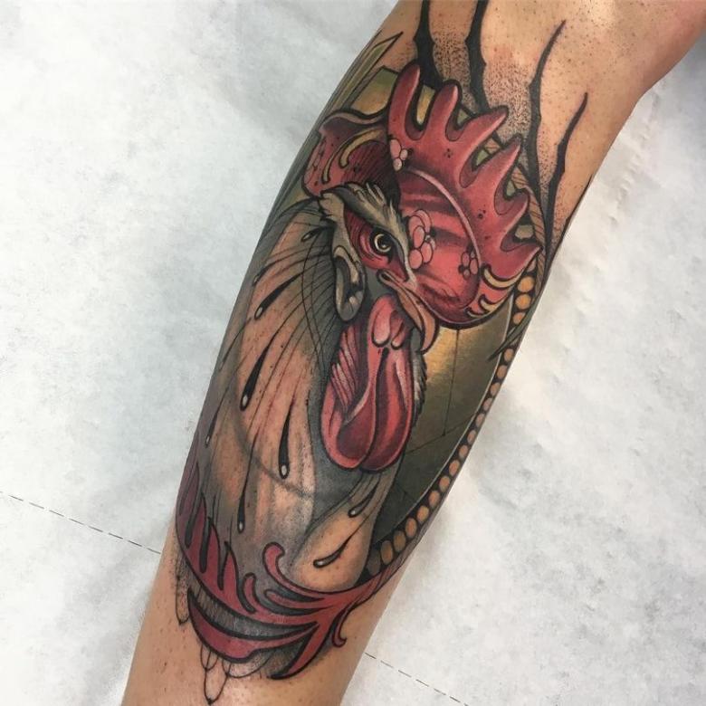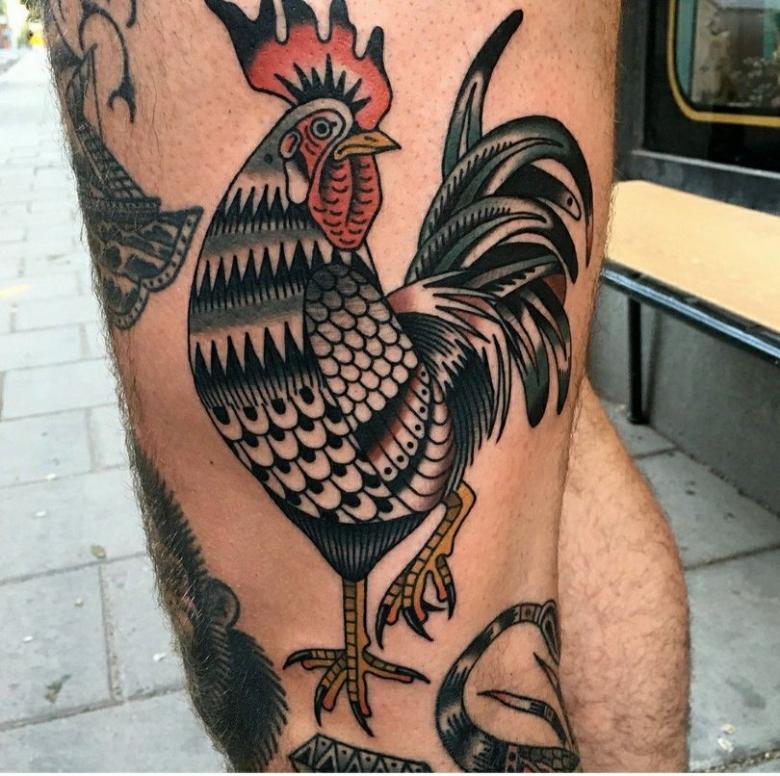 L'oiseau du matin signifie aussi pugnacité. Ce tatouage convient à un homme qui réagit vivement à l'injustice et qui est prêt à se défendre et à défendre ses proches. Mais malgré ces associations positives, le coq symbolise également la démesure, la masculinité et la luxure.
