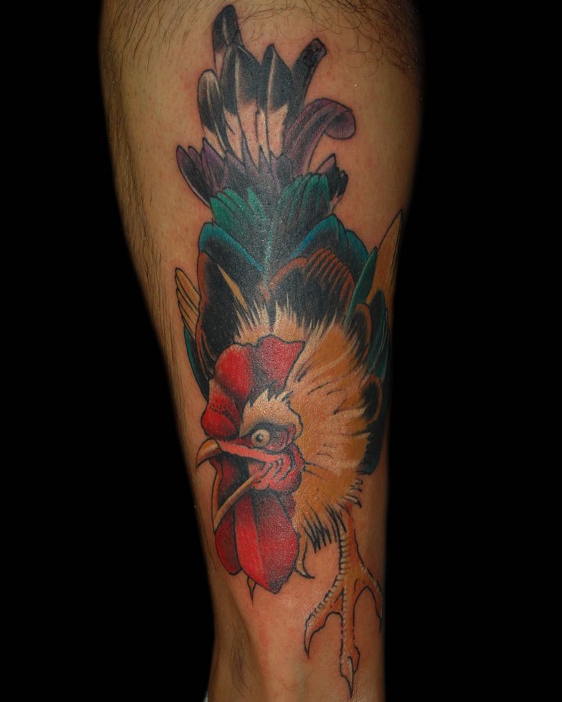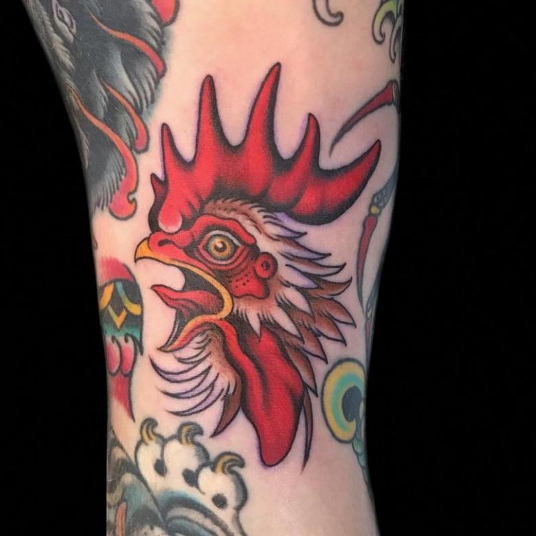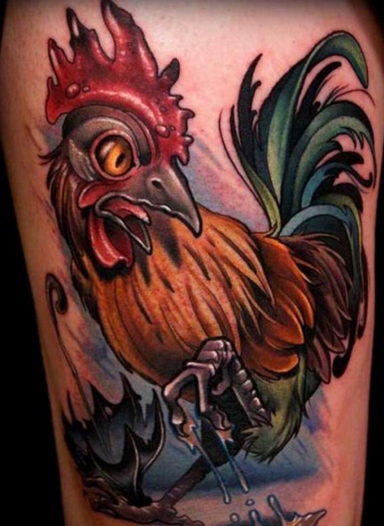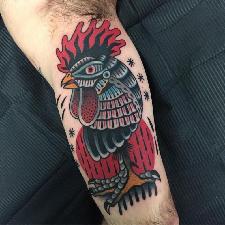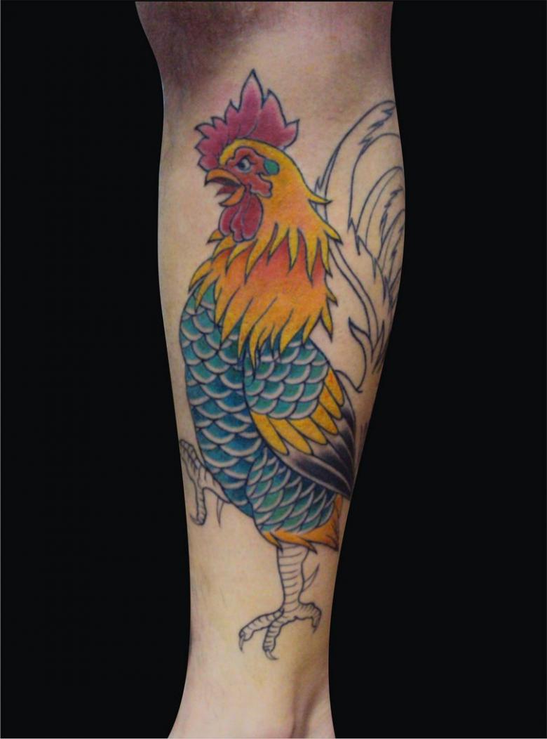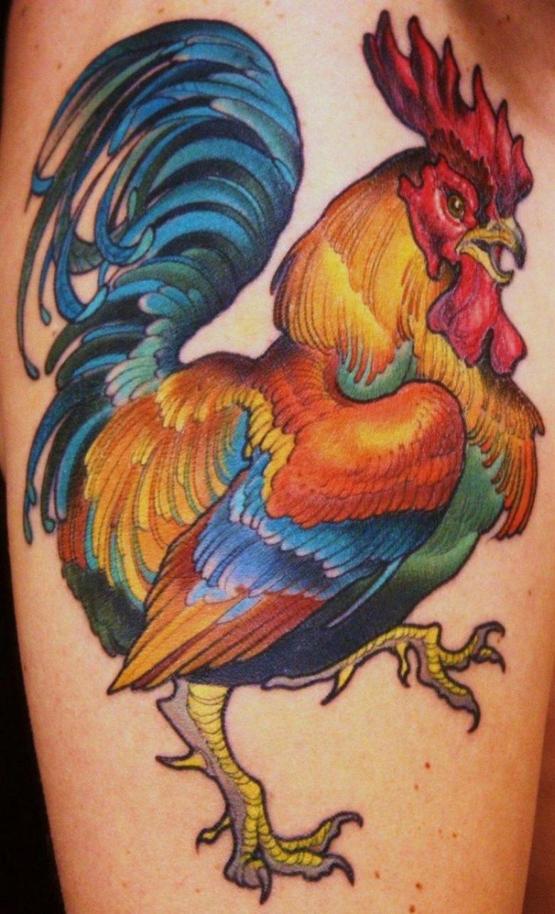 Un coq aux couleurs vives et variées évoque un poseur et un désir de se déguiser et de montrer ses atours. En revanche, un oiseau représenté avec une couleur rouge prédominante protégera son porteur des incendies. En revanche, si la couleur prédominante du tatouage est le blanc, l'homme superstitieux peut se préserver des mauvais esprits et des autres mauvais esprits.