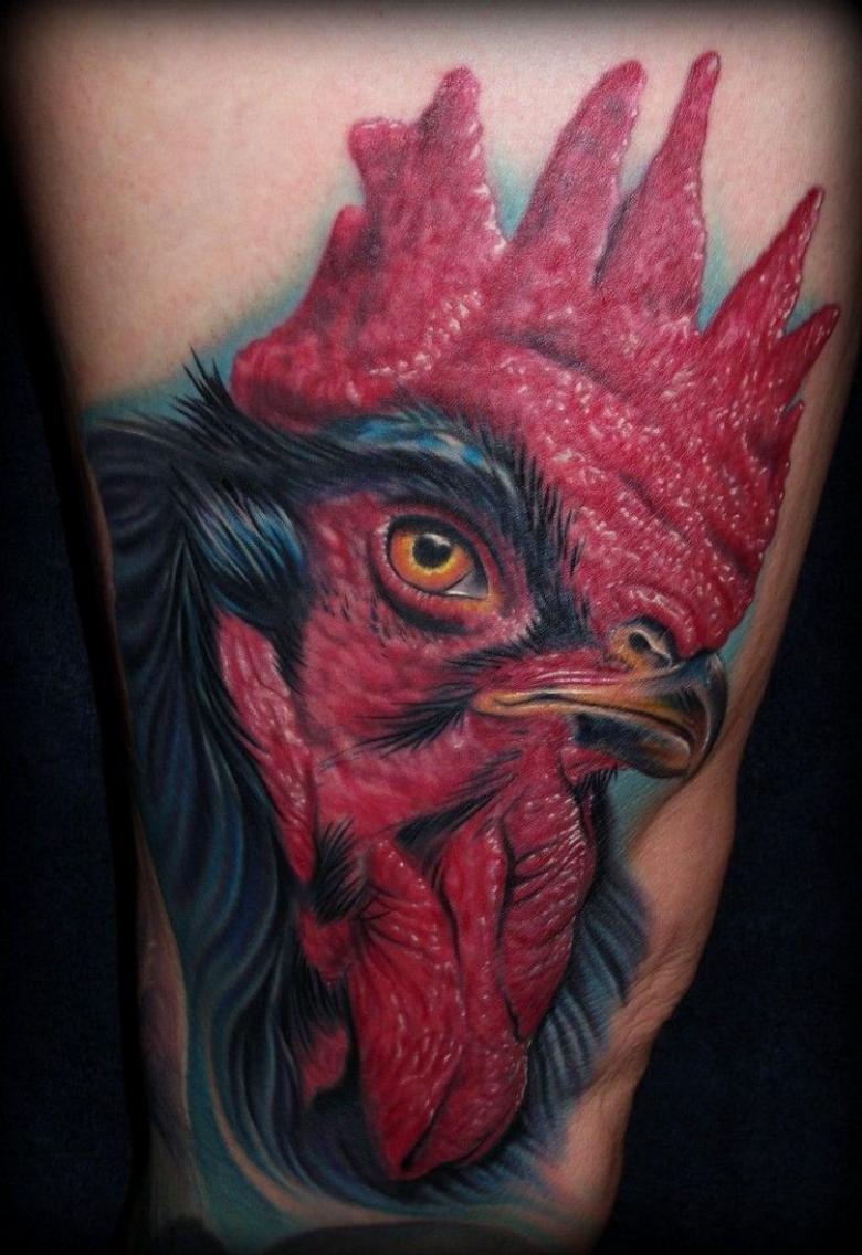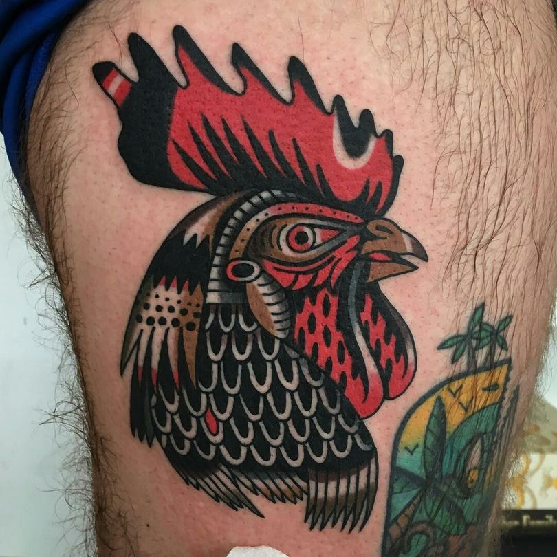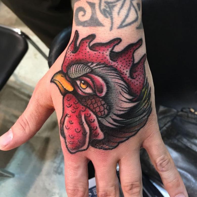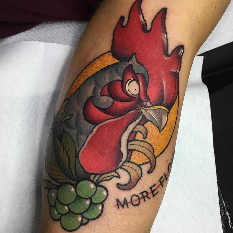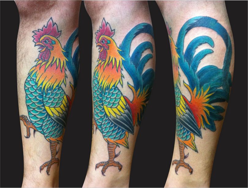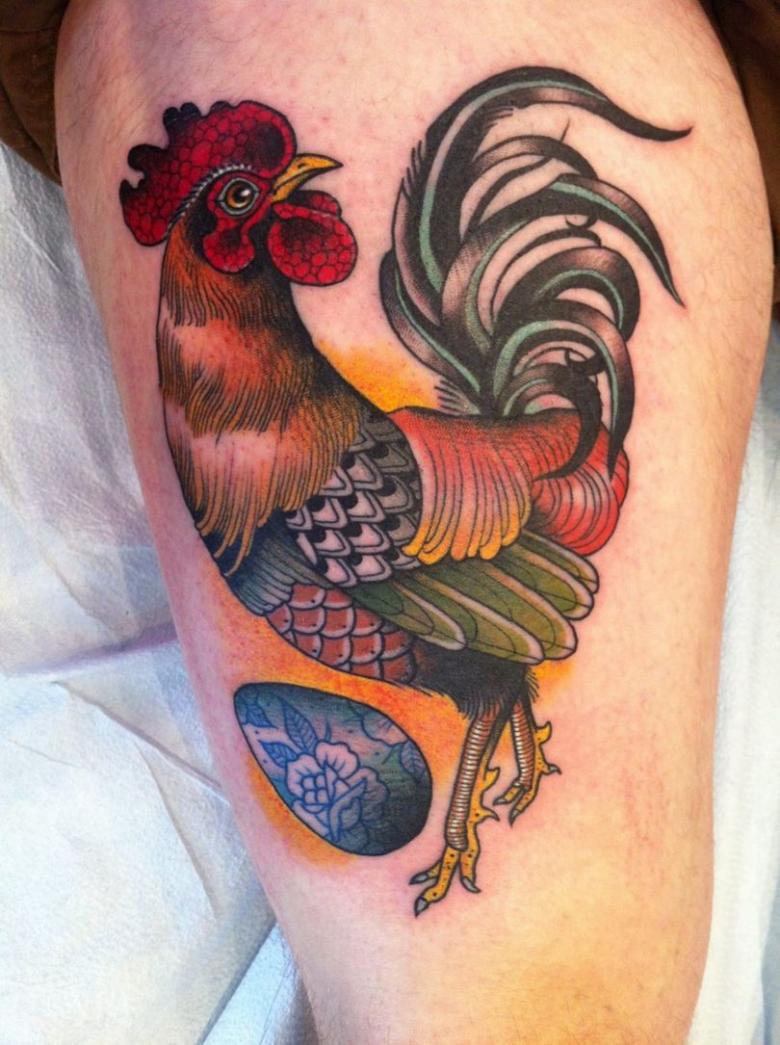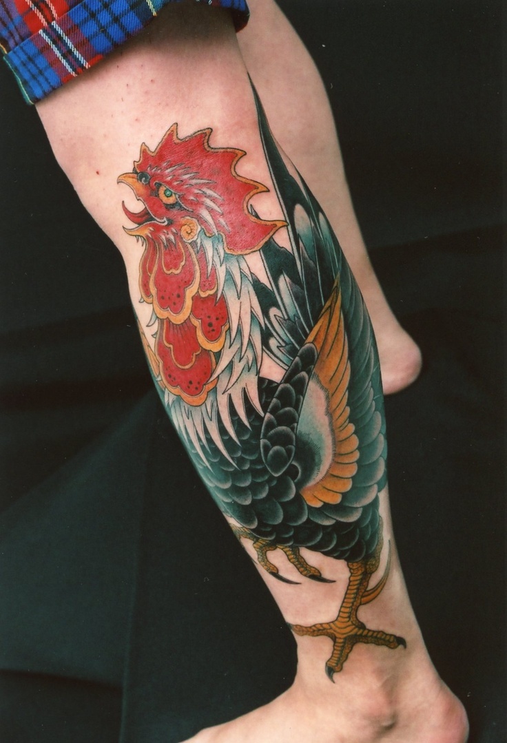 Un coq aux couleurs vives et variées évoque un poseur et un désir de se déguiser et de montrer ses atours. En revanche, un oiseau représenté avec une couleur rouge prédominante protégera son porteur des incendies. En revanche, si la couleur prédominante du tatouage est le blanc, l'homme superstitieux peut se préserver des mauvais esprits et des autres mauvais esprits.