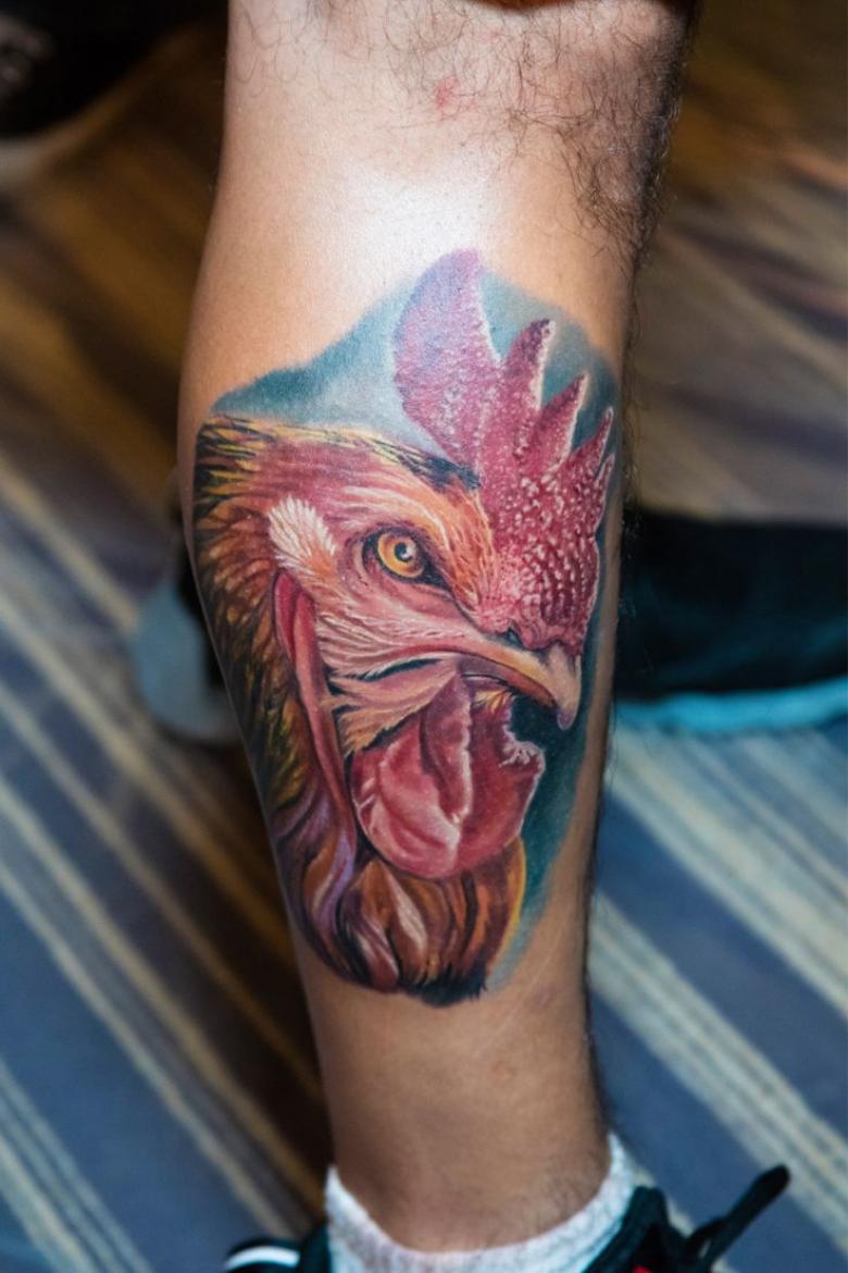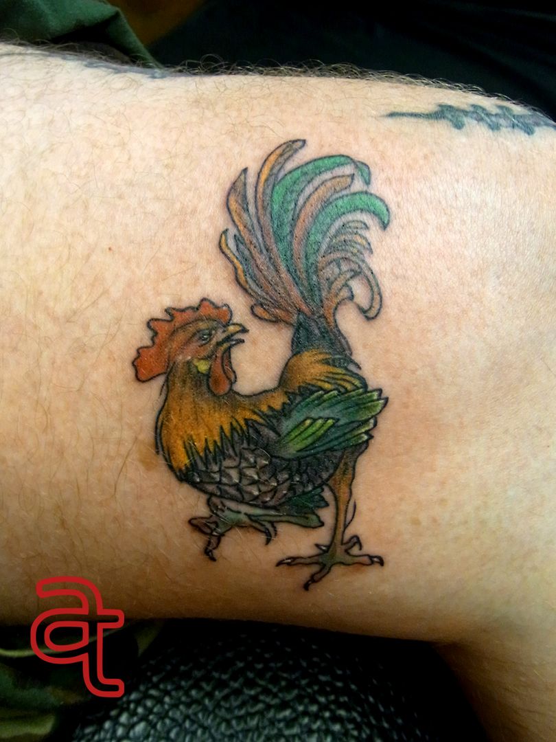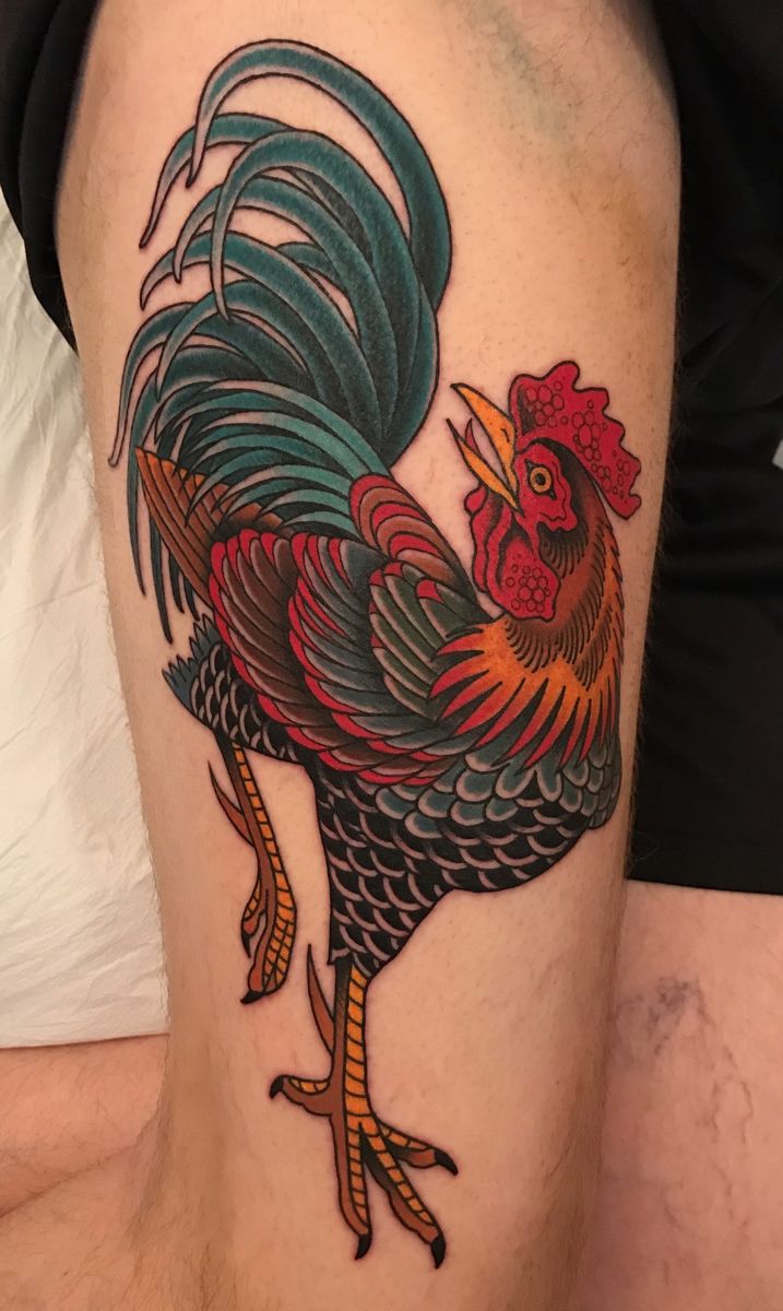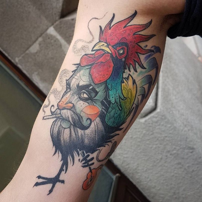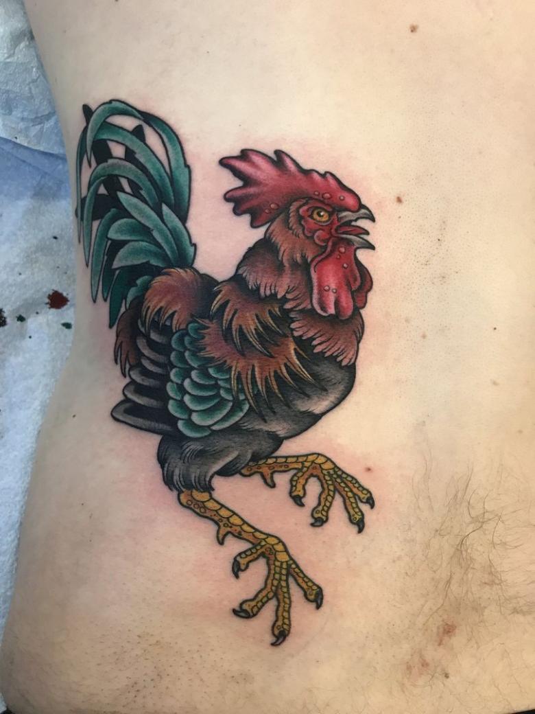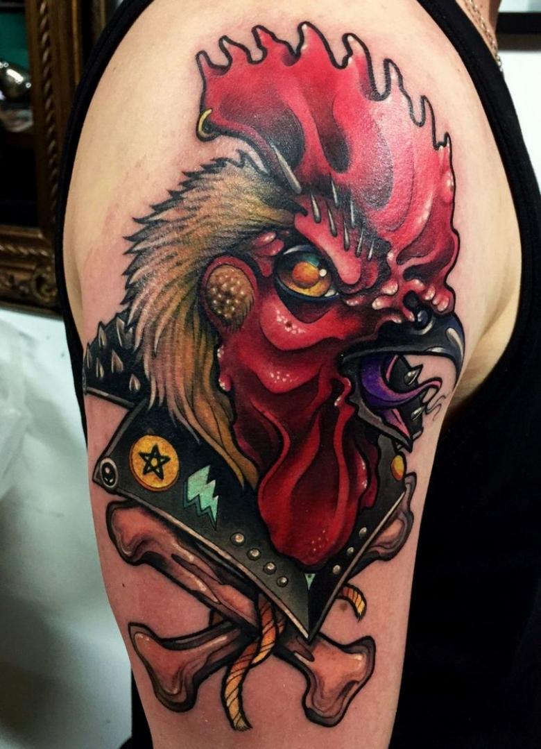 Un coq aux couleurs vives et variées évoque un poseur et un désir de se déguiser et de montrer ses atours. En revanche, un oiseau représenté avec une couleur rouge prédominante protégera son porteur des incendies. En revanche, si la couleur prédominante du tatouage est le blanc, l'homme superstitieux peut se préserver des mauvais esprits et des autres mauvais esprits.
