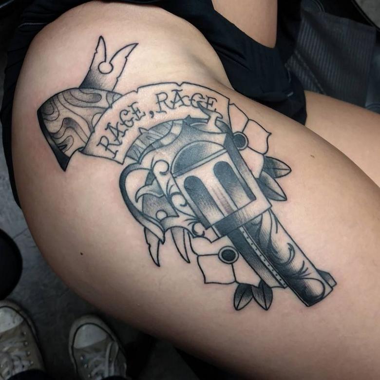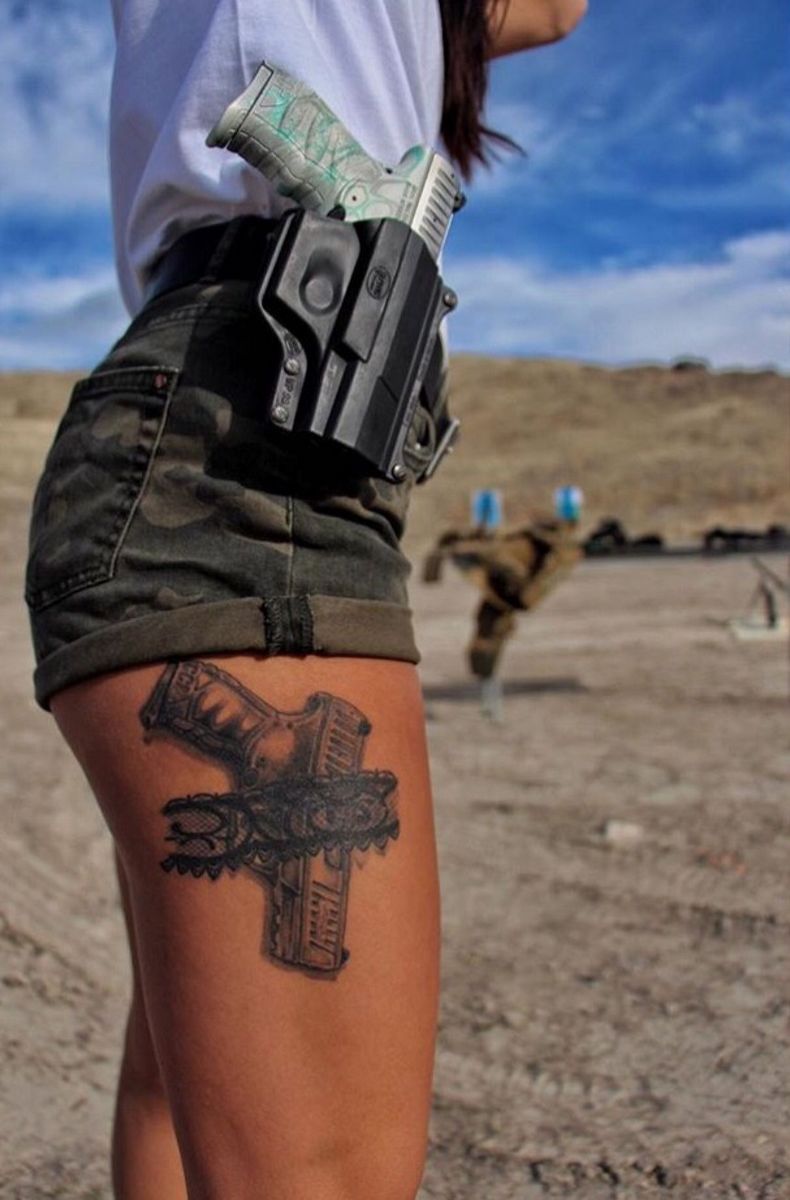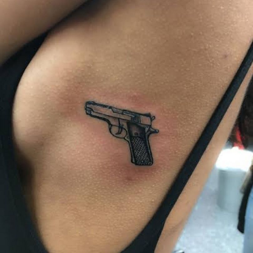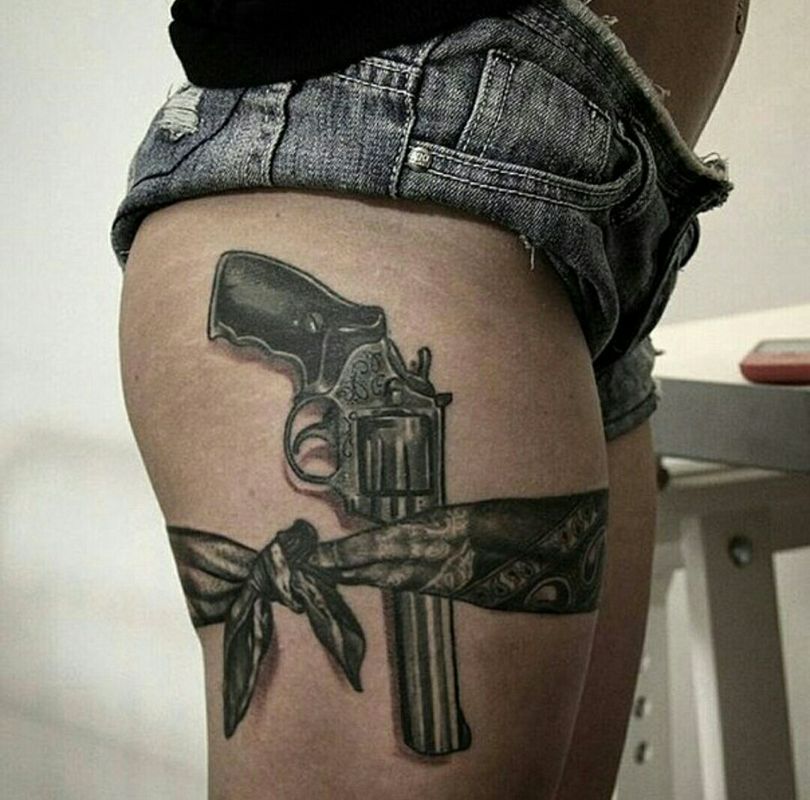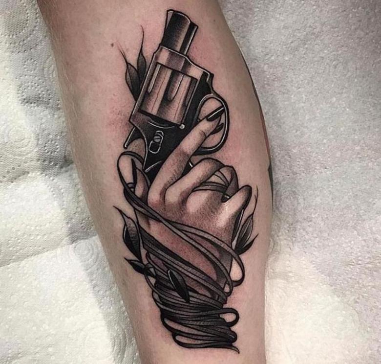 Les filles se font tatouer un pistolet pour mettre en valeur leurs qualités intérieures et les caractéristiques de leur nature. Les personnes ayant ce motif ont un caractère audacieux, aiment les divertissements non conventionnels, elles sont attirées par le danger. Ils sont également très sûrs d'eux, indépendants et déterminés.
