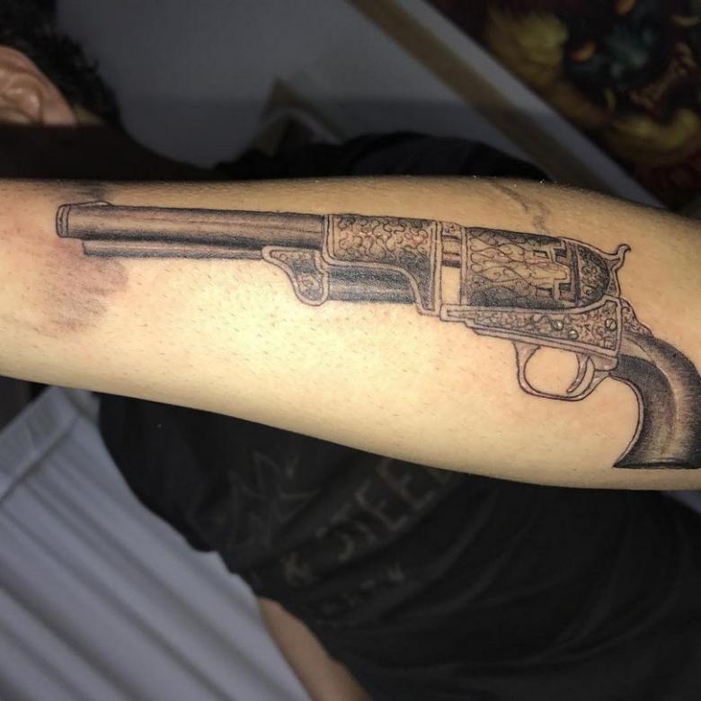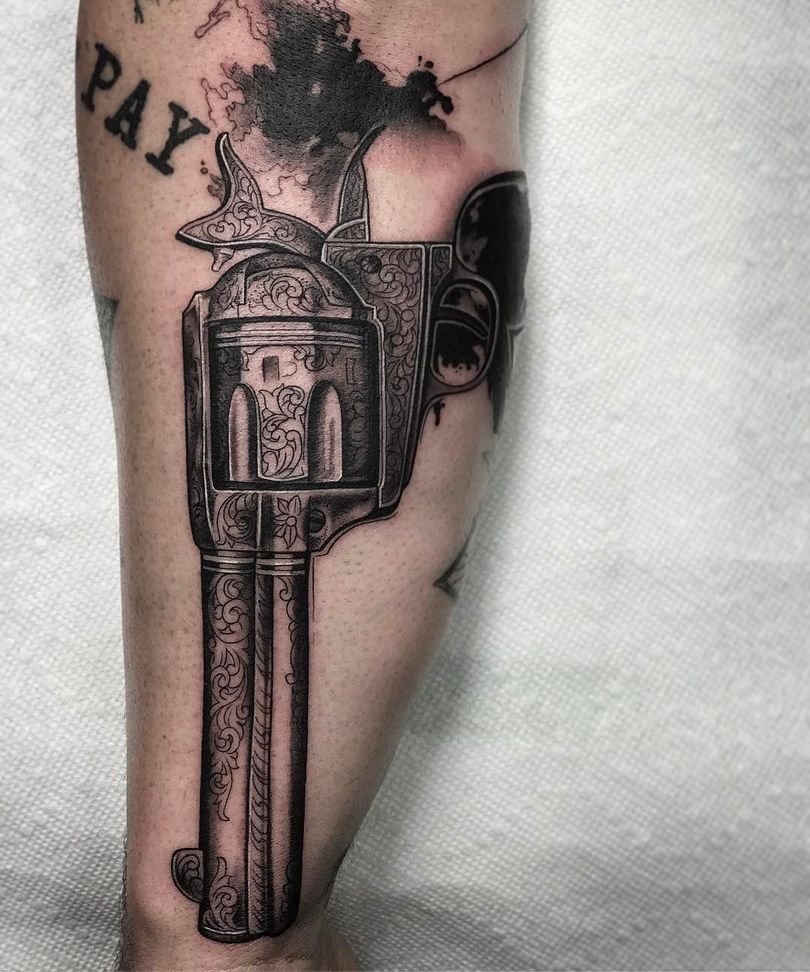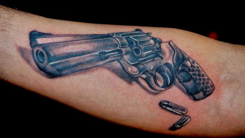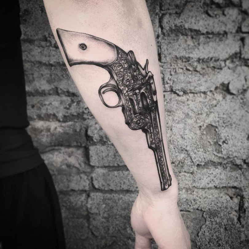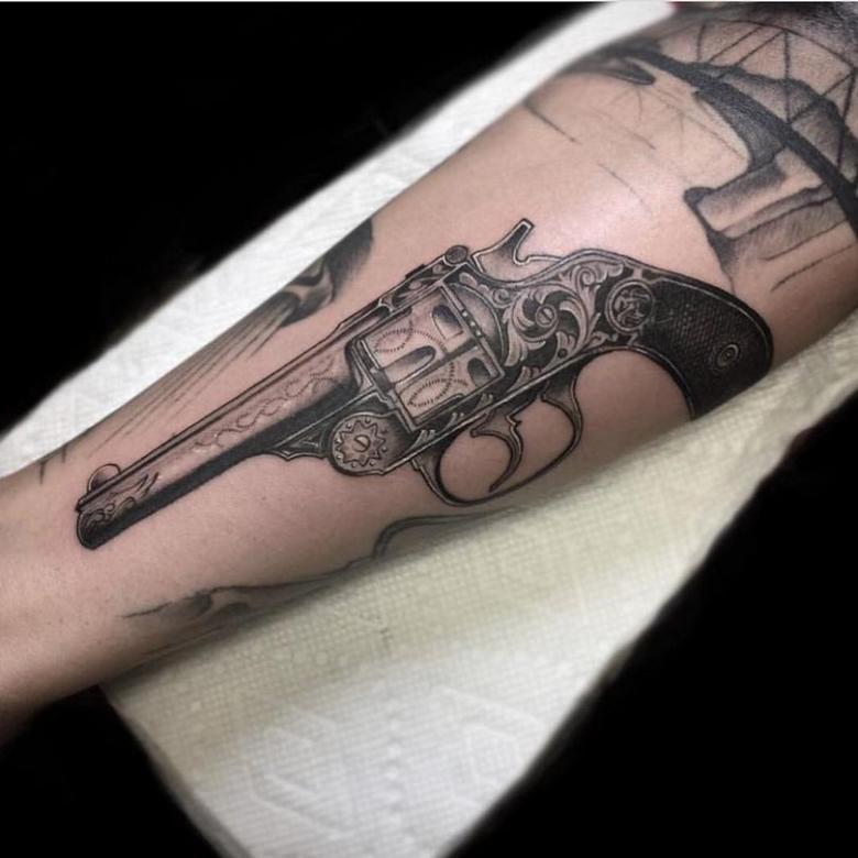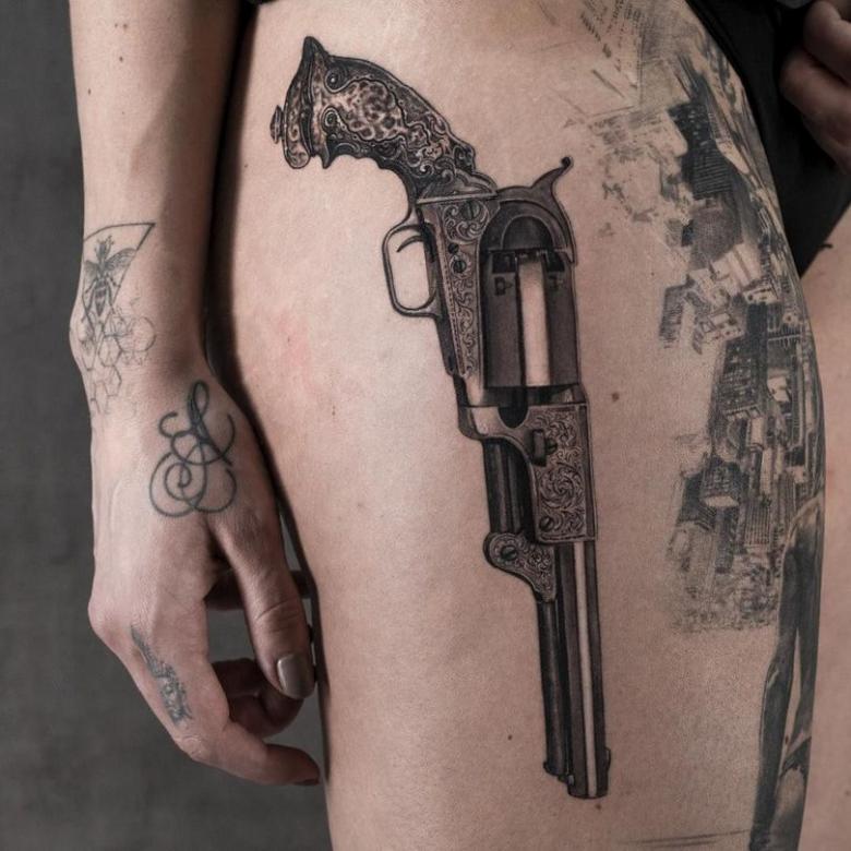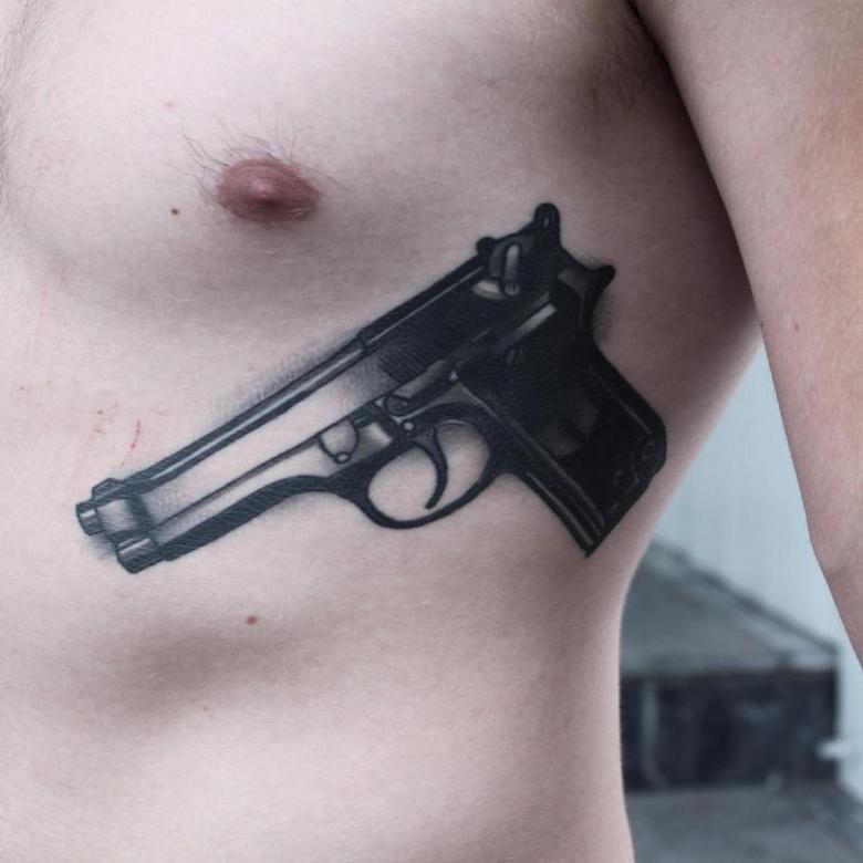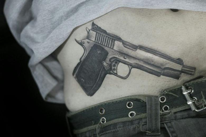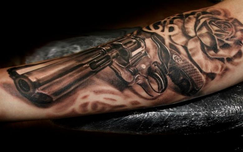 Les hommes ont tendance à opter pour une palette monochromatique pour un futur tatouage. L'arme est tatouée dans un style réaliste.