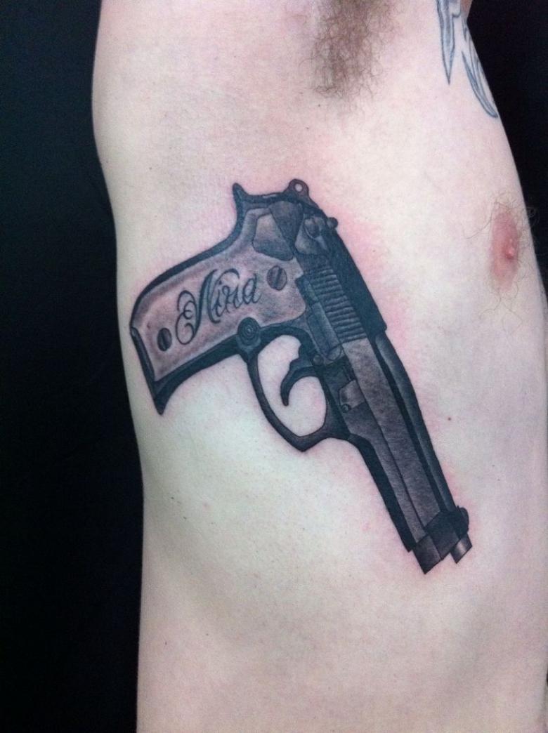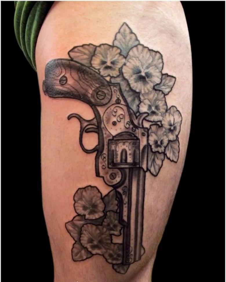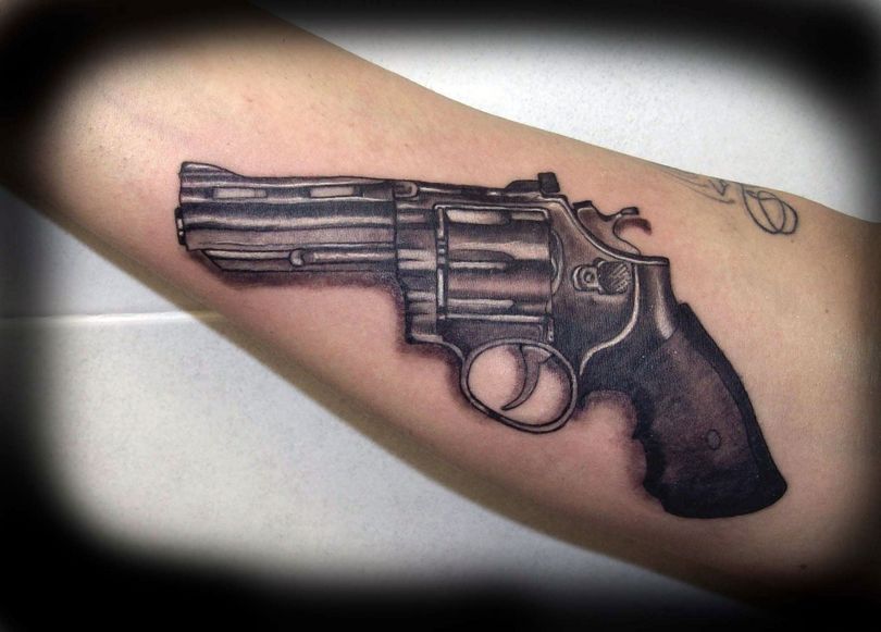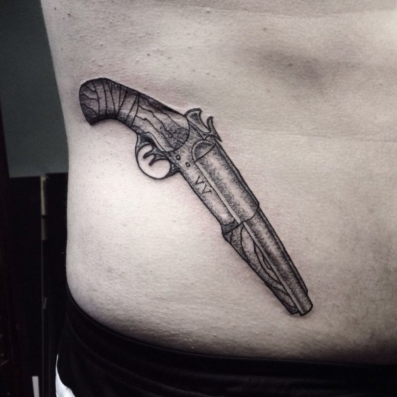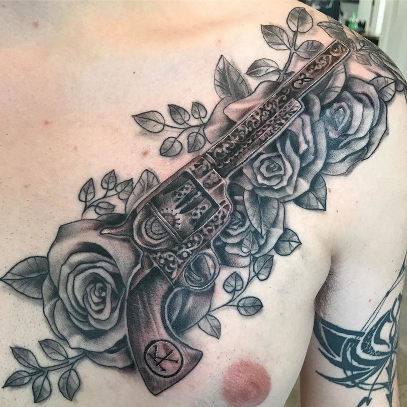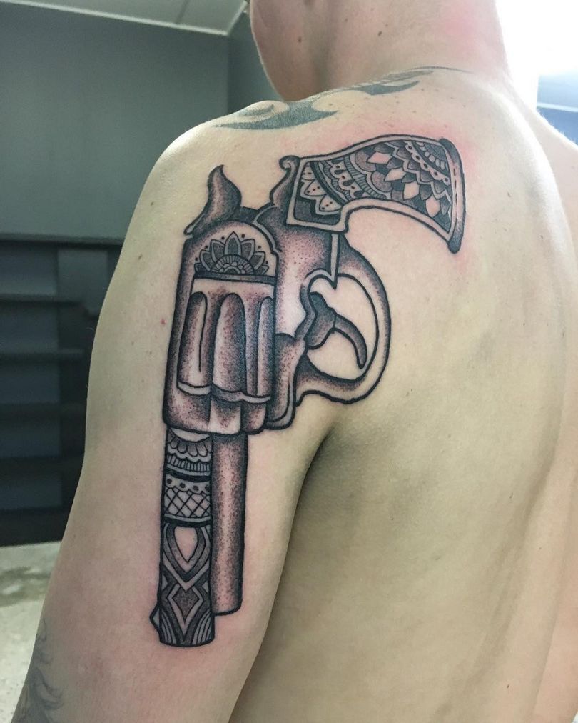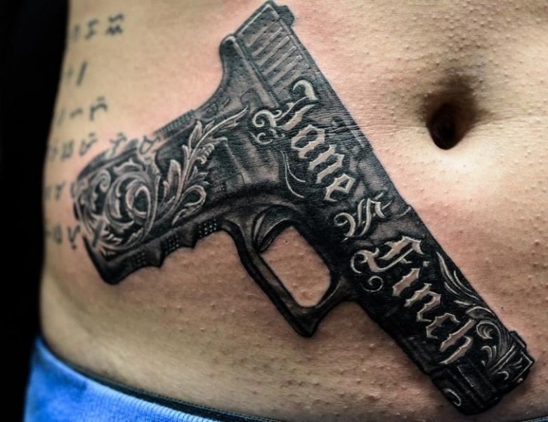Les hommes ont tendance à opter pour une palette monochromatique pour un futur tatouage. L'arme est tatouée dans un style réaliste.