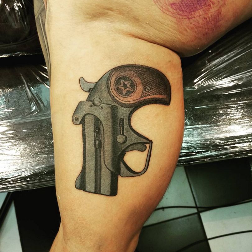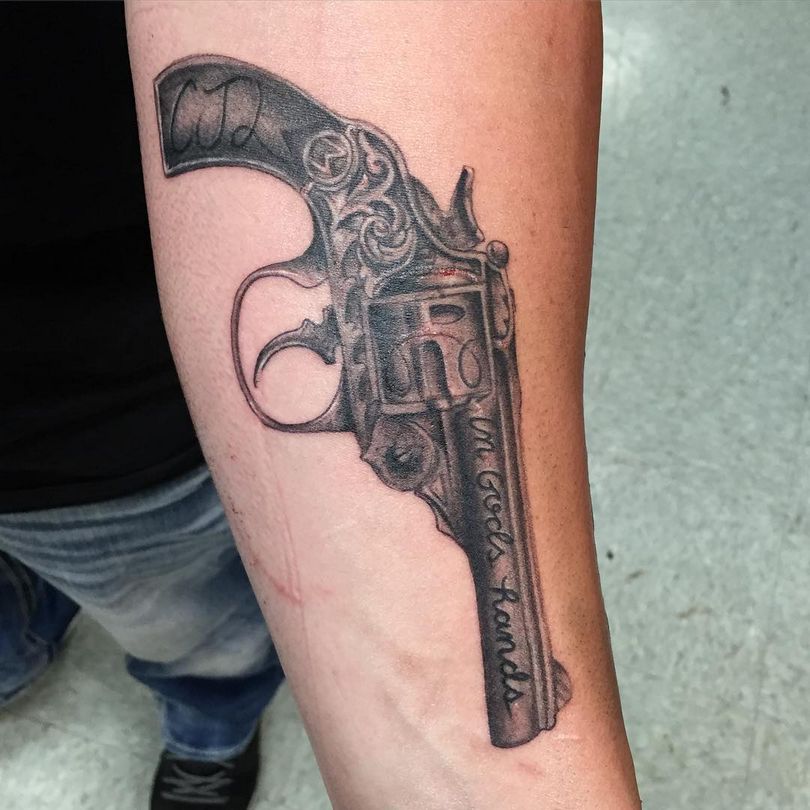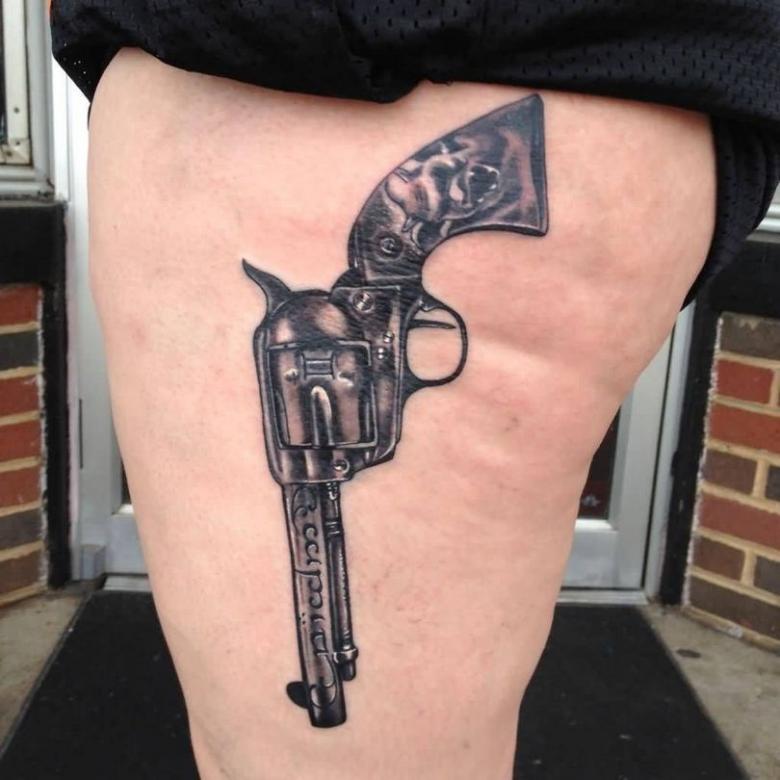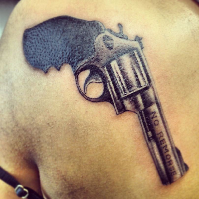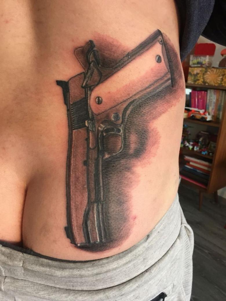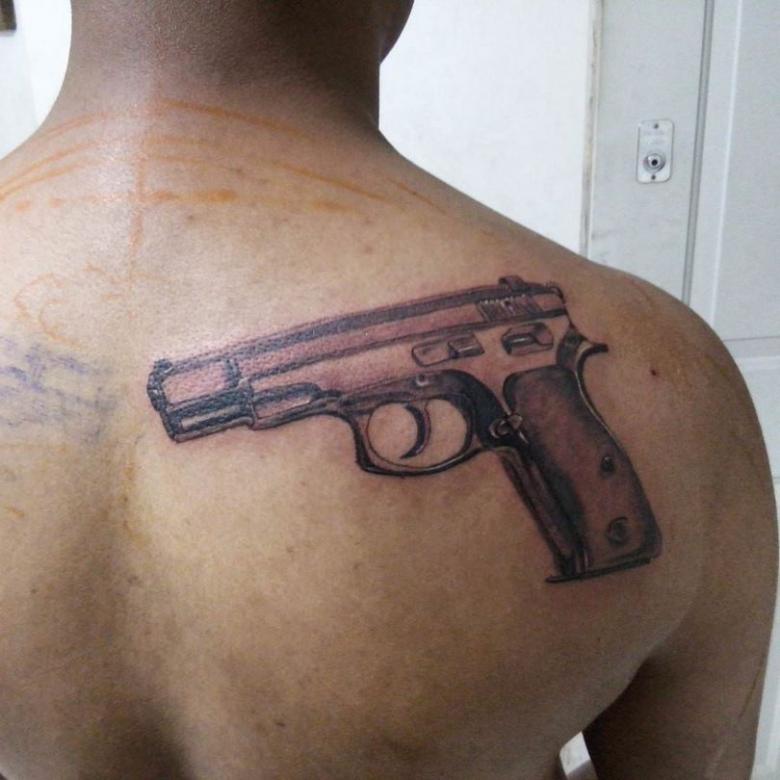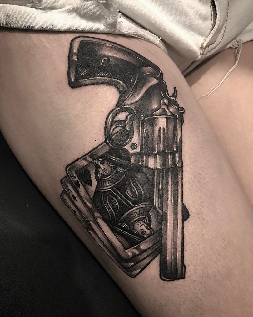 Les hommes ont tendance à opter pour une palette monochromatique pour un futur tatouage. L'arme est tatouée dans un style réaliste.